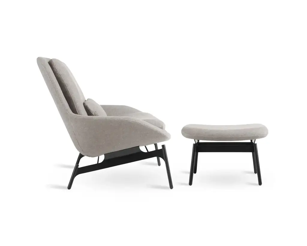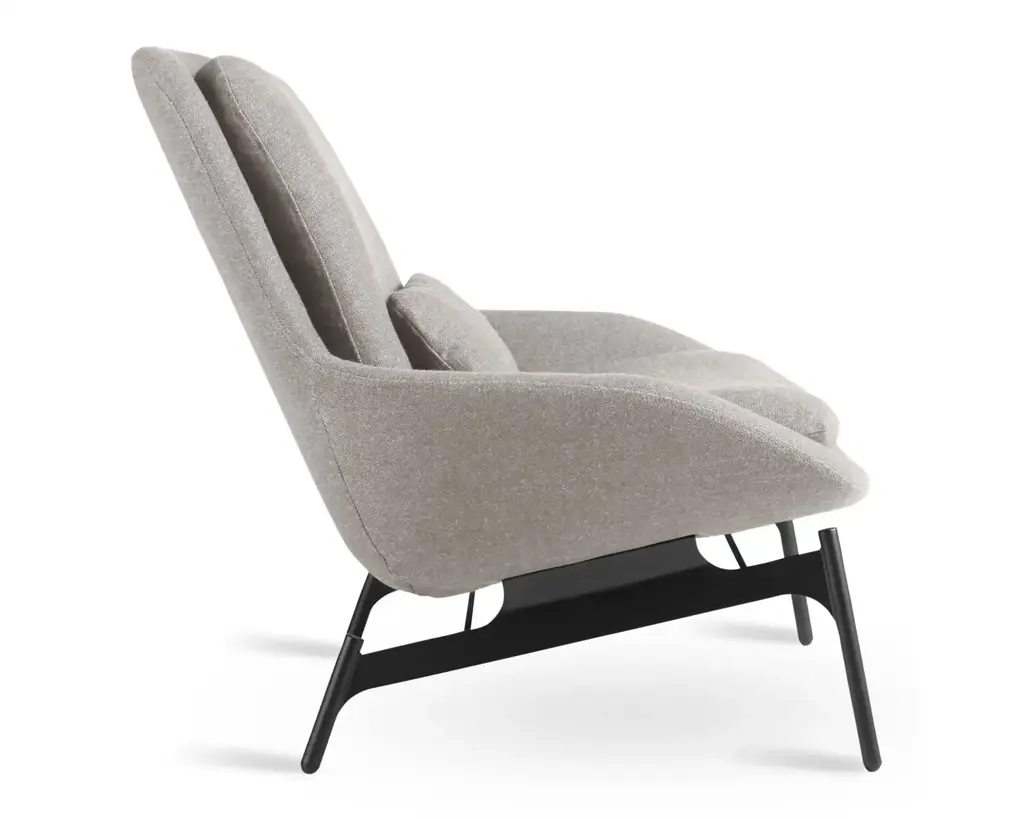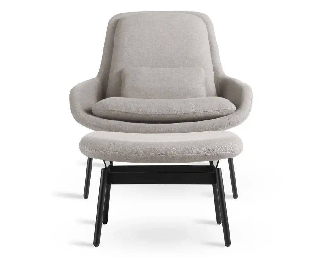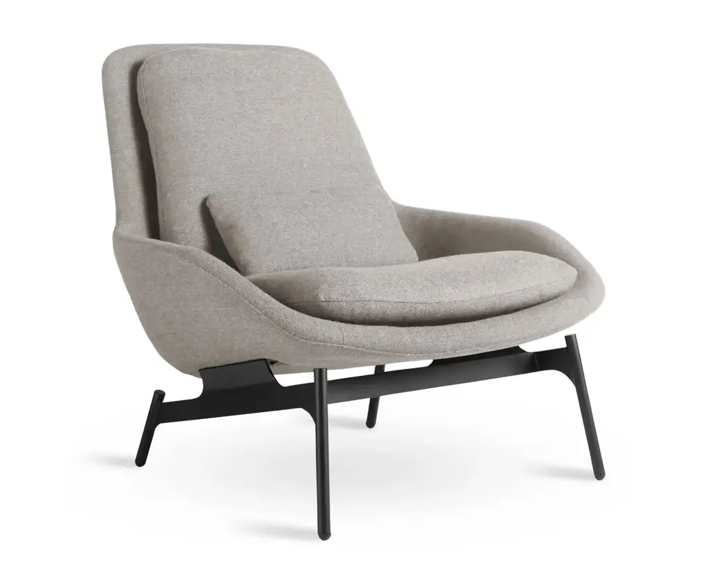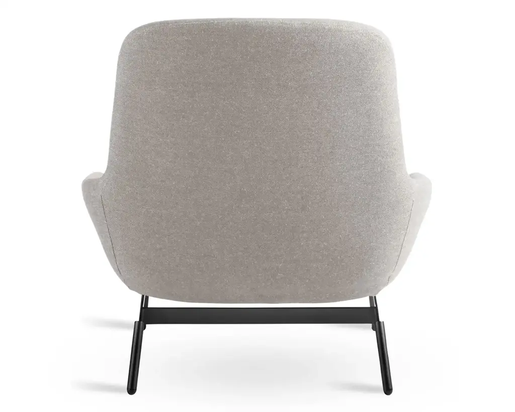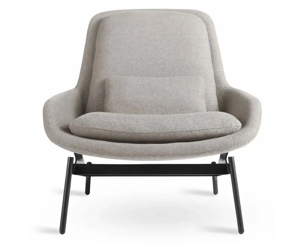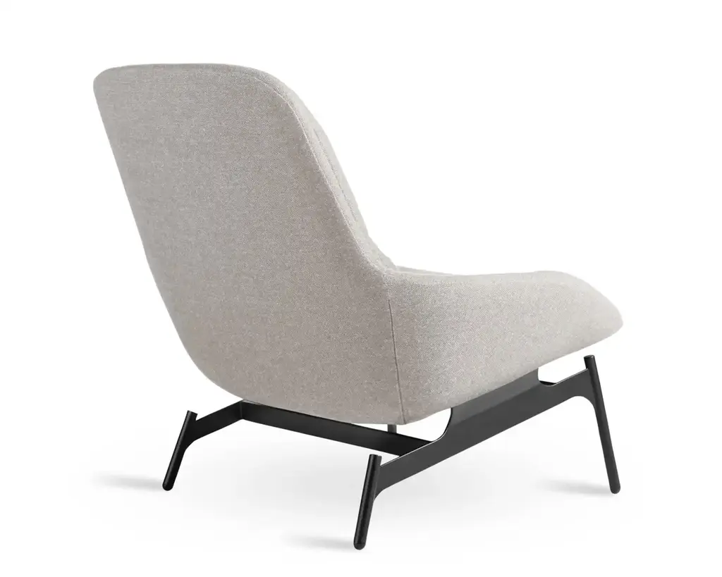 Shapely curves, a gentle recline and “just-right” cushions invite the lost art of unwinding. A sculptural powder-coated steel base sets up the striking profile.