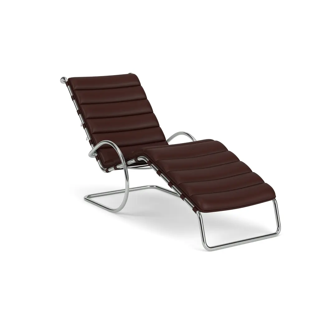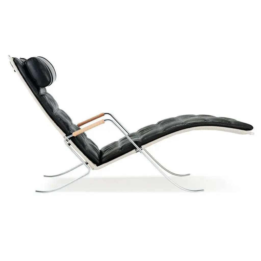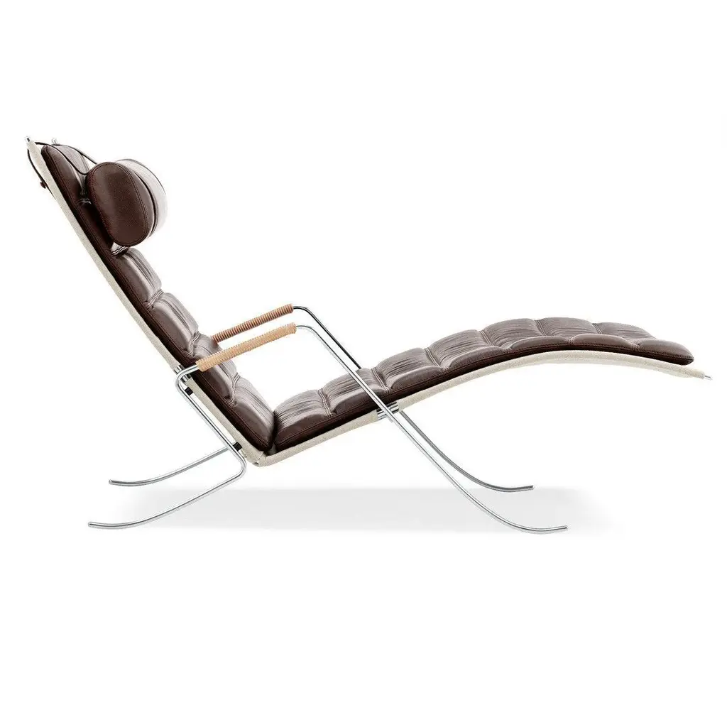 Chaise long in canvas with loose cushions and neck support in analin leather. Frame in chrome-plated steel. Leather available in black, natural, dark brown, cognac. FK 87 Grasshopper chair is designed by Preben Fabricius & Jorgen Kastholm in 1968 and original produced by Kill International Germany. Lange Production is proud to have the exclusive rights to resume production of this unique furniture, which is timeless yet captures the spirit of the age. Furniture where design, quality and function form a synthesis. The furniture is produced at the same factory and with the same tools used in the 1960s to make the original furniture. The entire production is carried out in close collaboration between Lange Production and Jorgen Kastholm.