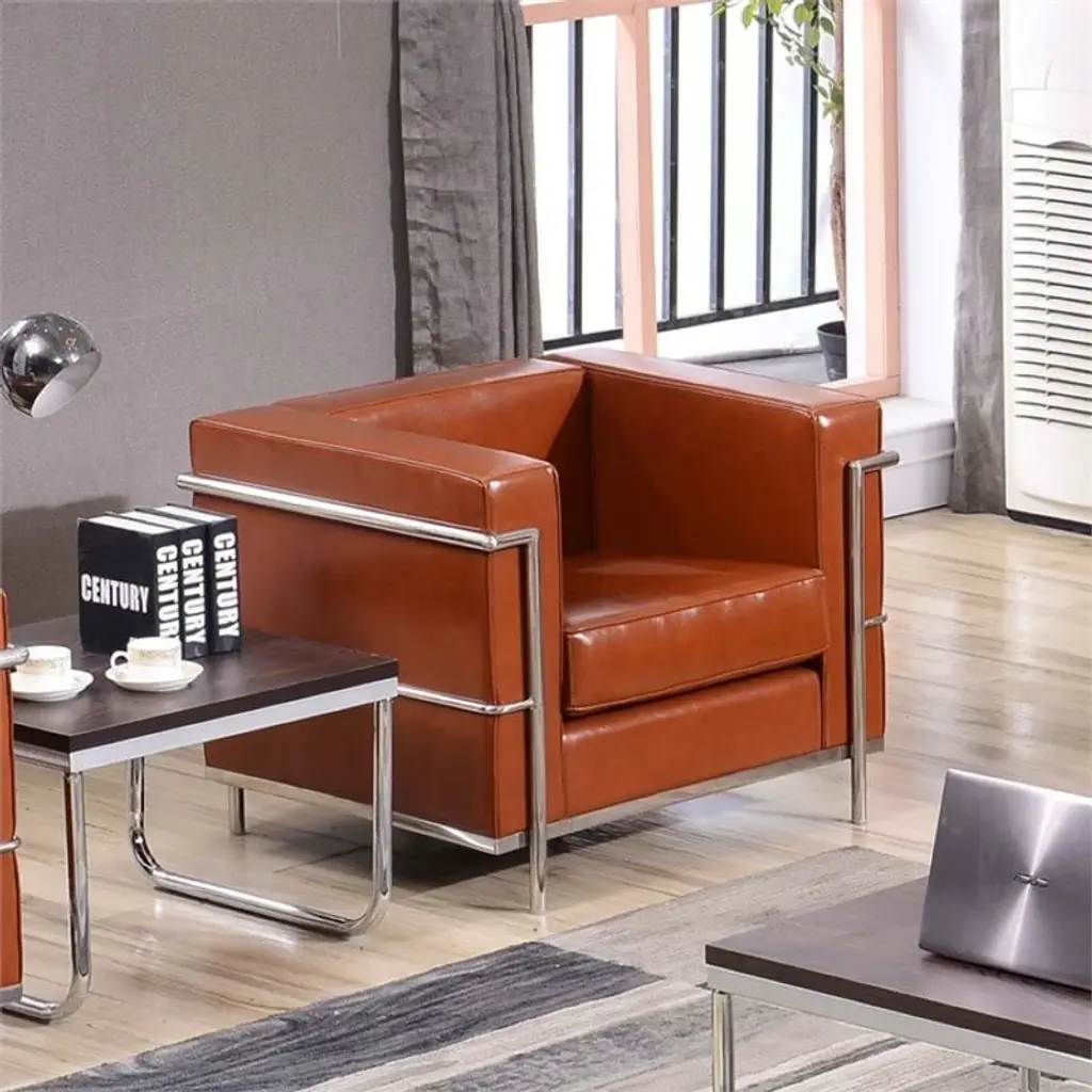 Your office reception space speaks to who your are as a company and this cognac LeatherSoft upholstered chair with encasing frame makes quite a statement. This trendsetting piece features a straight arm design and a removable square seat cushion, all padded with 5" of foam for exceptional comfort. LeatherSoft is leather and polyurethane for added softness and durability. A stainless steel frame, accent bar enclosure and integrated legs give this chair added strength and a distinctive flair. Make a great impression on your clients, customers, and guests with this innovative contemporary chair. This progressive style chair brings comfort and trend-setting style to your waiting room, reception area or home.Features:Finish: CognacContemporary Style Chair for Office, Waiting Room or HomeCognac LeatherSoft UpholsteryTrack ArmsTaut Back and SeatRemovable Seat CushionFoam Filled CushionsCAL 117 Fire Retardant FoamExposed Accent BarIntegrated Stainless Steel FrameLeatherSoft is leather and polyurethane for added Softness and DurabilitySpecifications:Product Dimensions: 27.5" H x 35" W x 28.5" DProduct Weight: 57 lbsSeat Dimensions: 17" H x 22" W x 21.25" DBack Dimensions: 11.5" H x 22" WArm Height: 27.5" H from floor; 11.5" H from seat