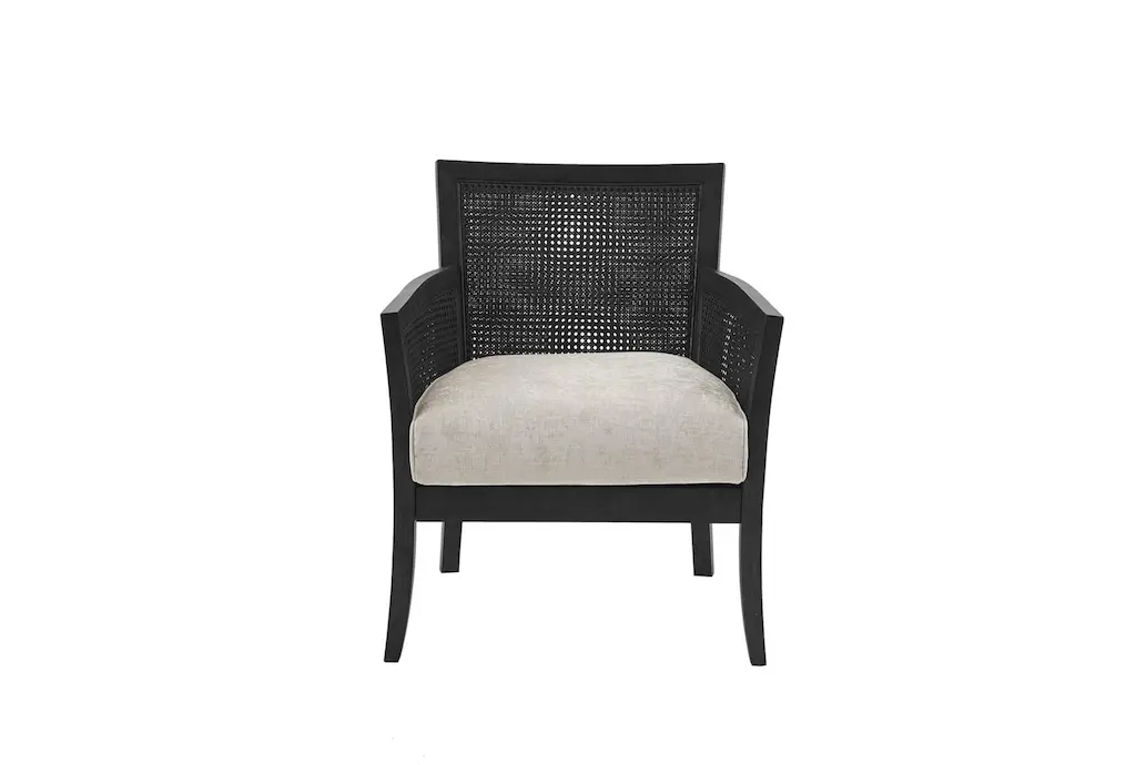 This exquisite Fleming Black Cane Accent Chair is the perfect addition to any traditional living room. With arms for added comfort and a beautiful wood material, it exudes elegance and sophistication. This design is the perfect bedroom chair, reading chair, club chair or accent chair for living room.