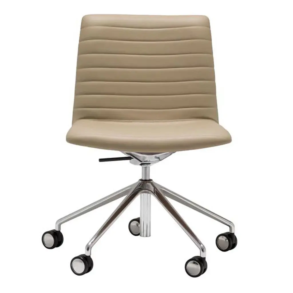 Low back chair with upholstered shell and height adjustable central swivel base with 5 casters and self-return finished in polished aluminum, white or black. Additional options include: parallel upholstery stitching, tilt mechanism and back finished in walnut veneer. Height Increase: 32.75-36.75 inches. Seat Height 17.25-21.25 inches. The Flex family of seating has evolved with the addition of the new collection Flex Executive. This collection consists of conference chairs and armchairs that are available in three backrest versions: low, intermediate, and high. Additionally, two versions of lounge chairs, with two distinct backrest heights, complete the collection. Additional options include back finished in walnut veneer.