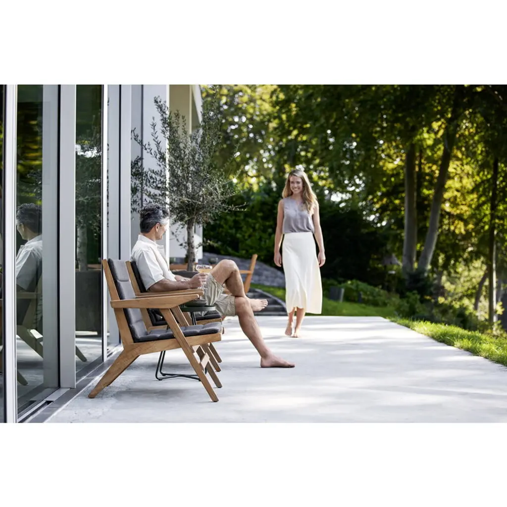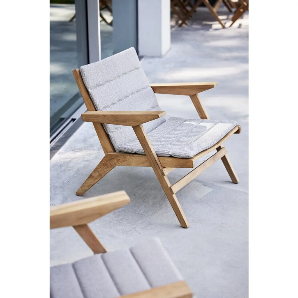 Cane-line’s Flip lounge chair, designed by the Danish duo Strand+Hvass, is a teak wood patio chair with a sculptural design and distinctive seat slightly bent in the middle. Thanks to the folding backrest, you can easily adjust the seat angle to your liking. Cane-line’s Flip patio collection is made using the finest teak wood, an ideal material for outdoor use. The Flip series is characterized by a unique design featuring skillfully joined teak slats in various widths. The sustainably produced, certified teak has a beautiful golden brown color that will develop a silver-gray patina over time. With regular oil treatment, you can maintain the color closer to the original.