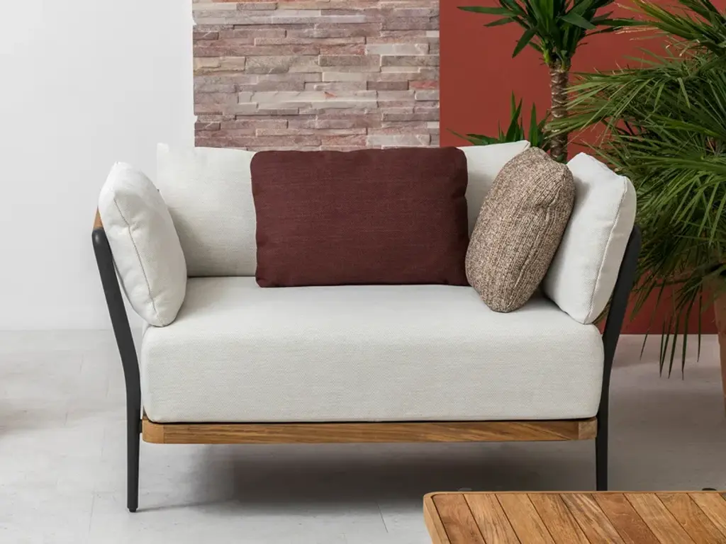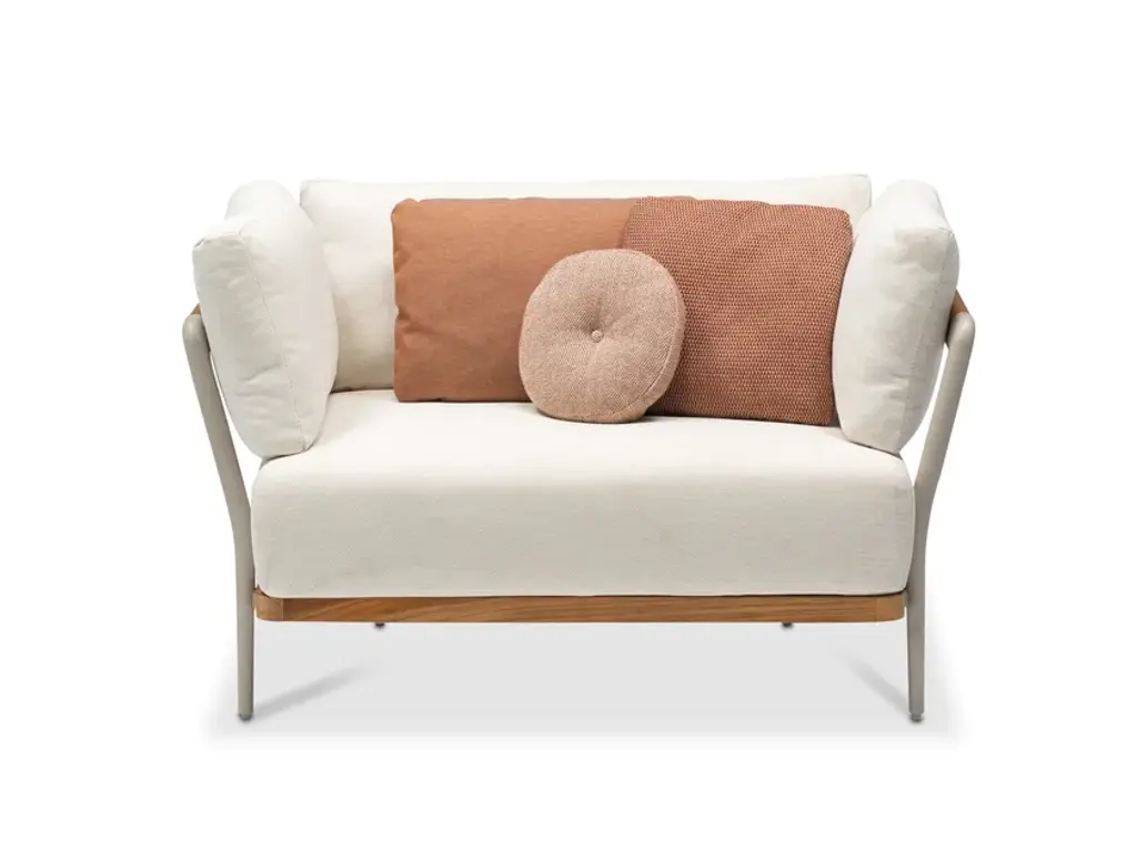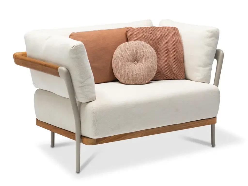 Flows is a fabric armchair.Cushion set includes:1x Flows deep seat cushion1x Flows back cushion medium2x Flows deep arm cushion1x Turo throw pillow D1 47x37 rectangular1x Turo throw pillow D2 40x40 square Flows unites a world of contrasts: limber yet strong, this collection features a light, elegant aluminium frame combined with the warmth of a handcrafted wood finish. Flows carefully balances old and new to give the pieces their defining characteristics. The unique shape of the oval legs turns the Flows sofa into a one-of-a-kind piece of furniture destined for long-lasting appreciation.Created in collaboration with Milanese design studio Metrica, Flows fuses traditional aesthetics with modern elements to evoke an atmosphere of nostalgia and lightness. The concept of Flows is about connecting wood and aluminium and the different feelings both materials evoke. While the elegant metal casting creates a strong and sober foundation for the design, the wood evokes feelings of comfort and warmth. Flows will be available in two versions: teak natural and teak nero. Both can be combined with soft cushions in warm colour combinations.At its most basic, Flows is a suspended sofa solution that consists of modular as well as fixed elements. The main components are the aluminium cast legs. On the upper level of the sofa, these connect with a solid wood profile that serves as an armrest and a support for the back cushions. On the lower portion, the legs are attached to a structural platform covered in wood. The wood of the platform cover, arms and backrest share the same finish.The aluminium legs, which give character and lightness to the entire structure, are characterised by a unique design. Robin Rizzini, chief designer & partner at Metrica: “Instead of choosing a standard cylindrical shape, we opted for an exclusive form that is crucial to the overall feel of the Flows sofa. Starting out as cylindric shape, the legs gradually change into rounded triangles that eventually shift into an oval shape to connect to the backrest. Flows's teak nero version adds an extra touch of luxury thanks to the additional manual craftsmanship it requires. The teak wood is sanded, brushed and treated by hand using a special technique that supports the structure and creates an eyecatching alternation between shiny and matt black surfaces. As a result, the black hues radiate just the right amount of elegance, drama and power, perfectly balancing indulgence and sophistication.As its name implies, Flows offers multiple configuration options and infinite setting possibilities. The core concept consists of either a 2- or a 3-seater sofa or an armchair. Different modules – chaises, corners ecc