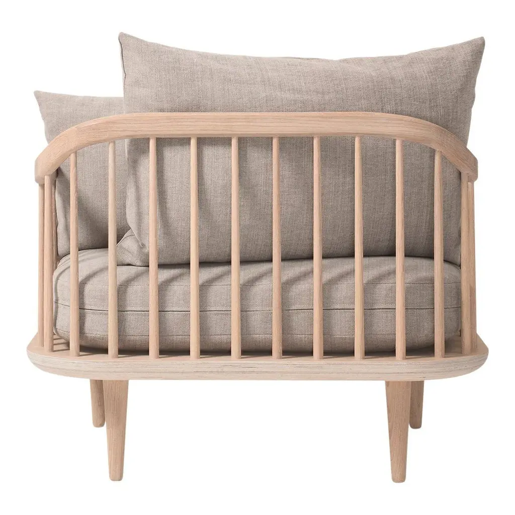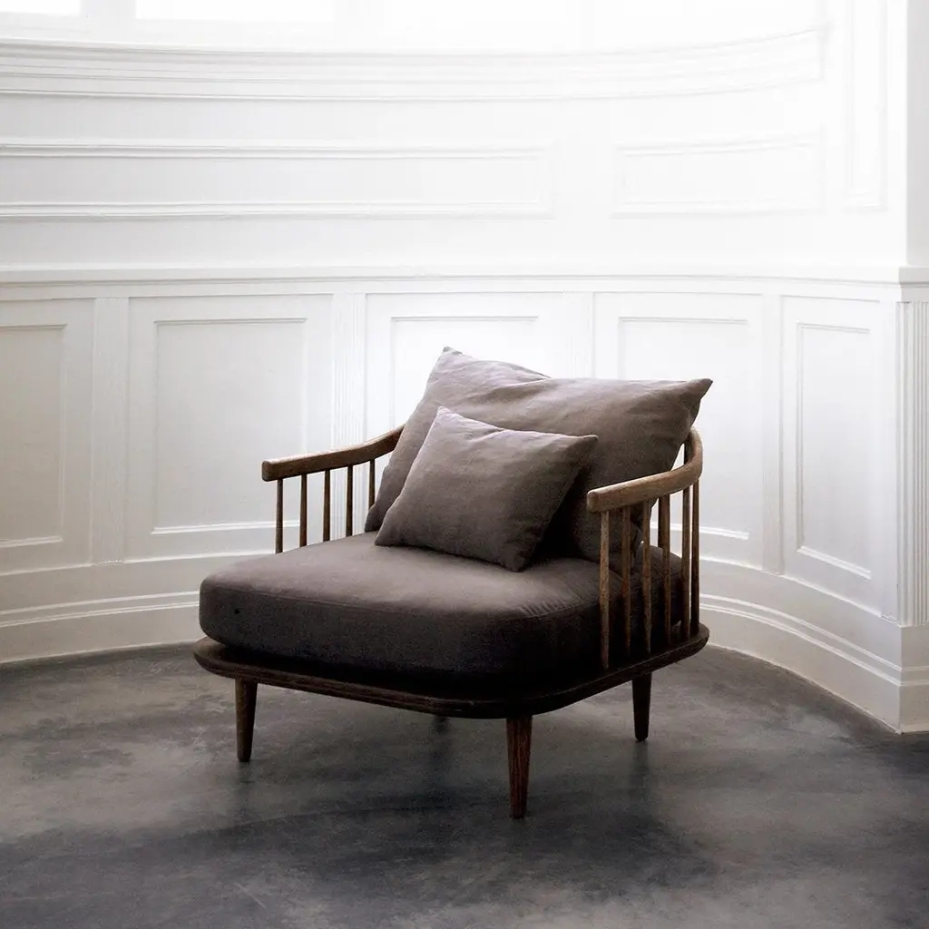The &Tradition FLY SC1 Lounge Chair, masterfully conceived by Space Copenhagen, redefines traditional Scandinavian seating by prioritizing absolute freedom of relaxation. This sophisticated piece marries classical Nordic woodworking techniques with contemporary comfort innovations, creating a lounge chair that adapts to the sitter rather than dictating posture. At the heart of the design is a meticulously handcrafted frame of solid oak, available in either white oiled or smoked oiled finish, featuring a thoughtfully slatted backrest that pays homage to traditional Danish furniture craftsmanship. The chair's organic silhouette (34.3" W x 31.5" D x 27" H) creates an inviting presence while maintaining a light, sculptural aesthetic that complements modern interiors. What truly sets the FLY SC1 apart is its innovative approach to comfort customization. The chair's loose back cushions, constructed from high-resilience foam and feather fill, can be freely arranged to support various lounging positions. This adaptability, combined with the precisely calibrated seat height of 15.7 inches and depth of 21.3 inches, creates an exceptionally versatile seating experience. Each FLY SC1 represents Space Copenhagen's commitment to balancing aesthetic refinement with practical comfort. Available in a carefully curated selection of upholstery options, this chair stands as a testament to &Tradition's mission of bridging historical craftsmanship with contemporary design sensibilities.