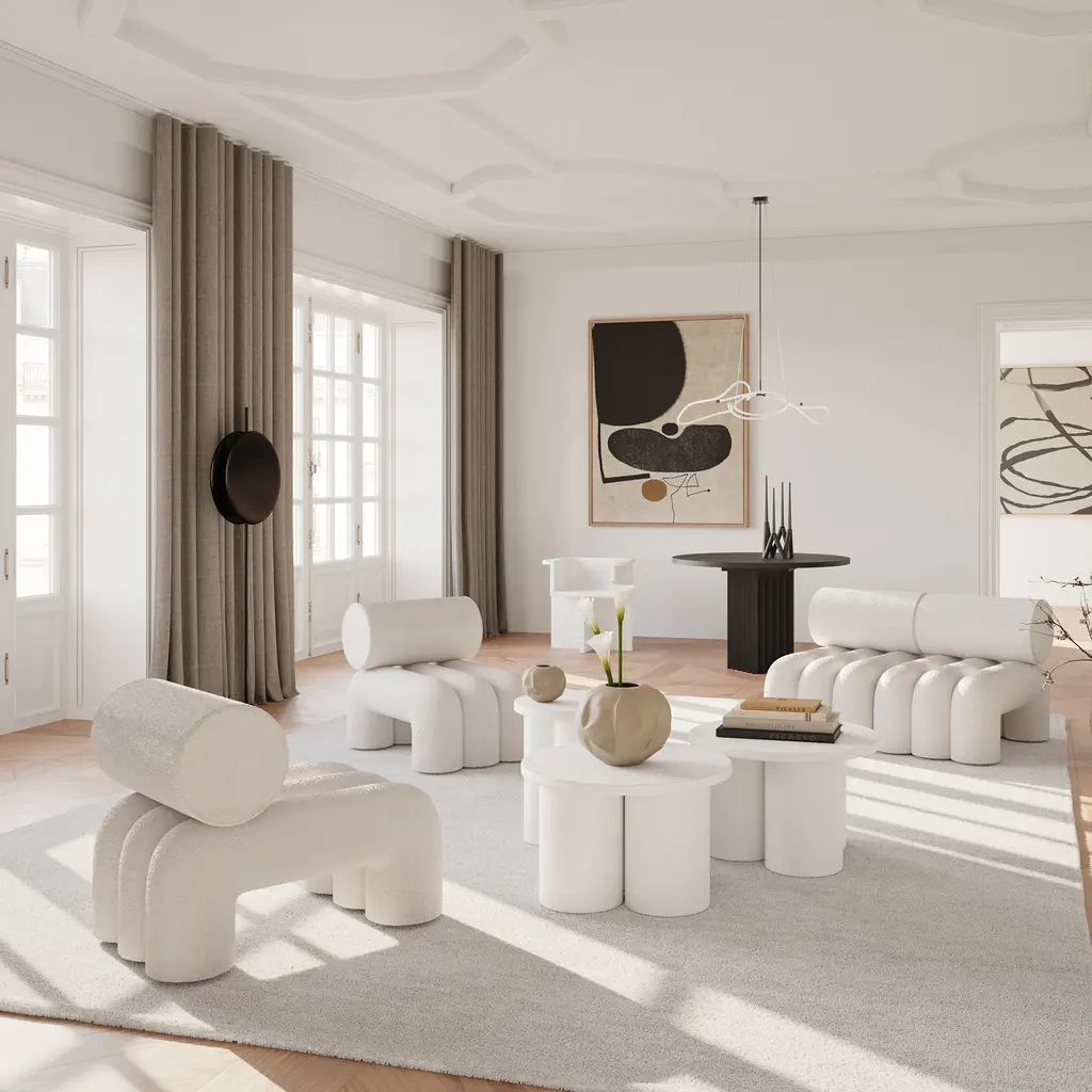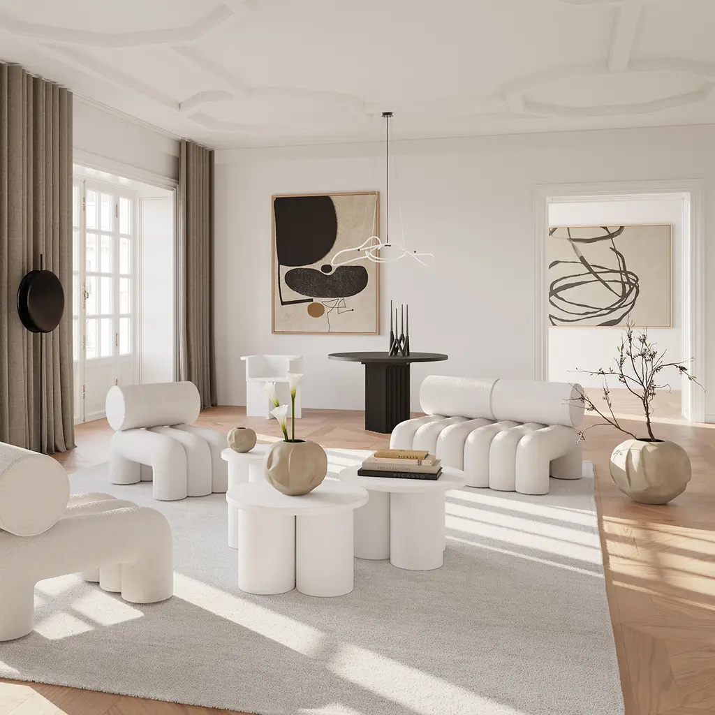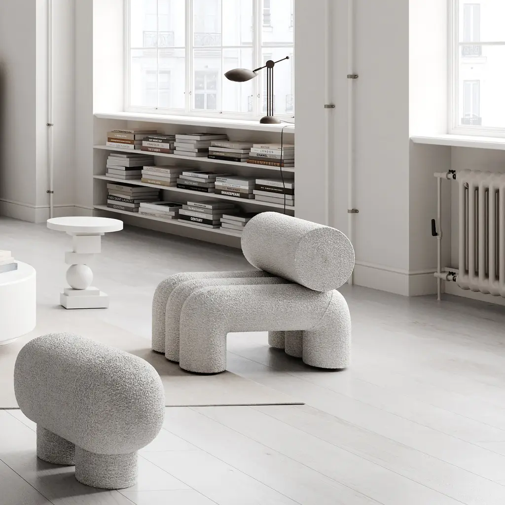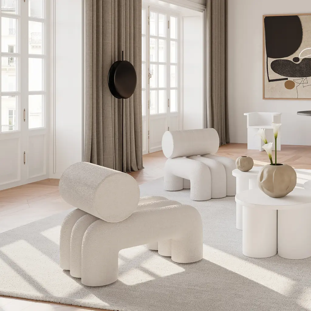 Inspired by Japanese Zen gardens, the 101 Copenhagen Foku modular lounge chair boasts thick, arched shapes that remind of the gardening tool used to draw perfect waves in the sand. The name also alludes to this source of inspiration, as Foku translates to “fork” in Japanese. Created by design duo Kristian Sofus Hansen & Tommy Hyldahl, this chair has a sculptural silhouette that maximizes both visual impact and comfort. Fully upholstered, Foku features plush foam padding that not only provides a supremely comfortable lounging experience, but also emphasizes the chair’s bold geometric forms. A modular lounge chair with metal brackets underneath the base, this design provides a convenient solution to attach several modules in a row to create a sofa. The 101 Copenhagen Foku Chair comes in two versions: one with a textured bouclé fabric for indoor spaces and the other with a water- and UV-resistant material that suits outdoor use.