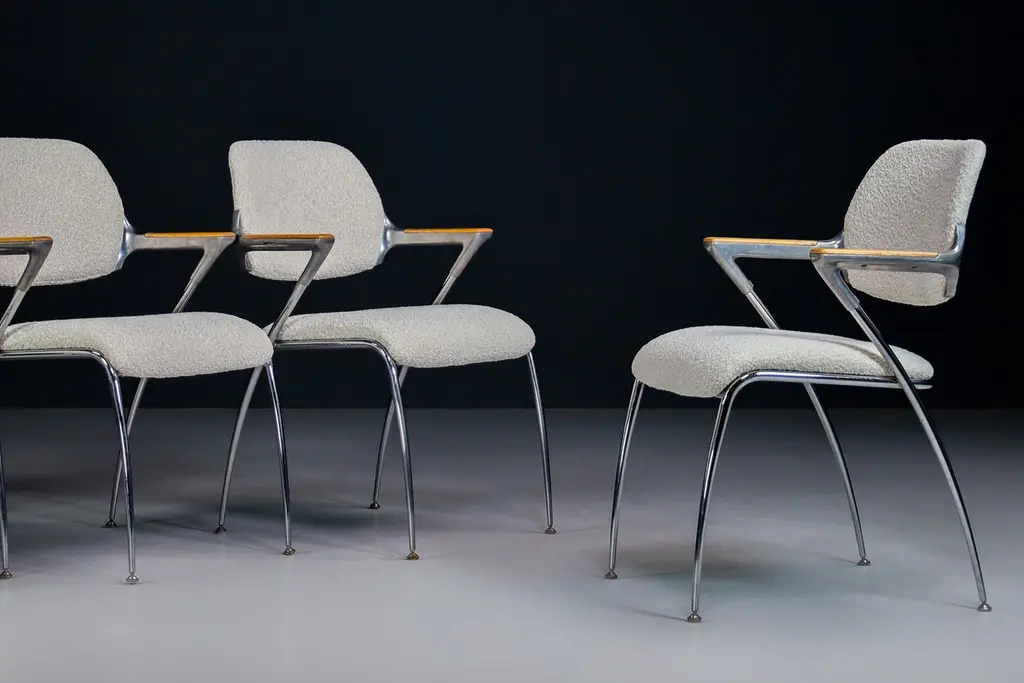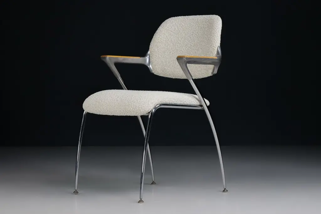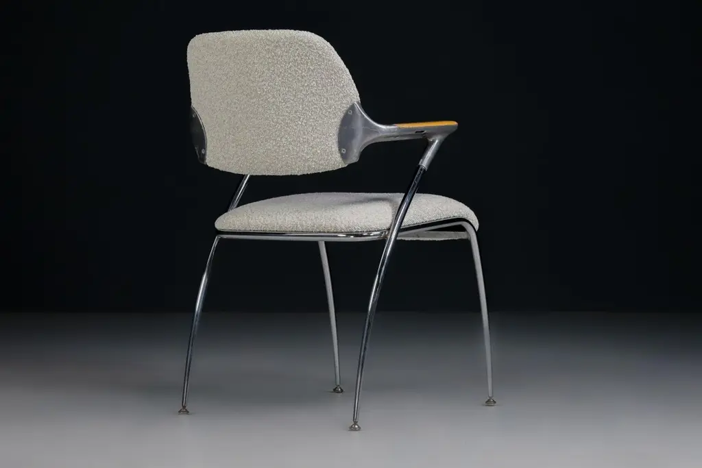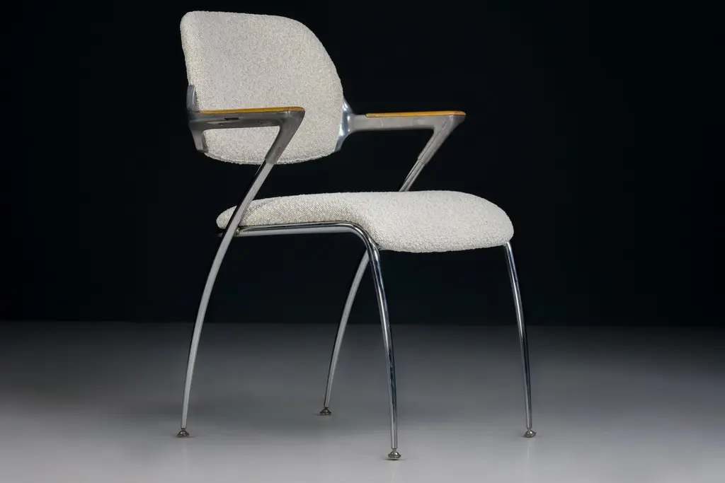 Presenting this stunning set of ‘Golf’ chairs by Francesco Zaccone for Thonet. Beautifully shaped chrome bases creating an incredibly sturdy and stately presence while keeping a streamlined and delicate look. Chrome has been hand polished and wood arms lightly refinished. A lovely and versatile pair making it easy to work in many different types of spaces. Newly reupholstered in a of white bouclé fabric that shows visual depth while providing a smooth finish to the touch. It is in perfect vintage condition , minor patina on wood and metal parts. These chairs would make an eye-catching addition to any interior such as living room, family room, screening room or even in the office. It also perfectly fits in a hospitality or corporate location like a boutique hotel lobby, cocktail bar, Restaurant ,members club or in a luxury boutique.Price per chair , 86+ chairs available . ( Also available in original fabric.).