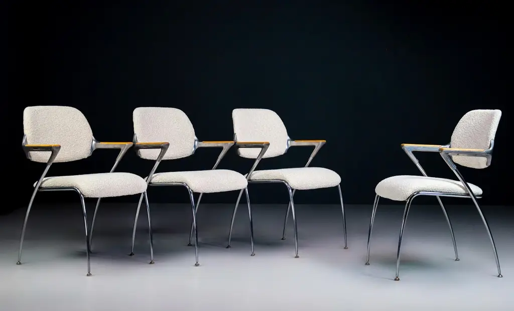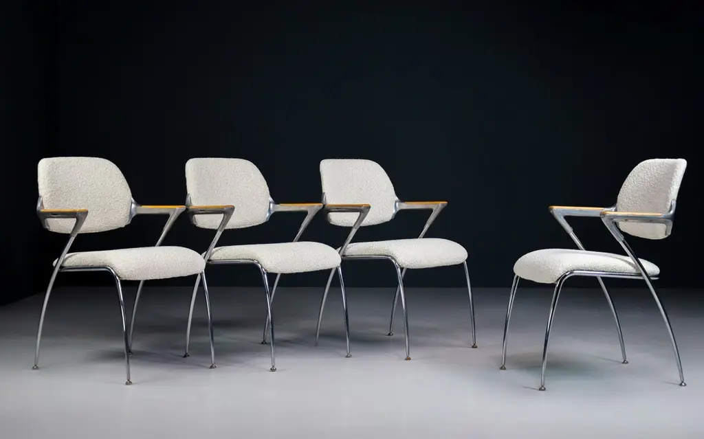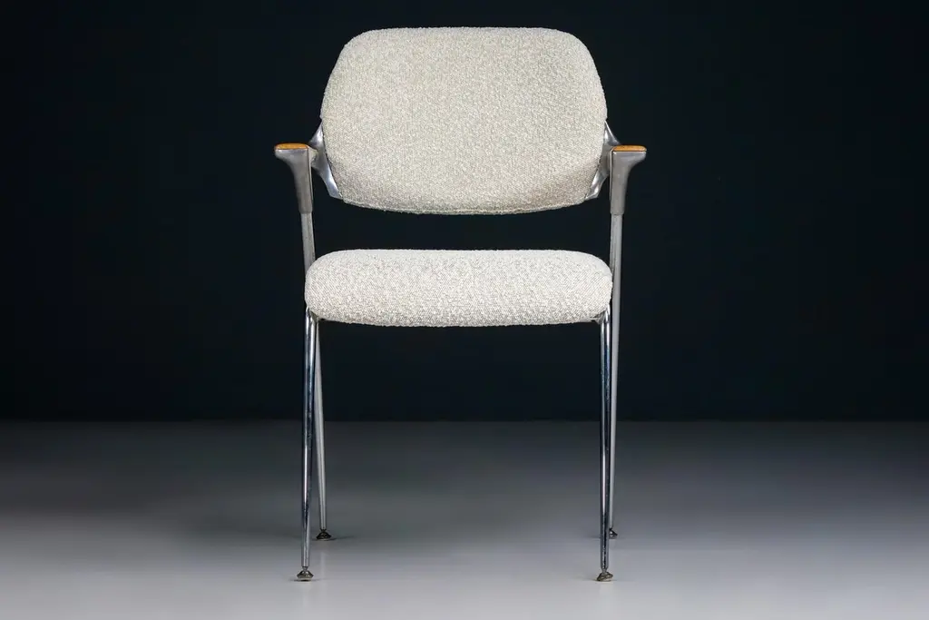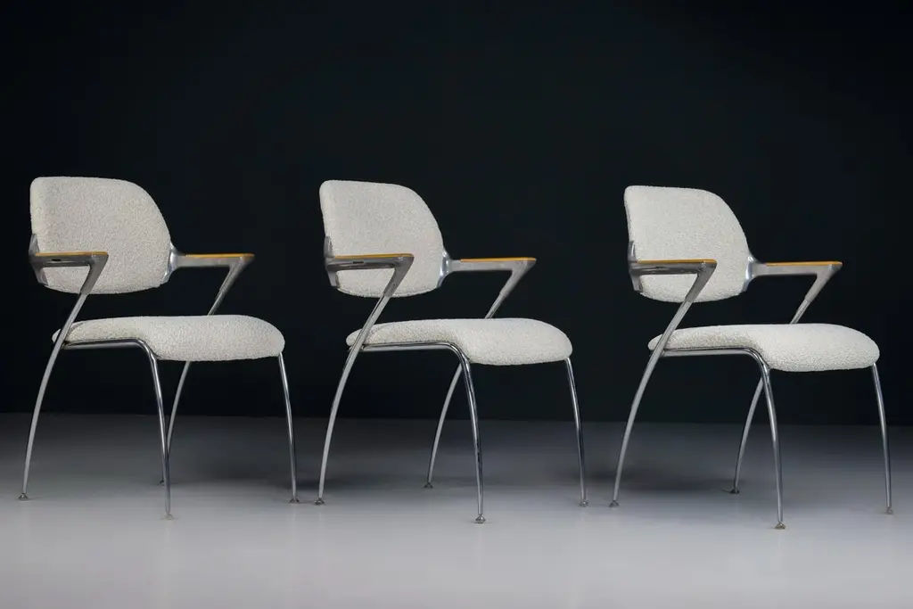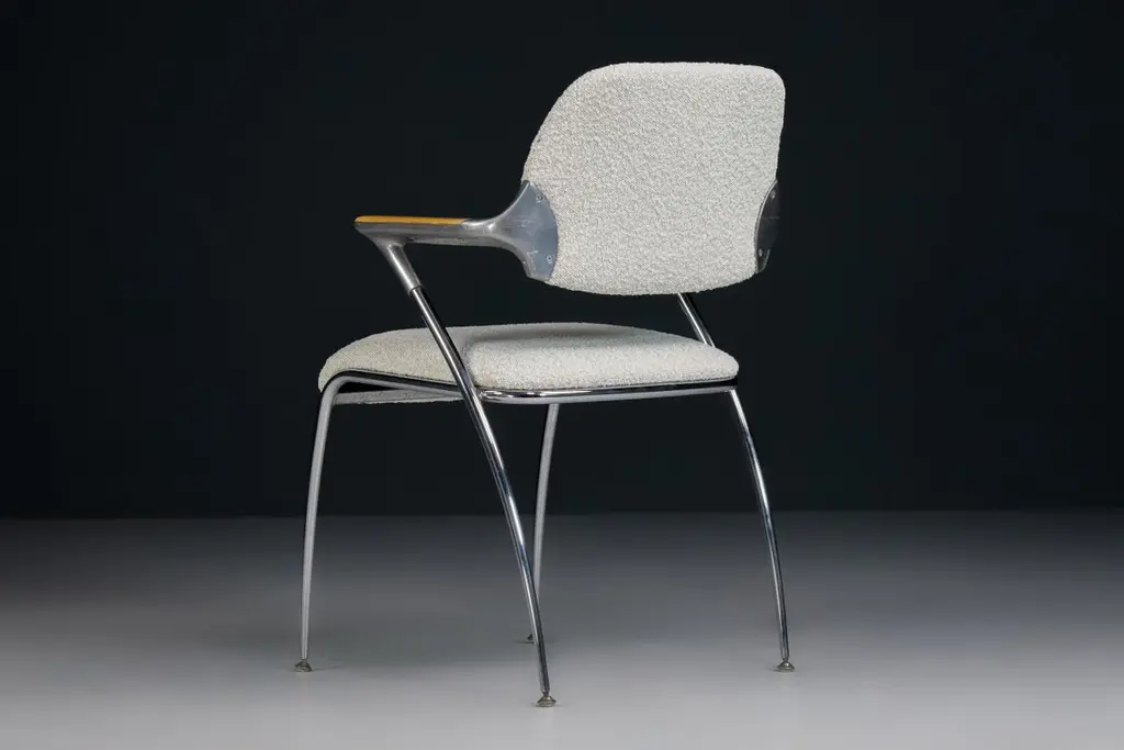 Presenting this stunning set of ‘Golf’ chairs by Francesco Zaccone for Thonet. Beautifully shaped chrome bases creating an incredibly sturdy and stately presence while keeping a streamlined and delicate look. Chrome has been hand polished and wood arms lightly refinished. A lovely and versatile pair making it easy to work in many different types of spaces. Newly reupholstered in a of white bouclé fabric that shows visual depth while providing a smooth finish to the touch. It is in perfect vintage condition , minor patina on wood and metal parts. These chairs would make an eye-catching addition to any interior such as living room, family room, screening room or even in the office. It also perfectly fits in a hospitality or corporate location like a boutique hotel lobby, cocktail bar, Restaurant ,members club or in a luxury boutique.Price per chair , 86+ chairs available . ( Also available in original fabric.).