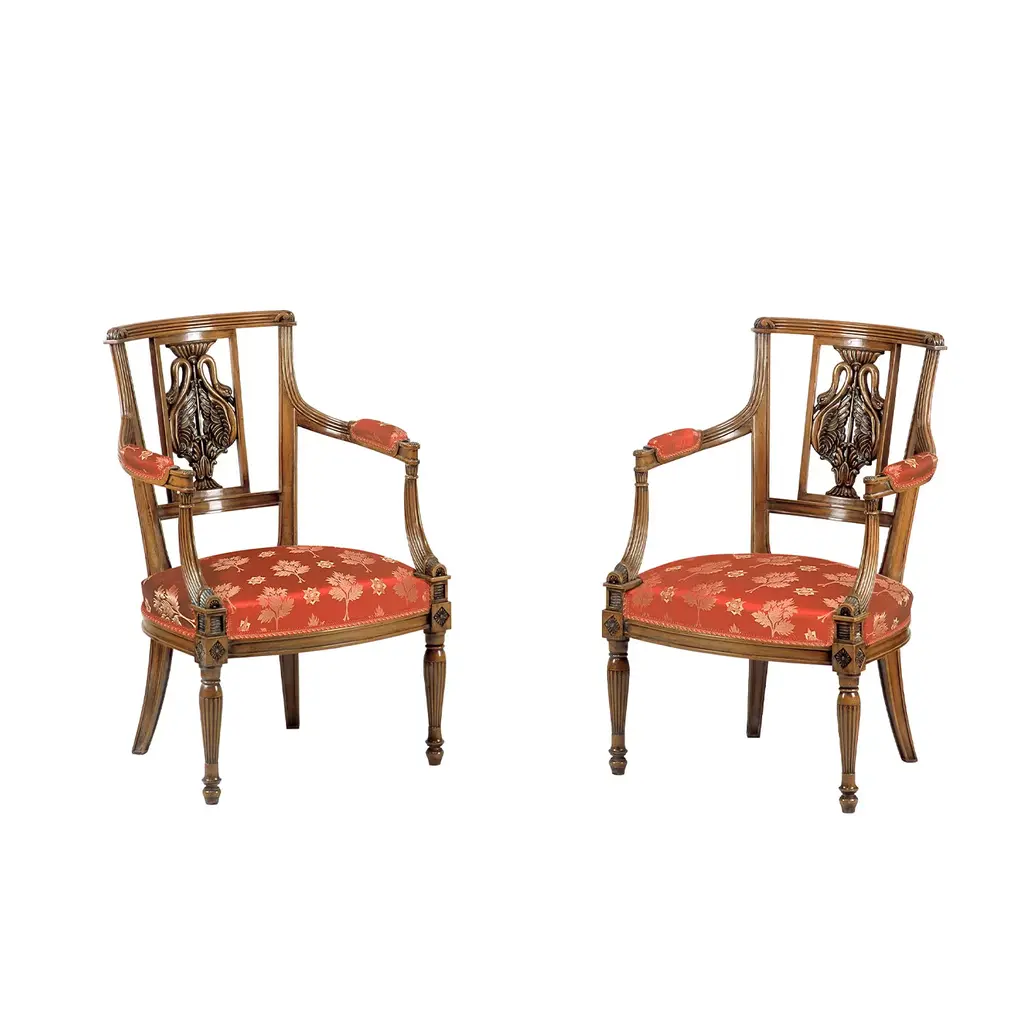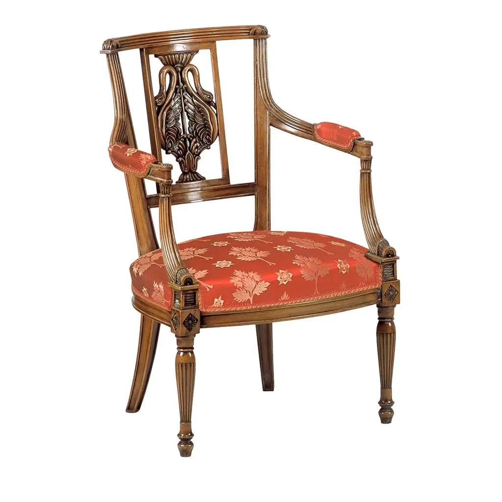 This sumptuous chair is a faithful reproduction of an original French Empire piece dating circa 1804-1815. The beech silhouette accented with shellac polish is rich in carved details also extending to the backrest, where swans are symmetrically arranged to shape a sort of amphora set in a rectangle. A patterned red cover envelops the seat and padded armrests.