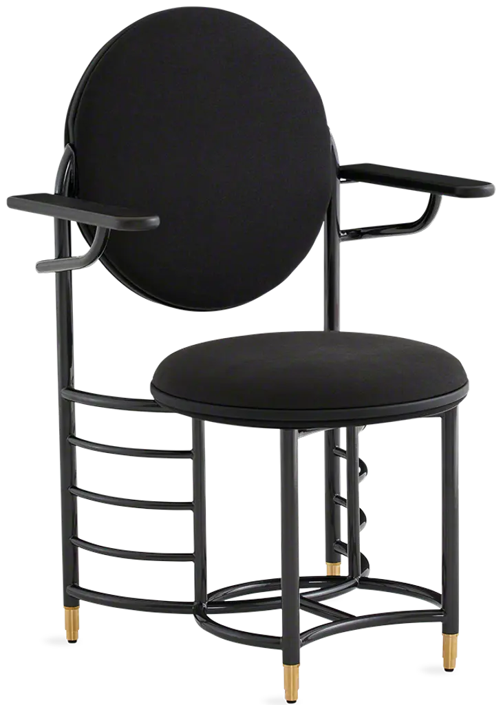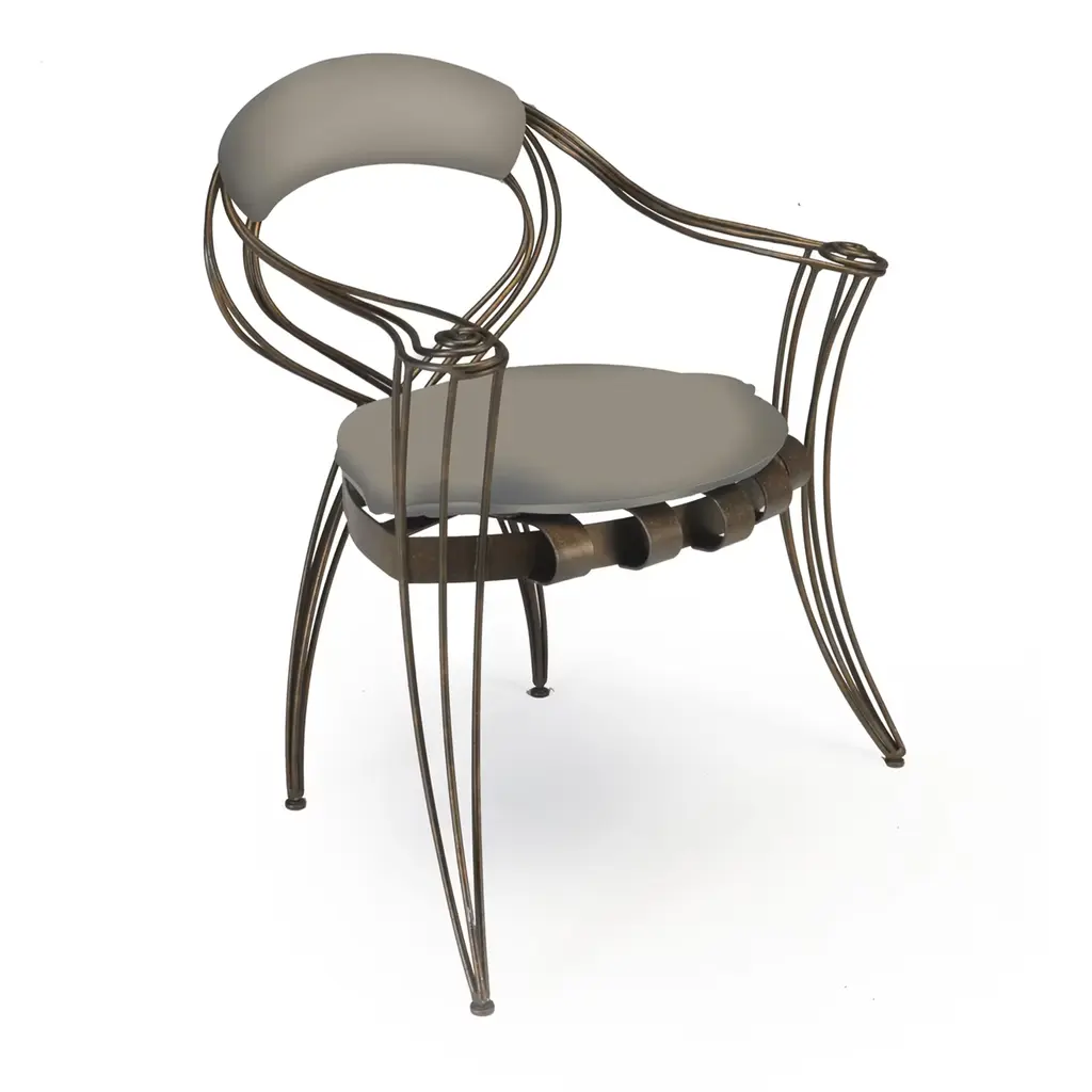 The Opus Garden Chair boasts a hand-forged iron frame, characterized by contoured legs and swirly details on the armrests for a timeless romantic feel. Protected with a rust-resistant bronze finish, this chair makes a stylish yet practical addition to the patio or terrace. Topped with a gray cushion for comfort.