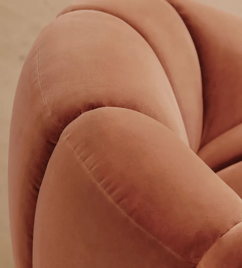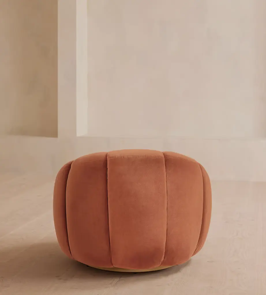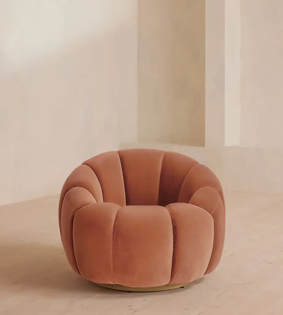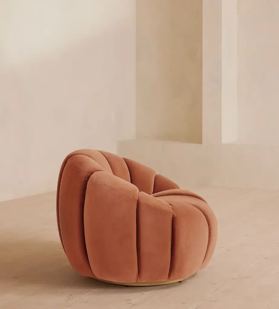 Shaped for optimal comfort and visual impact, the Garret swivel chair is a House favourite featured in a variety of our club spaces including 180 House and Little Beach House Brighton. Inviting you to relax and sink into its undulating curves, it's upholstered in rich velvet with a swivel base and brass detail. Use to recreate our cosy reading nook in your own home.