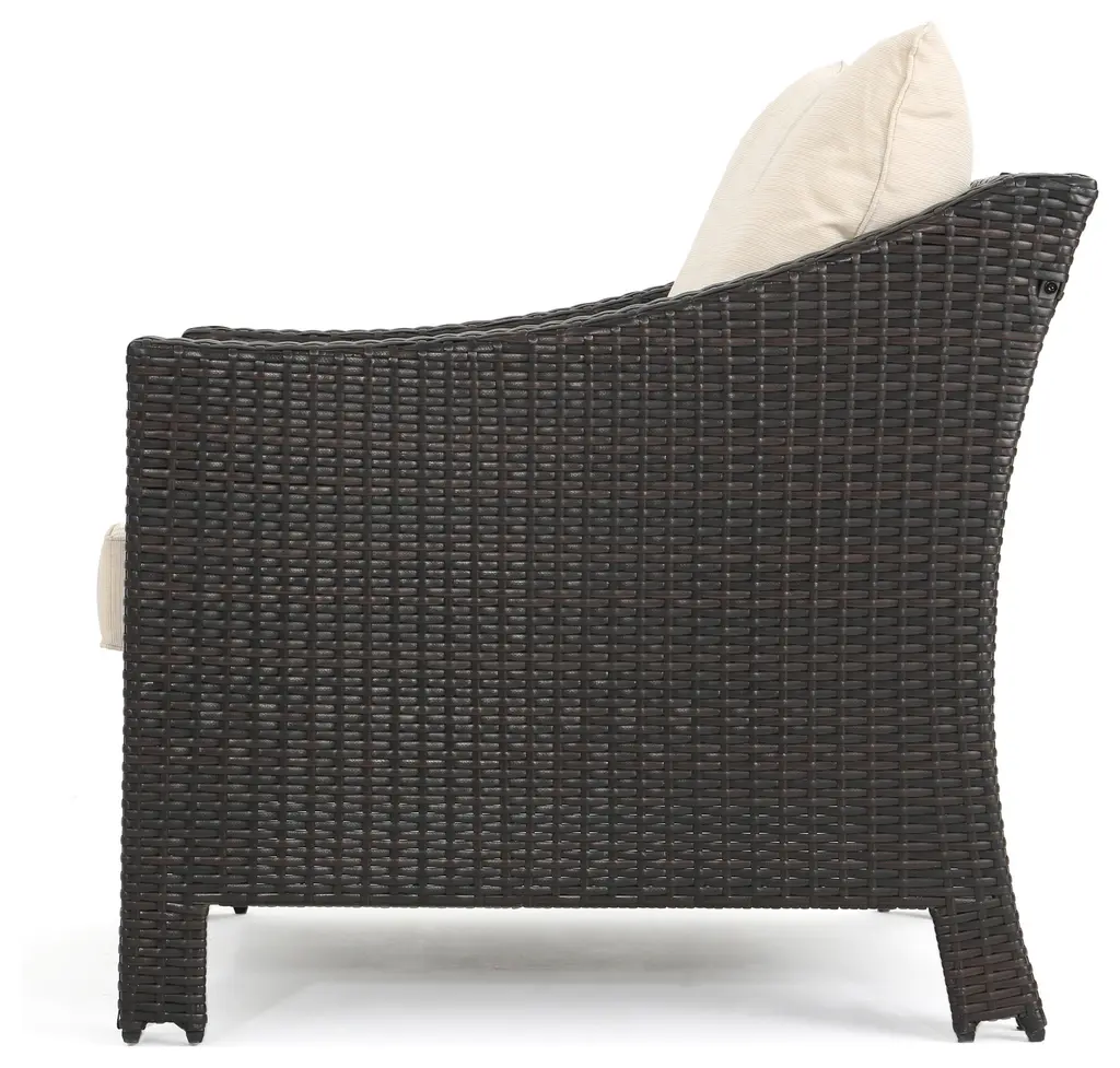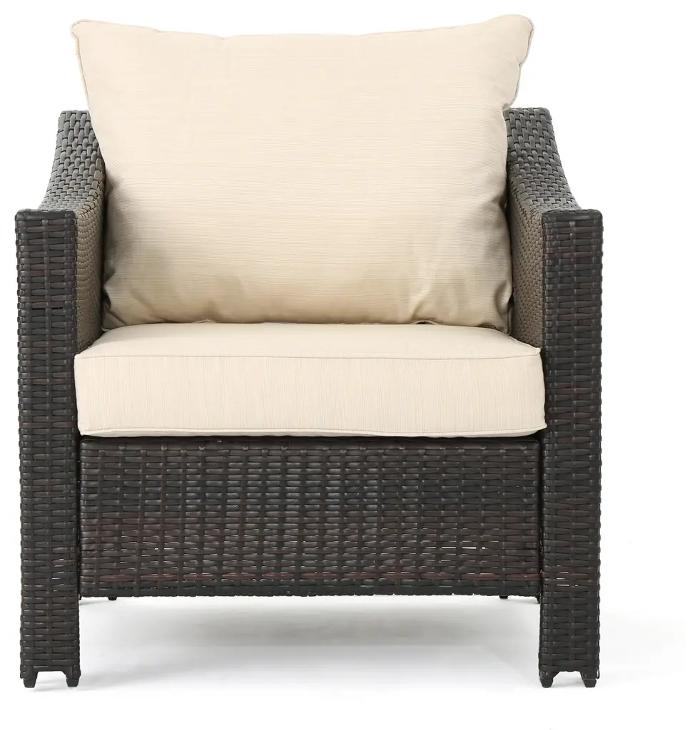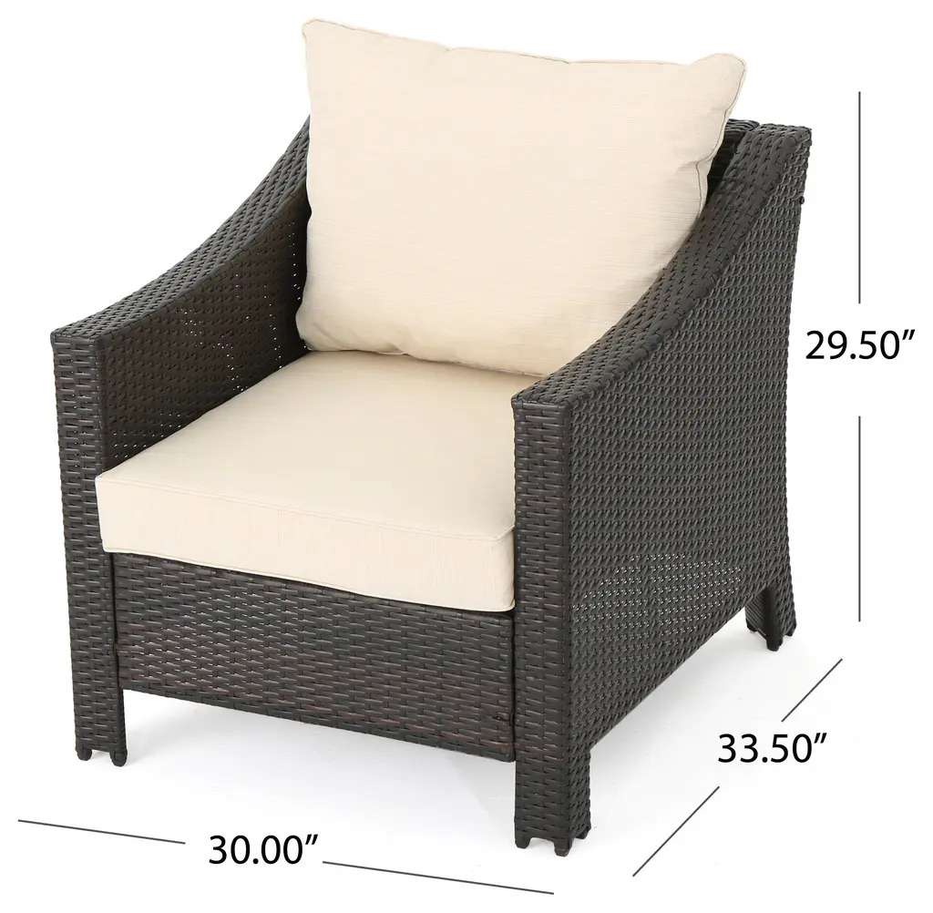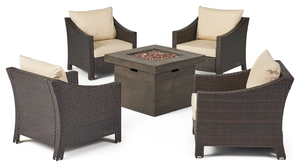 Transform your backyard, patio, or garden with this fire pit set. Featuring two comfortable and weather-resistant club chairs made from the finest materials, this is perfect for enjoying the outdoors in the cooler months. Friends and family are sure to love it.Includes: Four (4) Club Chairs and One (1) Fire PitMaterial: Polyethylene WickerFrame Material: IronCushion Material: Water Resistant FabricComposition: 100% PolyesterFire Pit Material: Magnesium OxideWicker Finish: MultibrownCushion Color: BeigeFire Pit Finish: BrownAssembly RequiredHand Crafted DetailsChair Dimensions: 33.50 inches deep x 30.00 inches wide x 29.50 inches highSeat Width: 17.50 inchesSeat Depth: 23.25 inchesSeat Height: 26.75 inchesArm Height: 24.50 inchesFire Pit Dimensions: 32.20 inches deep x 32.20 inches wide x 23.80 inches high