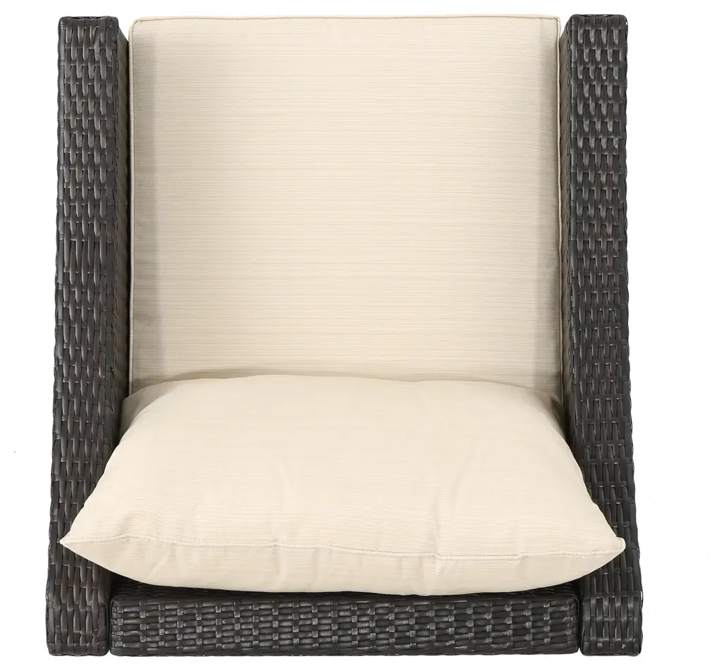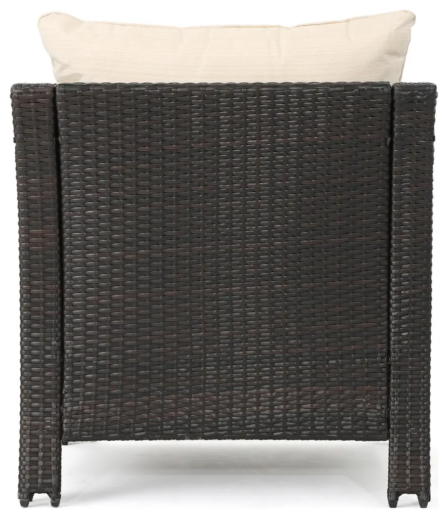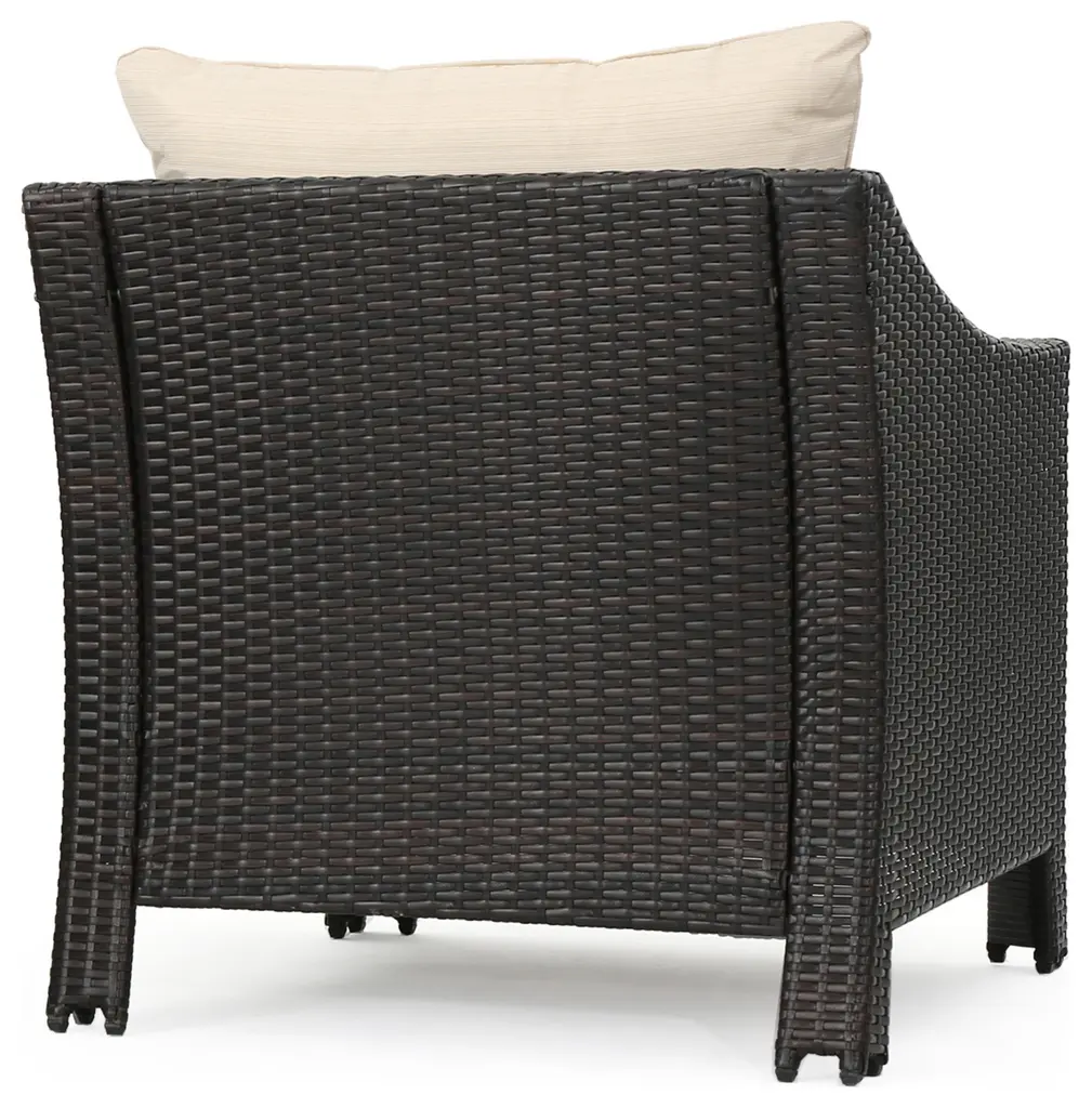 Transform your backyard, patio, or garden with this fire pit set. Featuring two comfortable and weather-resistant club chairs made from the finest materials, this is perfect for enjoying the outdoors in the cooler months. Friends and family are sure to love it.Includes: Four (4) Club Chairs and One (1) Fire PitMaterial: Polyethylene WickerFrame Material: IronCushion Material: Water Resistant FabricComposition: 100% PolyesterFire Pit Material: Magnesium OxideWicker Finish: MultibrownCushion Color: BeigeFire Pit Finish: BrownAssembly RequiredHand Crafted DetailsChair Dimensions: 33.50 inches deep x 30.00 inches wide x 29.50 inches highSeat Width: 17.50 inchesSeat Depth: 23.25 inchesSeat Height: 26.75 inchesArm Height: 24.50 inchesFire Pit Dimensions: 32.20 inches deep x 32.20 inches wide x 23.80 inches high