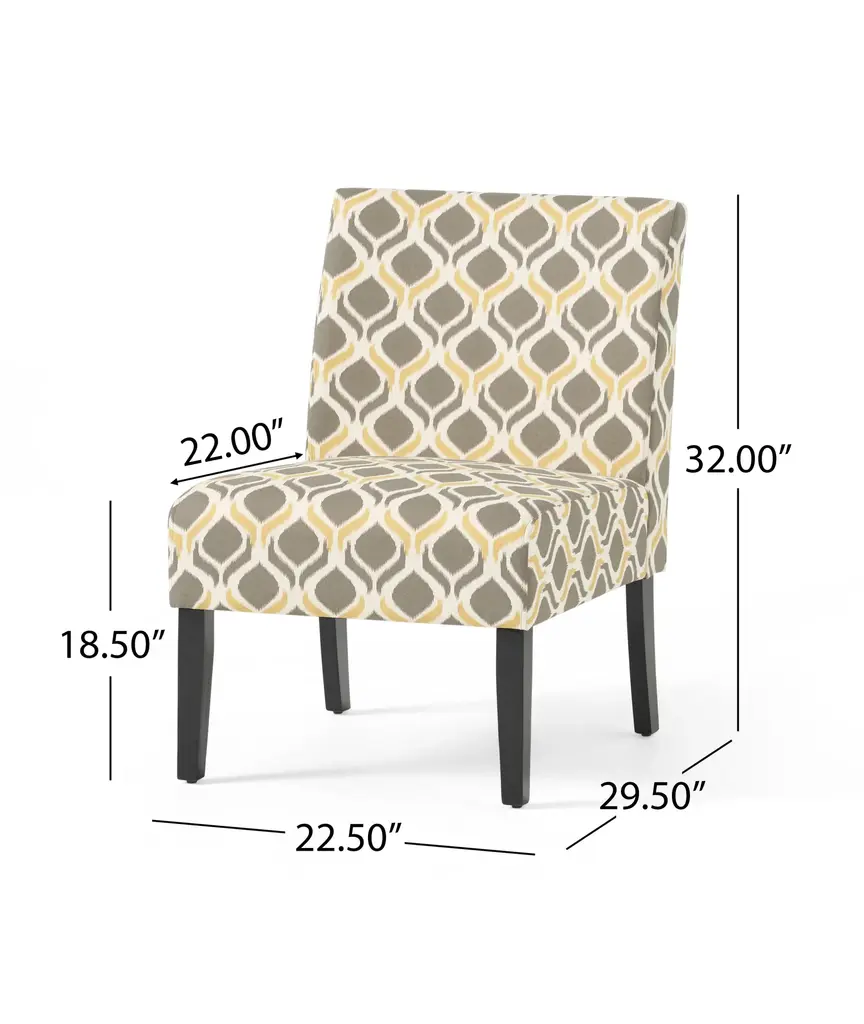 Whether you are looking for a cozy corner to kick back and relax or if you are just looking to upgrade your interior aesthetics, our accent chair is the perfect addition to any home. Featuring a minimalistic yet sophisticated design, this chair is sure to delight in both style and comfort. The beautifully tapered legs and sturdy build of the chair provide reliable stability while its plush upholstery offers outstanding comfort. With a streamlined structure, our chair will blend seamlessly into any existing decor.CONTEMPORARY: With clean lines and tapered legs, this accent chair features a prominent contemporary style. With a minimalistic and comfortable design, this chair will blend seamlessly with your decor while providing ample seating space in any room.UPHOLSTERED: Our accent chair is generously upholstered, giving any room a refined appearance. This provides a smooth, immaculate texture for this piece as well as plush seating.RUBBERWOOD: Our environmentally-friendly wood not only offers plenty of durability, but it also gives this piece a beautiful natural-grain look. Combined with a gorgeous finish, this wood will truly stand out in any room.TAPERED LEGS: This chair showcases elegantly tapered legs for a chic look. With two straight front legs and two gently sloped back legs, this piece not only provides a stable structure but also a refined look to your home.ASSEMBLY REQUIRED: Some assembly is required for this chair. All of the instructions and tools needed for assembly are included.Includes: One (1) Accent ChairMaterial: FabricFabric Composition: 100% PolyesterLeg Material: RubberwoodMultiple Color and Design OptionsLeg Finish: Matte BlackAssembly RequiredHand-Crafted DetailsDimensions: 29.50 inches deep x 22.50 inches wide x 32.00 inches highSeat Dimensions: 22.00 inches deep x 22.50 inches wide x 18.50 inches high