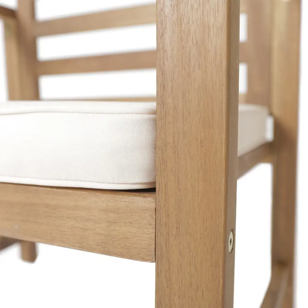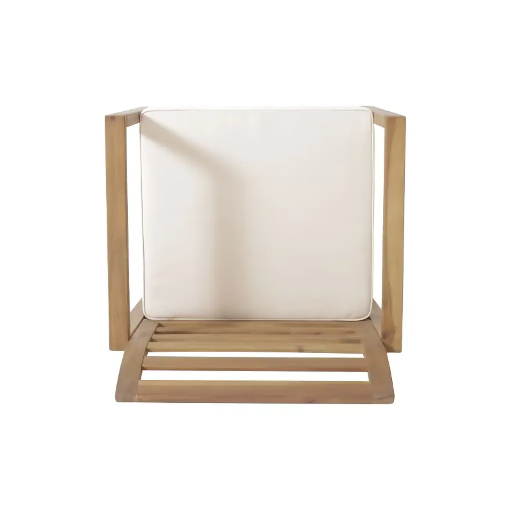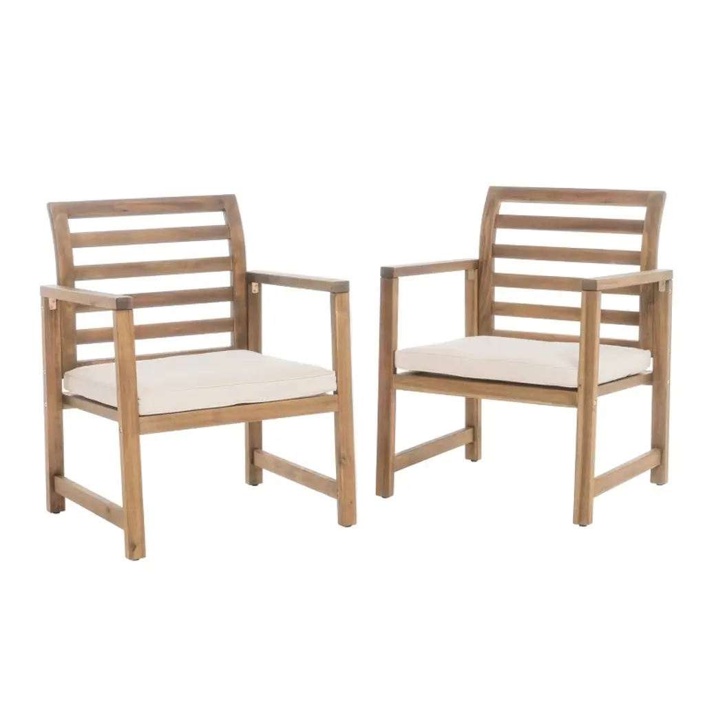Add timeless charm to your patio with these beautifully crafted wood club chairs. Made from durable acacia wood, they’re designed to withstand outdoor conditions while maintaining a fresh, natural look. The cushions feature water-resistant fabric, making them easy to clean and perfect for worry-free use throughout the summer season. Material: Acacia Wood Cushion Material: Water Resistant Fabric Fabric Composition: 100% Polyester Wood Finish: Natural Color: Cream Assembly Required Dimensions: 25.50 inches deep x 24.50 inches wide x 33.00 inches high Seat Dimensions: 20.27 inches deep x 20.27 inches wide x 13.77 inches high Arm Height: 25.39 inches