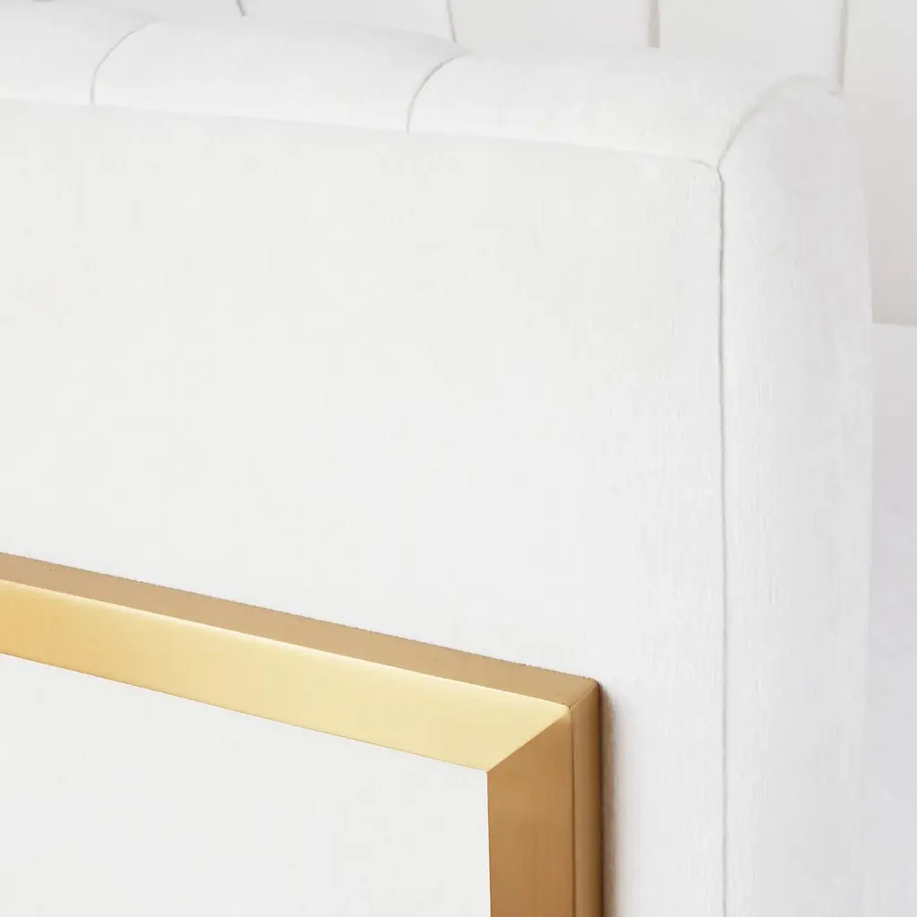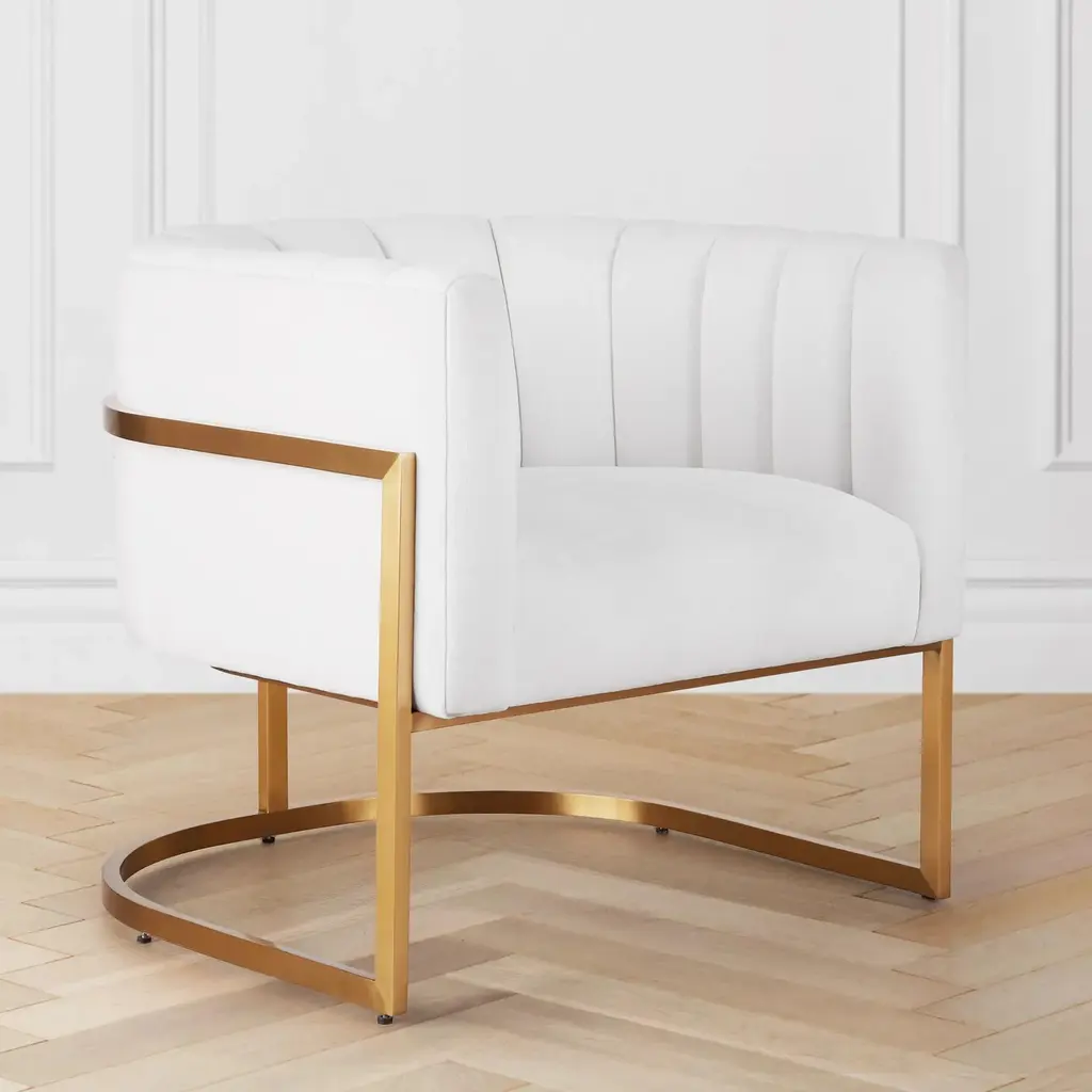Sleek and modern, this accent chair pairs a channel-tufted barrel back with an exposed stainless-steel frame in a brushed gold finish. A foam-core fill wrapped in fiber ensures outstanding comfort and support. Shown in Kenley Chenille Snow.Z Gallerie ExclusiveAvailable in over 15 fabrics. Custom Orders: Custom Furniture is manufactured especially for you, which is why we do not accept cancellations, exchanges, or returns.