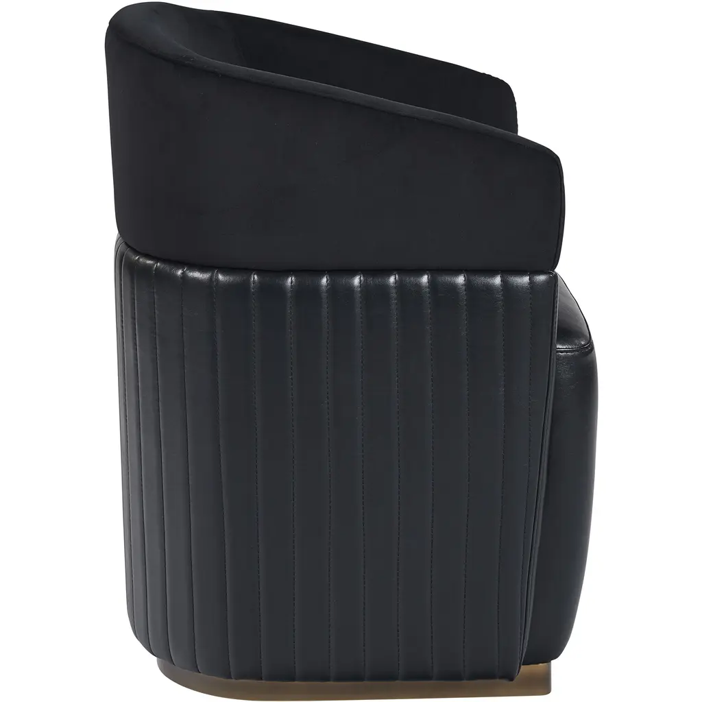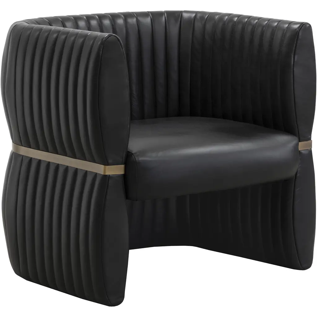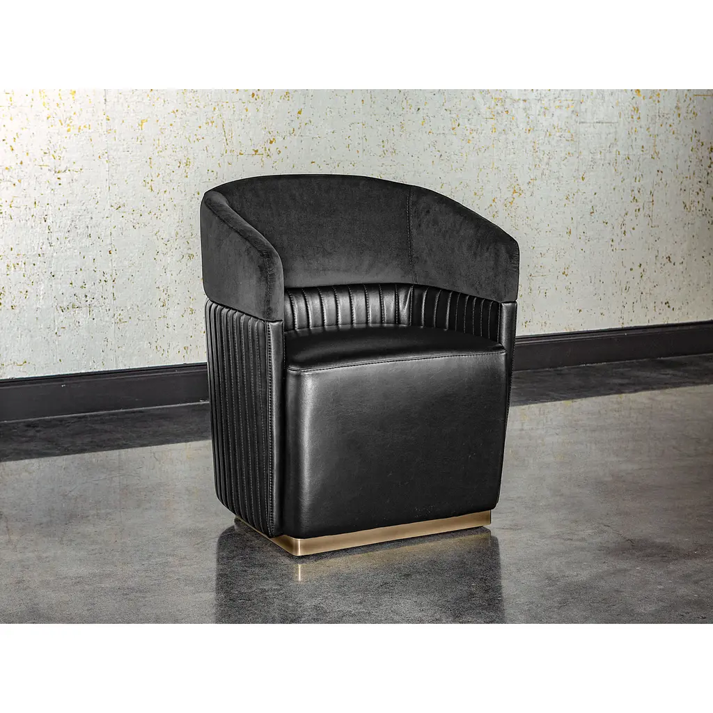 Guests will be intrigued by the unique design details found on this wheeled lounge chair. Designed with contemporary styling, this chair features a channel tufted seatback in abbington black fabric and cantina black bonded leather with a brass frame. Handle with Care: This design has been crafted with bonded leather. Bonded leather is a blend of reconstituted leather and synthetic materials crafted to reflect the natural characteristics of leather as such, colour variations, markings, wrinkles, grooves and light scratches are acceptable and appreciated characteristics. No two pieces are alike. Visit our Product Care page for more information on how to ensure the lasting beauty of this piece.