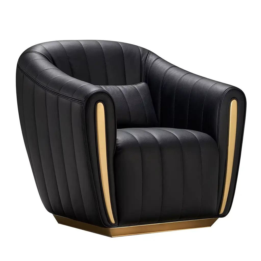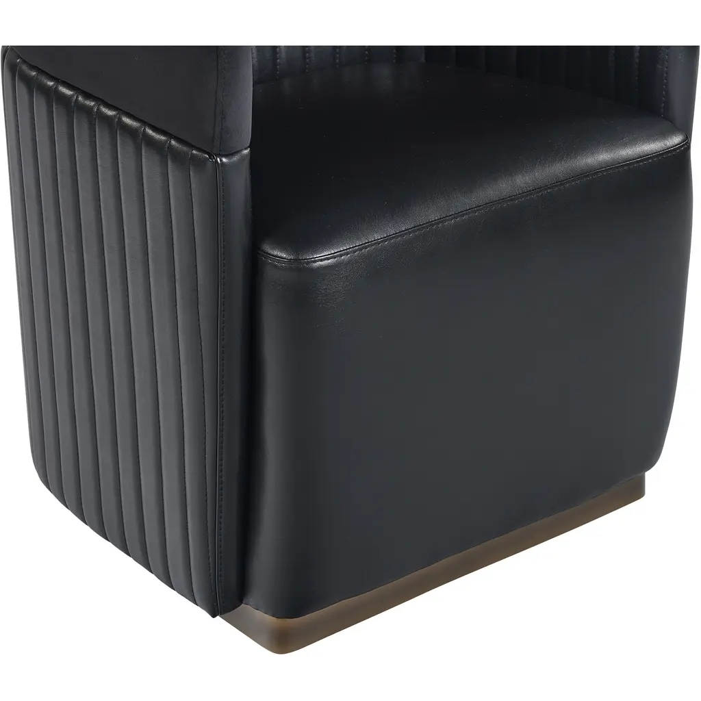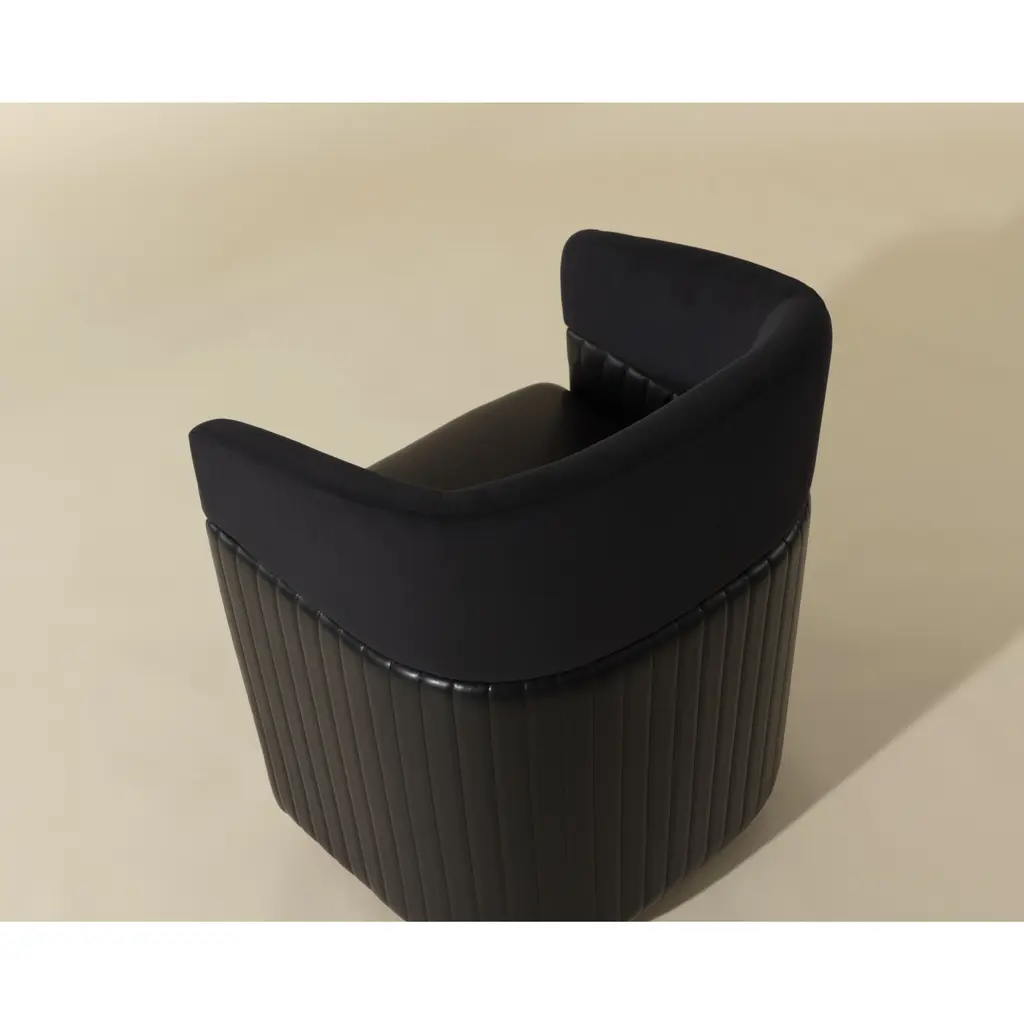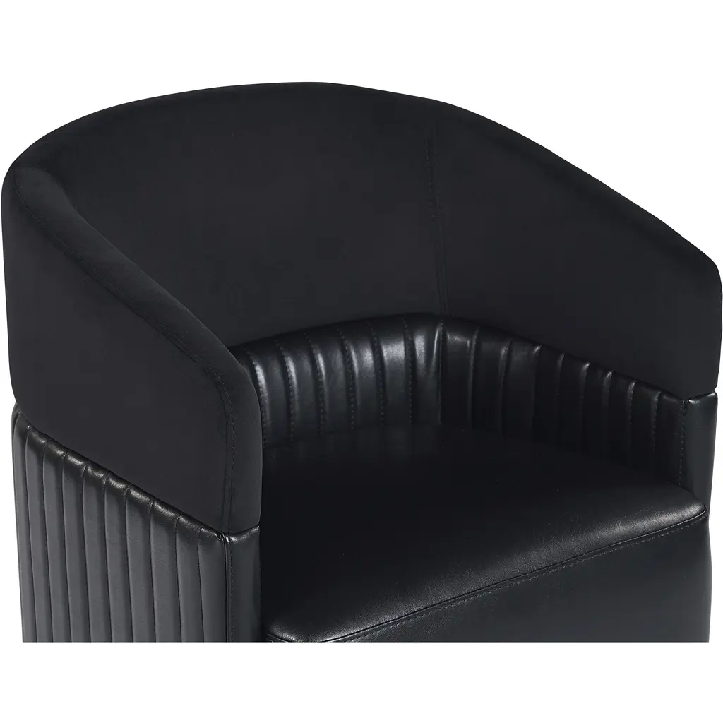 Guests will be intrigued by the unique design details found on this wheeled lounge chair. Designed with contemporary styling, this chair features a channel tufted seatback in abbington black fabric and cantina black bonded leather with a brass frame. Handle with Care: This design has been crafted with bonded leather. Bonded leather is a blend of reconstituted leather and synthetic materials crafted to reflect the natural characteristics of leather as such, colour variations, markings, wrinkles, grooves and light scratches are acceptable and appreciated characteristics. No two pieces are alike. Visit our Product Care page for more information on how to ensure the lasting beauty of this piece.