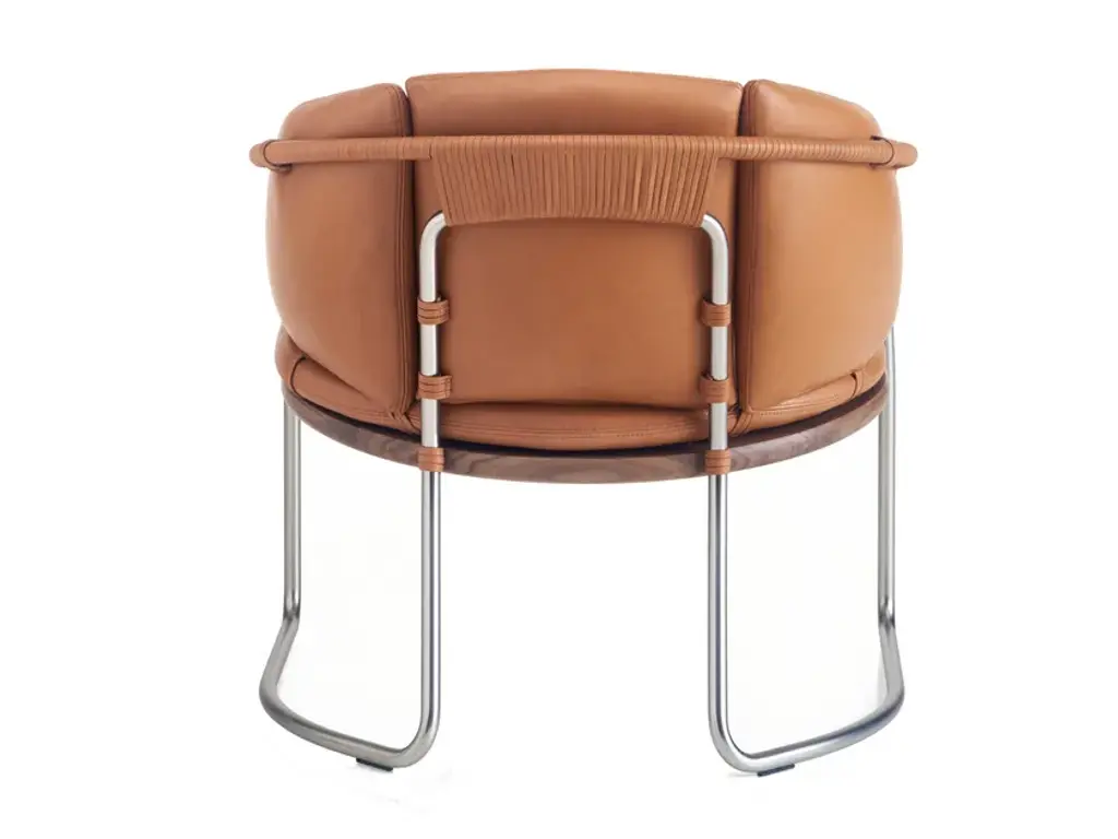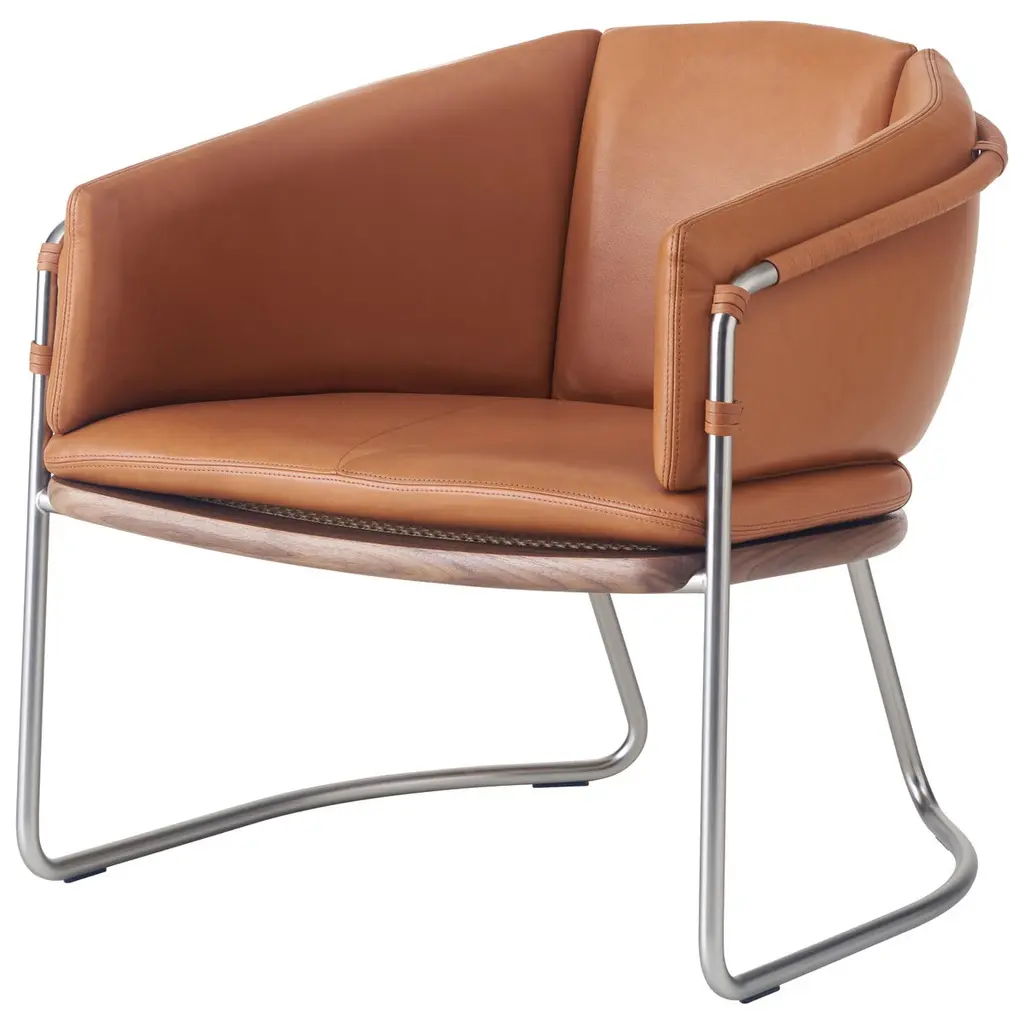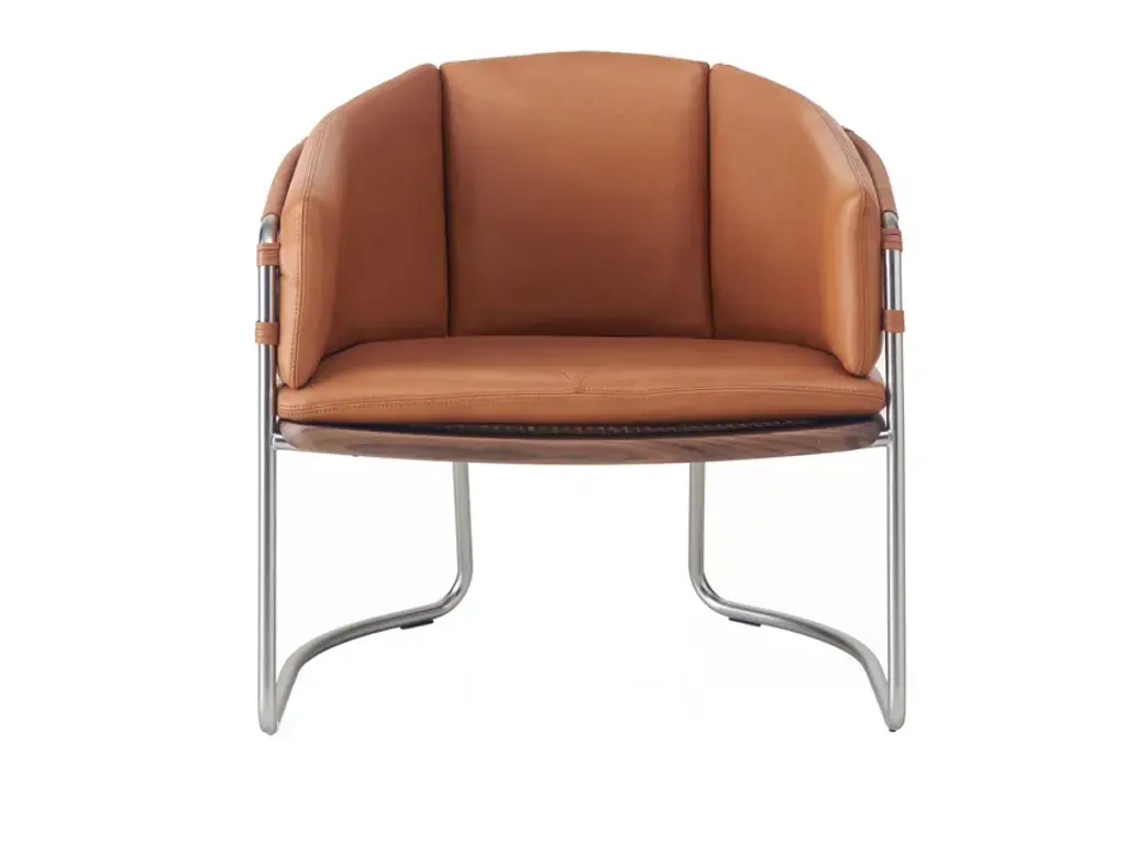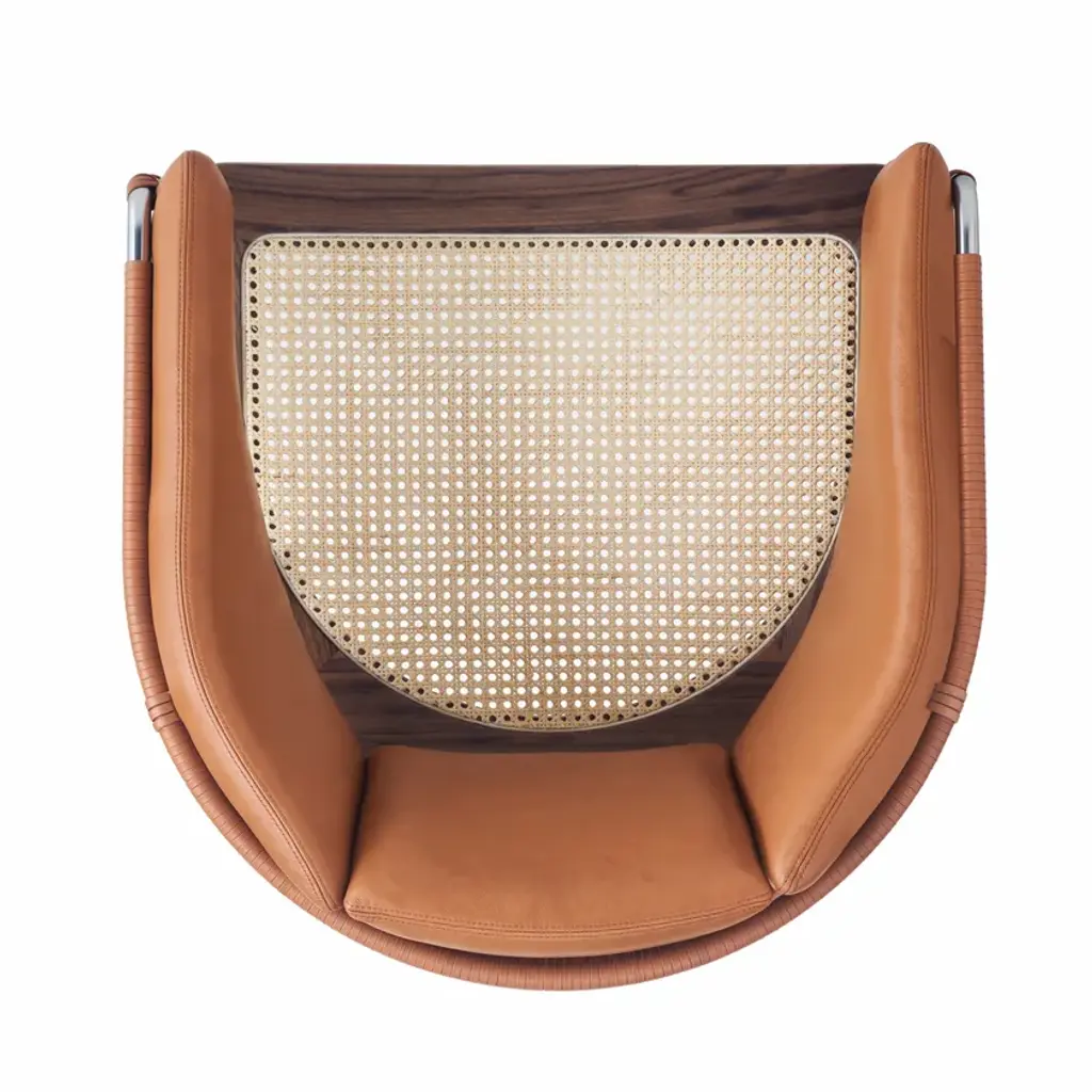 The Geometric Lounge Chair is lounge chair with a nanoceramic coated tubular steel frame and a carved, solid wood seat with a double layer of Vienna caning. The frame is wrapped partially in leather. Dual-density foam cushions feature a knife edge detail with double stitching. Materials: Satin Nickel, Bronze, Satin Brass or Gunmetal nanoceramic coated tubular steel frame. Carved solid Walnut, Oak, Ash, or Ebonized Ash seat deck with Vienna caning.The Geometric Colection from BassamFellows celebrates the sublimity of pure geometry championed by the Wiener Werkstätte and the Bauhaus. In the same way that designers of these two influential schools tested the liberating material properties of bentwood and tubular steel, Bassam refined a set of constraints to spirit cold-rolled tubular steel into forms that hold the horizontal planes of a seat deck or tabletop, achieving the poetic appearance of extreme lightness and suspension. These stately steel scaffolds operate as a connective tissue uniting the furniture’s functional elements in a Gesamtkunstwerk, or total work of art, a synthesis central to BassamFellows’ philosophy of formal and functional coherence in design.