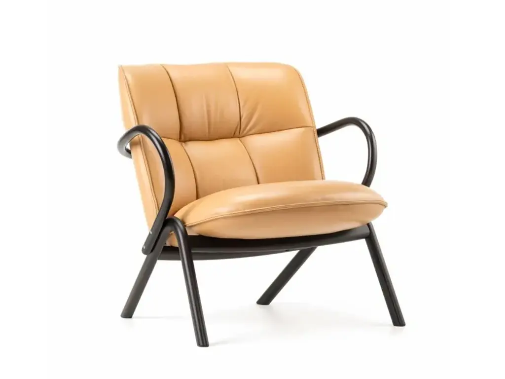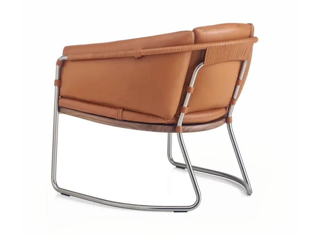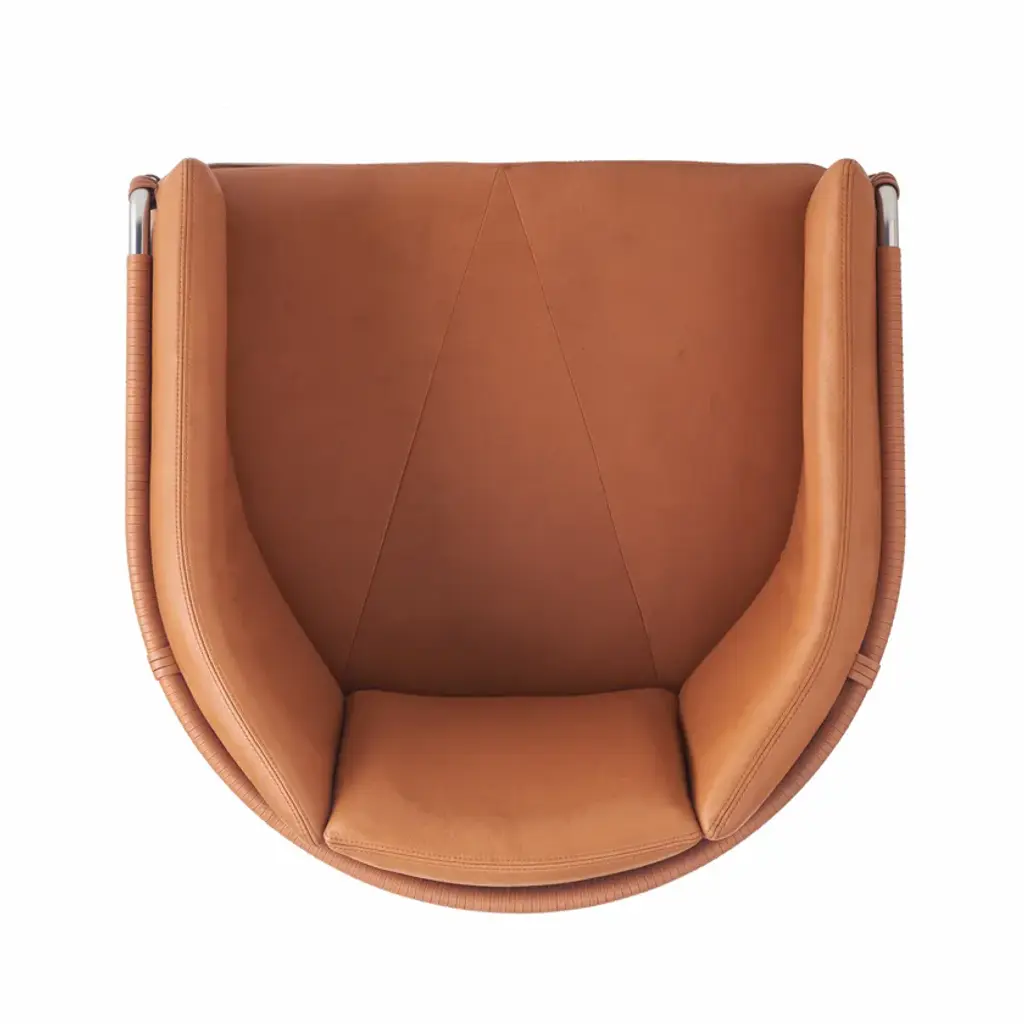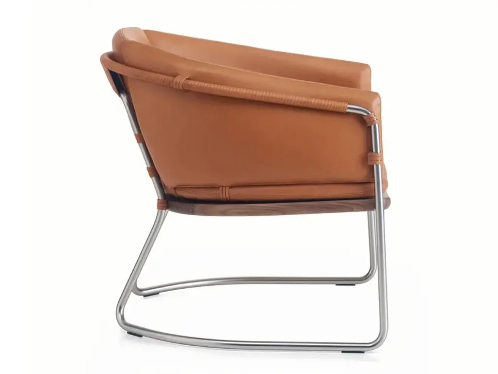 The Geometric Lounge Chair is lounge chair with a nanoceramic coated tubular steel frame and a carved, solid wood seat with a double layer of Vienna caning. The frame is wrapped partially in leather. Dual-density foam cushions feature a knife edge detail with double stitching. Materials: Satin Nickel, Bronze, Satin Brass or Gunmetal nanoceramic coated tubular steel frame. Carved solid Walnut, Oak, Ash, or Ebonized Ash seat deck with Vienna caning.The Geometric Colection from BassamFellows celebrates the sublimity of pure geometry championed by the Wiener Werkstätte and the Bauhaus. In the same way that designers of these two influential schools tested the liberating material properties of bentwood and tubular steel, Bassam refined a set of constraints to spirit cold-rolled tubular steel into forms that hold the horizontal planes of a seat deck or tabletop, achieving the poetic appearance of extreme lightness and suspension. These stately steel scaffolds operate as a connective tissue uniting the furniture’s functional elements in a Gesamtkunstwerk, or total work of art, a synthesis central to BassamFellows’ philosophy of formal and functional coherence in design.