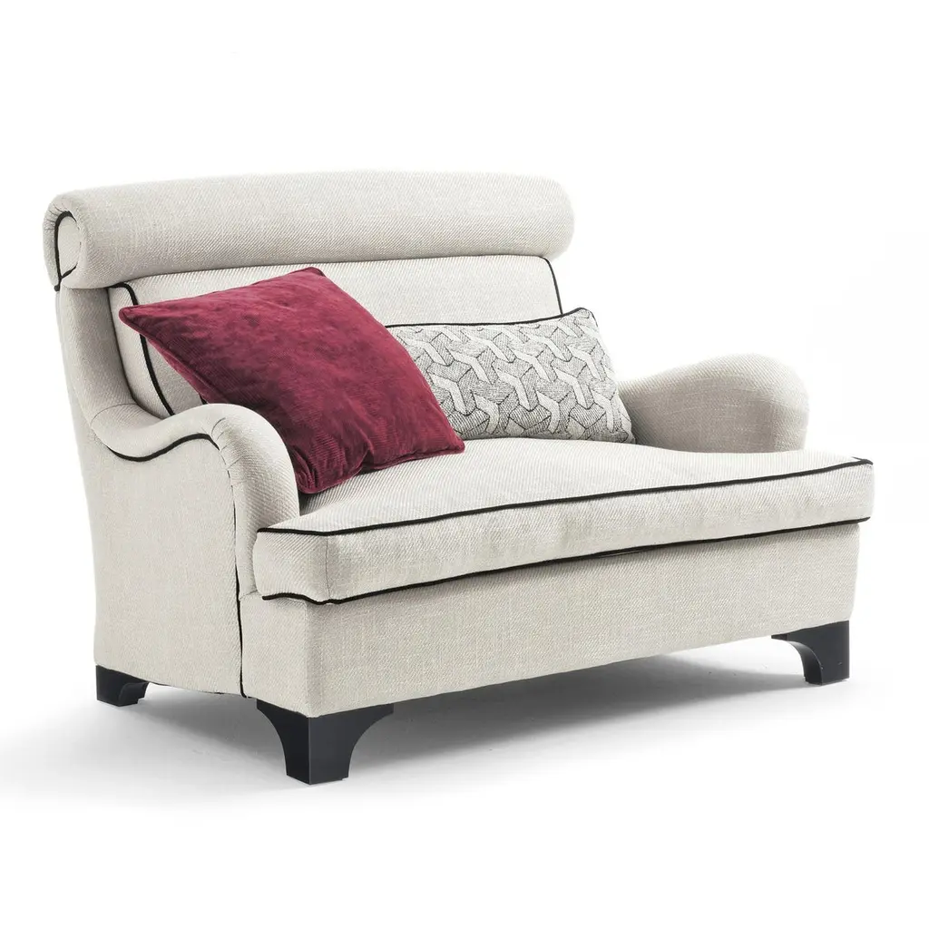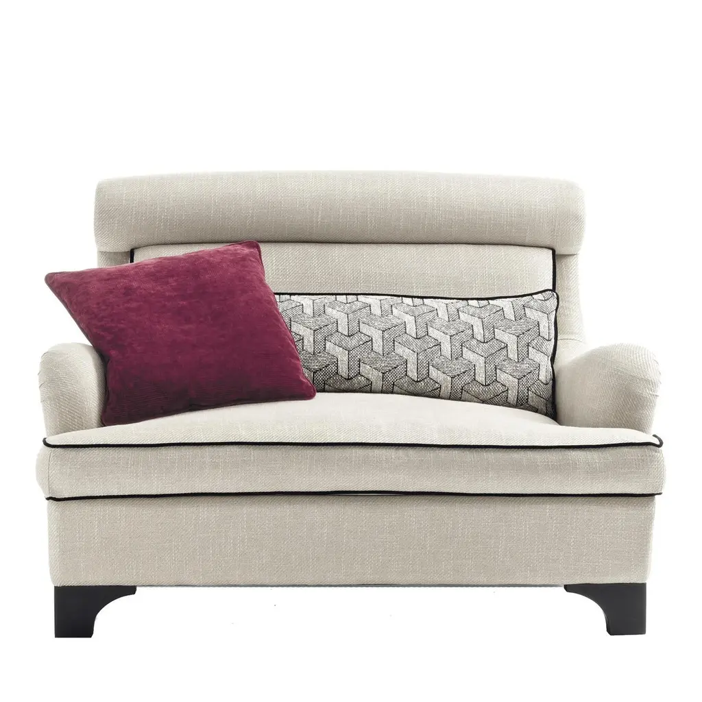 This armchair is a celebration of Classic allure and contemporary flair. Perfectly at ease by the fireplace in a living room, or next to a bookcase in a private study, this piece is both cozy and sophisticated. Its multi-plywood frame features elastic suspensions and high-density polyurethane foam cushions. Soft goose down filling are added to the seat for extra comfort, along with the elegant curves of the armrests and the top of the reclined back. The black finish of the beechwood feet is repeated also in the contrasting piping of the white cotton upholstery. Two decorative pillows included.