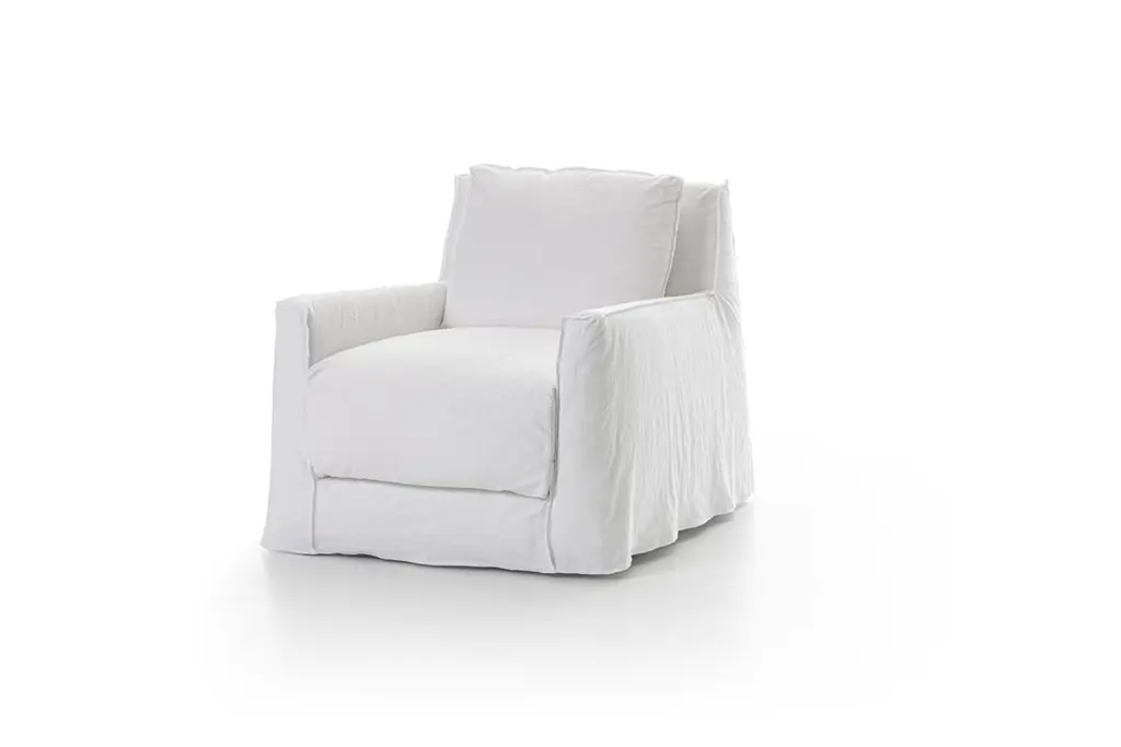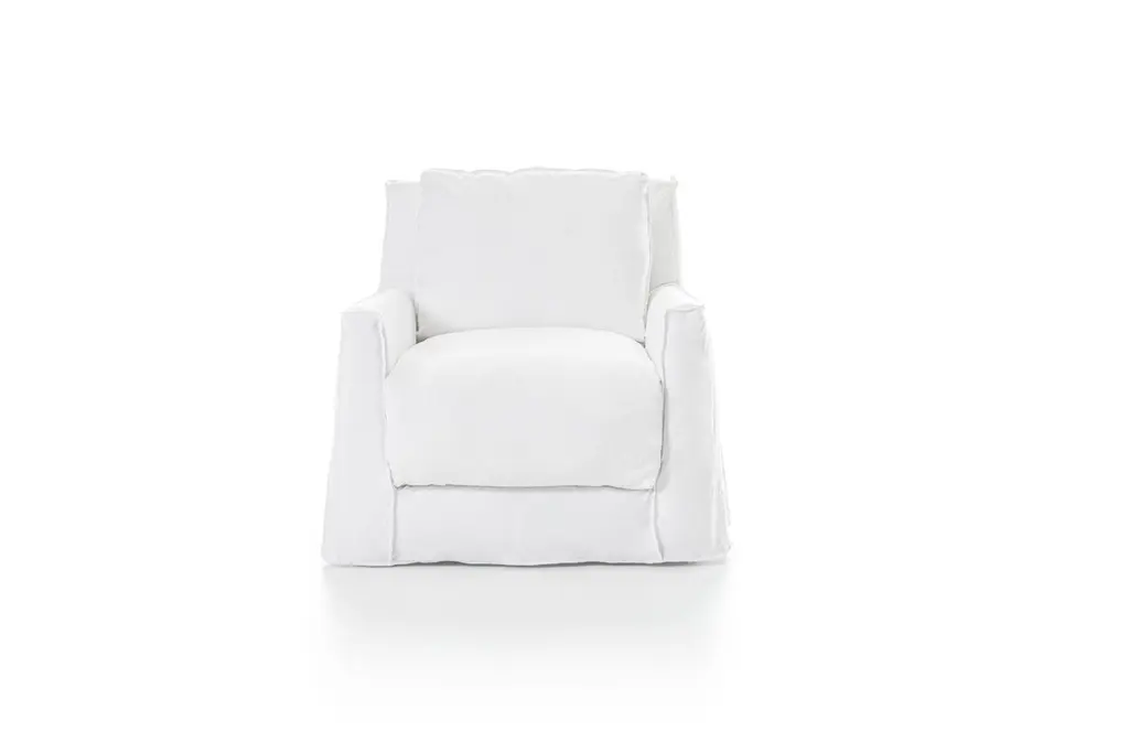 An idea of contemporary comfort is told by the LOLL 01/05 family of armchairs with a solid wood structure covered in high-density polyurethane foam. Soft lines and essential geometries are the hallmark of these armchairs with removable covers, characterised by a large seat cushion, which accentuates the softness of the product thanks to the soft layer of channelled goose down also present in the backrest.Armchair upholstered with polyurethane foams, seat and back cushions in dacron and down, removable coversAdditional Information:Material: Upholstery, foamUpholstery: Panama Cat. CDimension: 76 W x 90 D x 74 H cmSeat height: 44 cmArmrest height: 55 cmAvailable in other upholstery options: Cat. I, Cat. H, Cat. B, Cat. D, Cat. EAvailable in other structural optionsQuick Ship: Loll 05 with removable cover in lino bianco. Available with shipping the week after the order receipt, upon confirmation of availability.