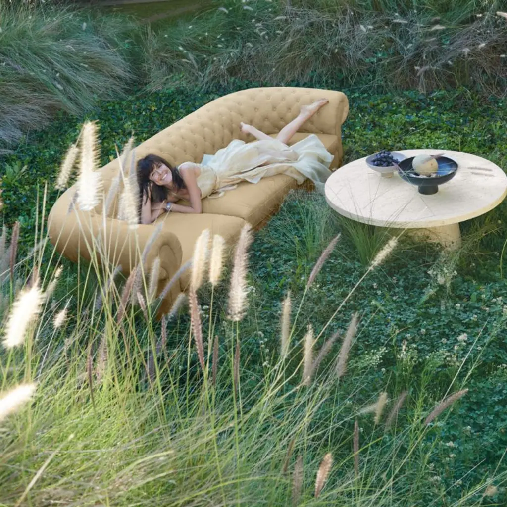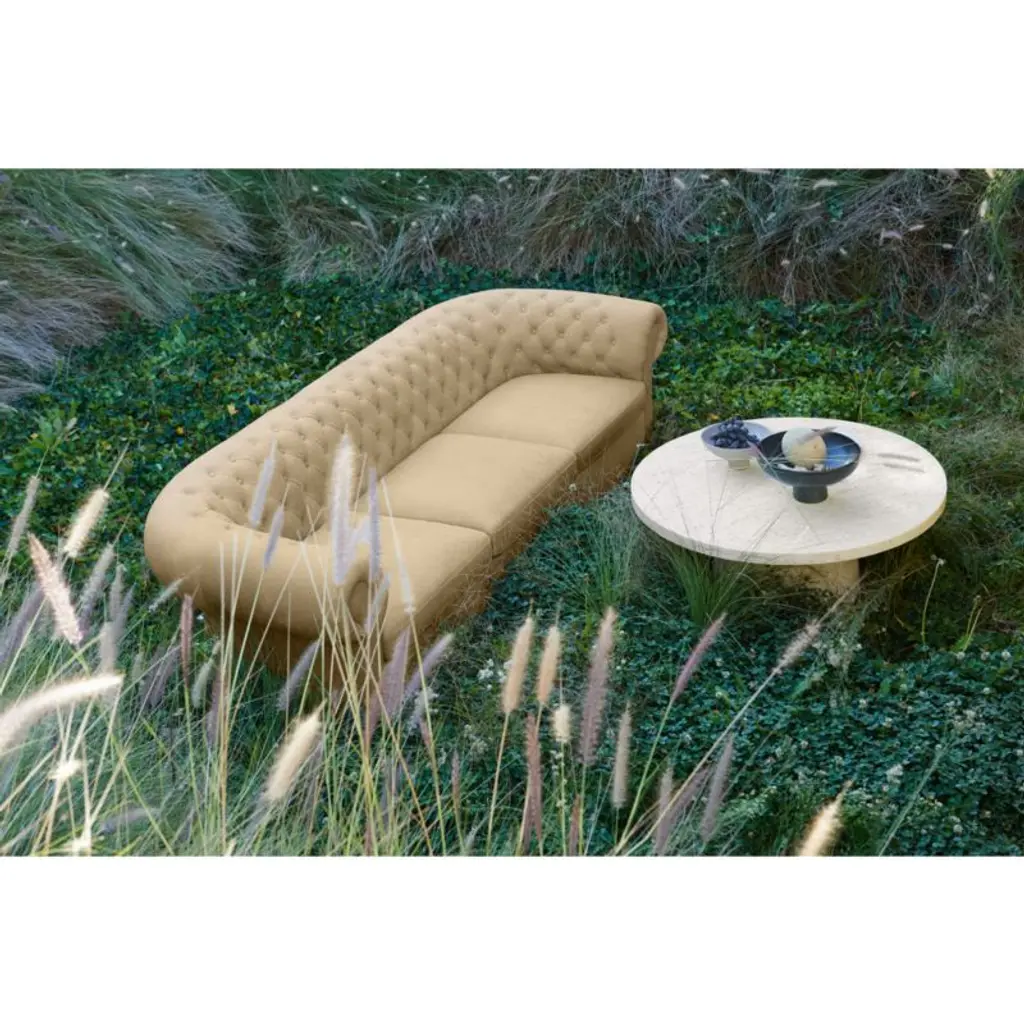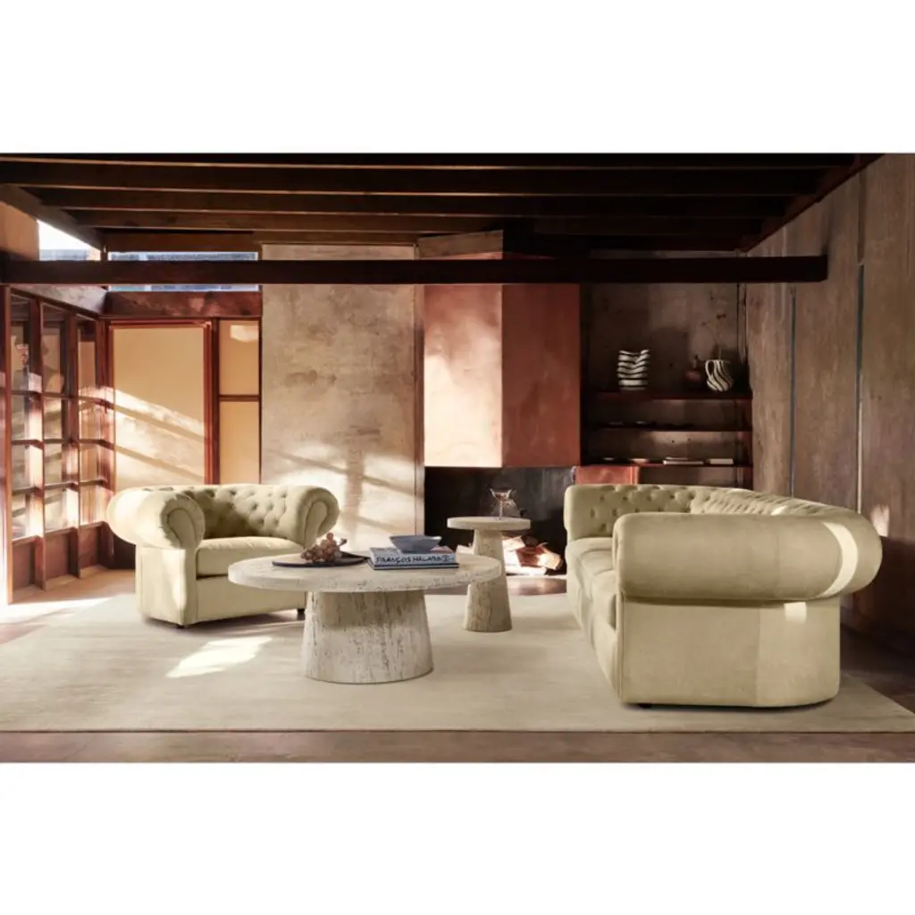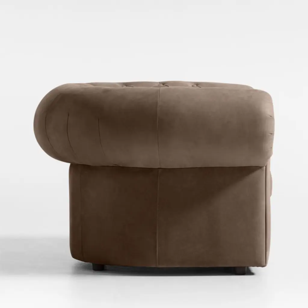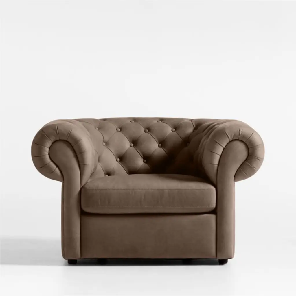 Sometimes the remix is even better. Leanne Ford's take on the timeless Chesterfield chair unwinds the clubby classic with modern simplicity. Iconic button tufting and roll arms go big and beautiful with enhanced curves and curl-up cushioning. Adding to Gig's casual ambiance is its brown burnished leathera velvety full-grain for a breezy, sun-washed look. Designed to wow from every angle, the accent chair floats in a room and gives you options for flexible layouts.Our hit collaboration with designer Leanne Ford continues with the exclusive Origins Collection, introducing fresh designs for the whole home. From layered neutrals to dreamy curves to a little rock-and-roll edge, it's everything that makes the designer a star.