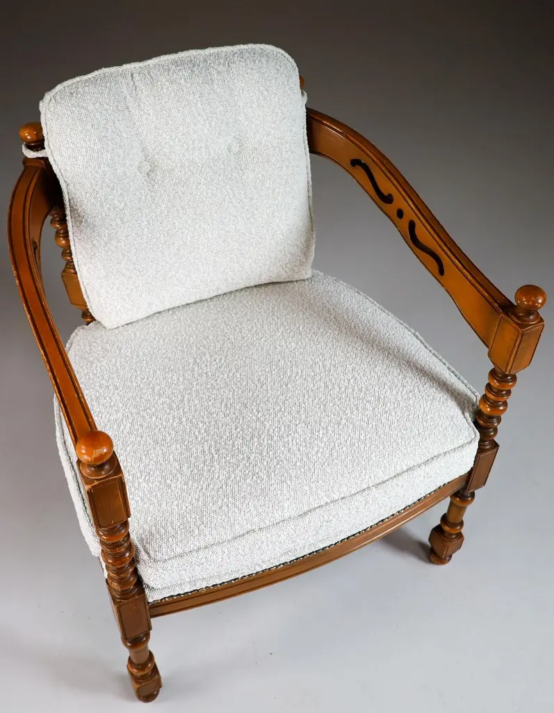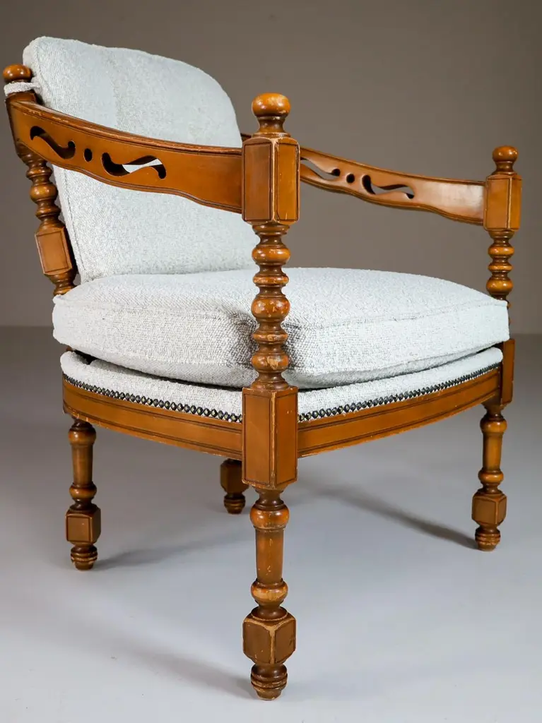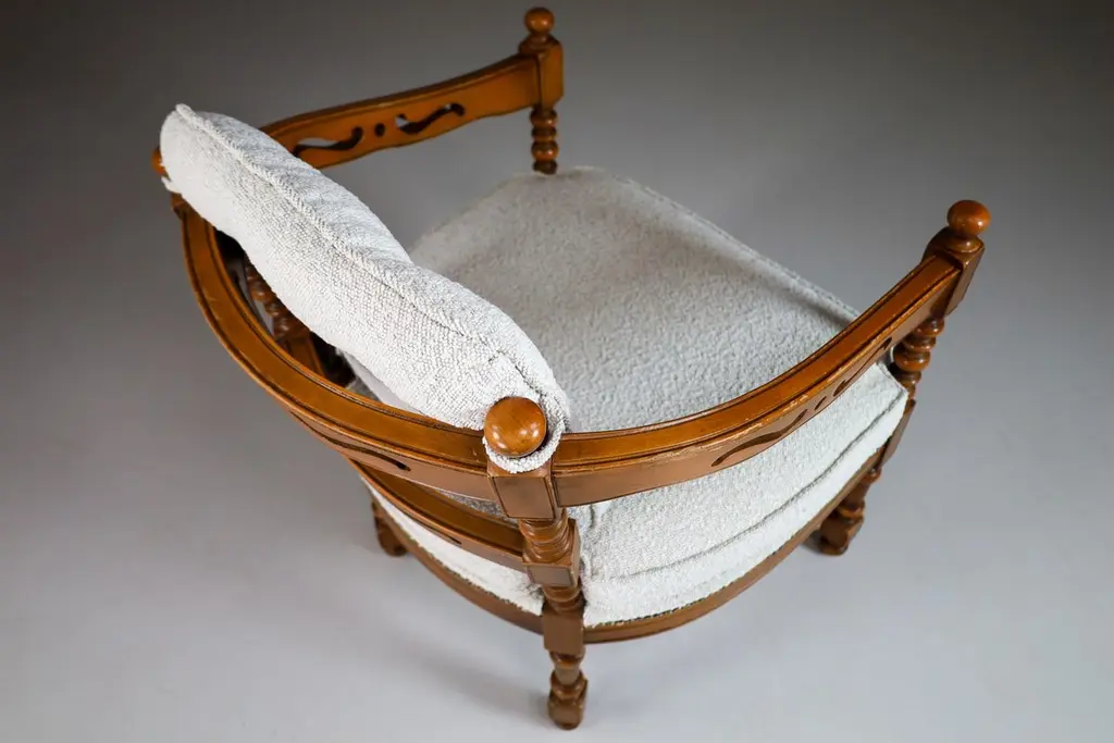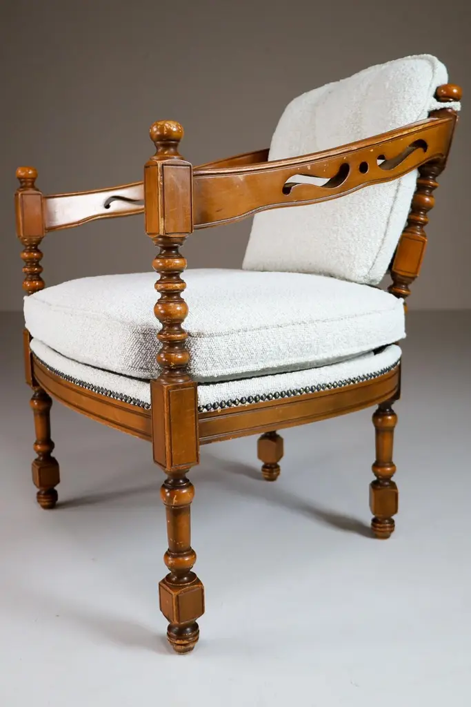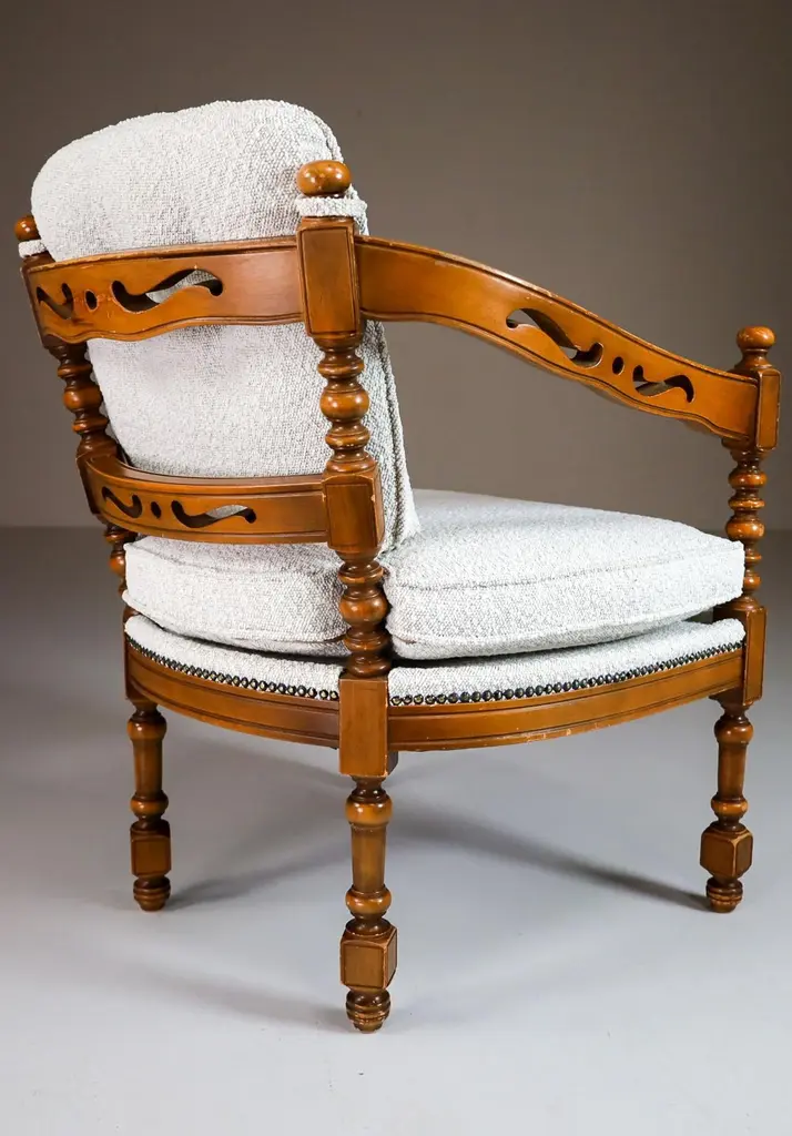 Iconic classical / Art Deco style arm / easy chair made in the '70s from the famous Gallery collection by Giorgetti with professionally reupholstered in bouclé wool fabric. This armchair would make an eye-catching addition to any interior such as living room, family room, screening room or even in the office. It also perfectly fits in a hospitality or corporate location like a boutique hotel lobby, cocktail bar, members club or in a luxury boutique. Patina on wood parts, wood in good shape.3 Chairs available, Price per chair.