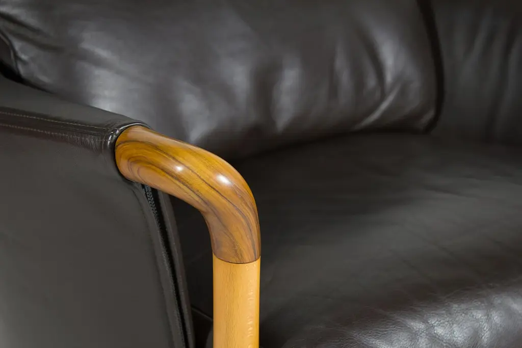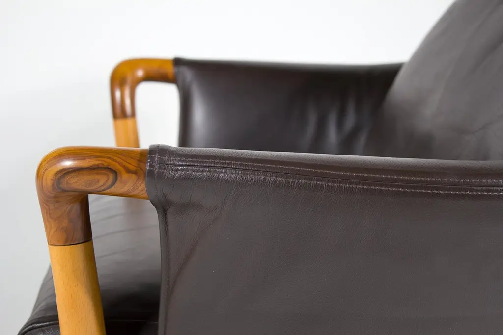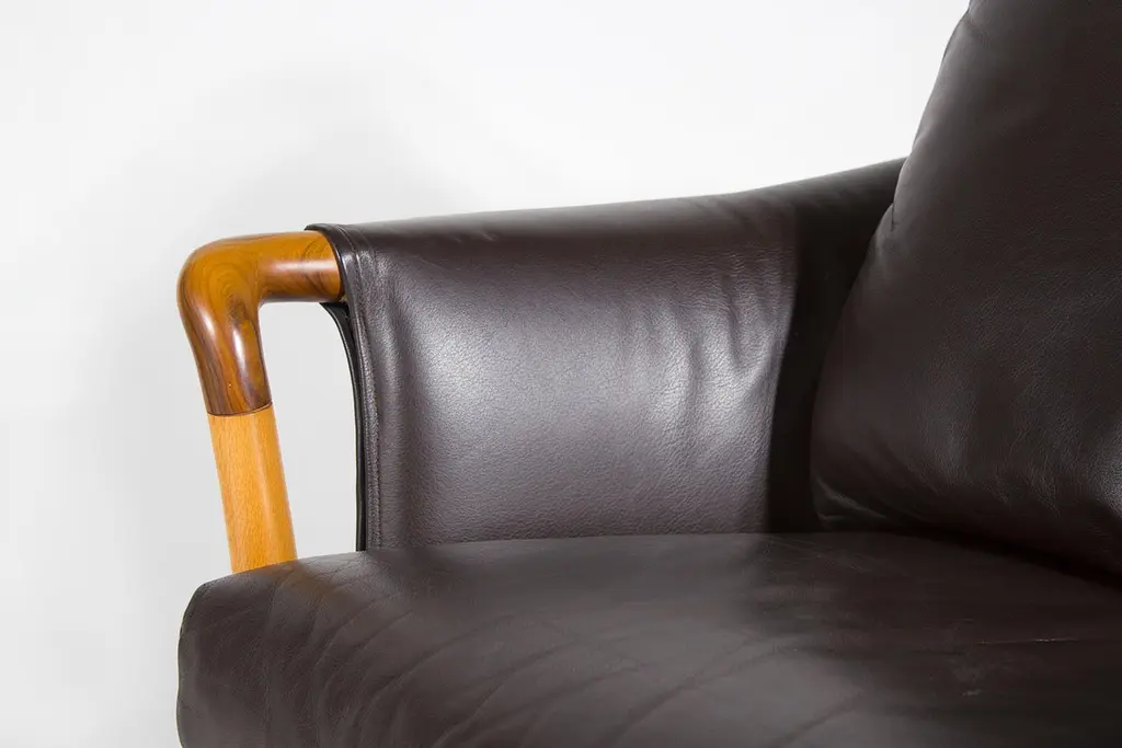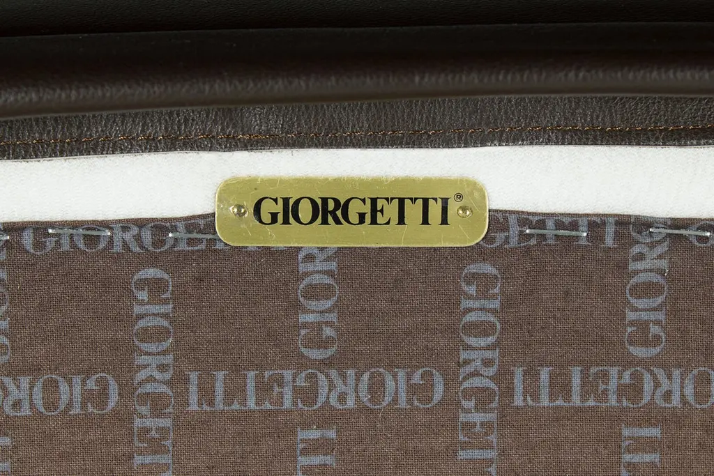 We have two pairs available. The list price is for one Pair.Designed by Centro Ricerche Giorgetti. The "Peggy" Armchairs are the most exquisite form in the Progetti Series developed in 1996. These chairs are from an important private collection and have been very well preserved. They are upholstered in the original chocolate brown leather and the down-filled back cushions are very comfortable and resilient. The armrests are crafted from Pau Ferro and the legs from Beechwood.