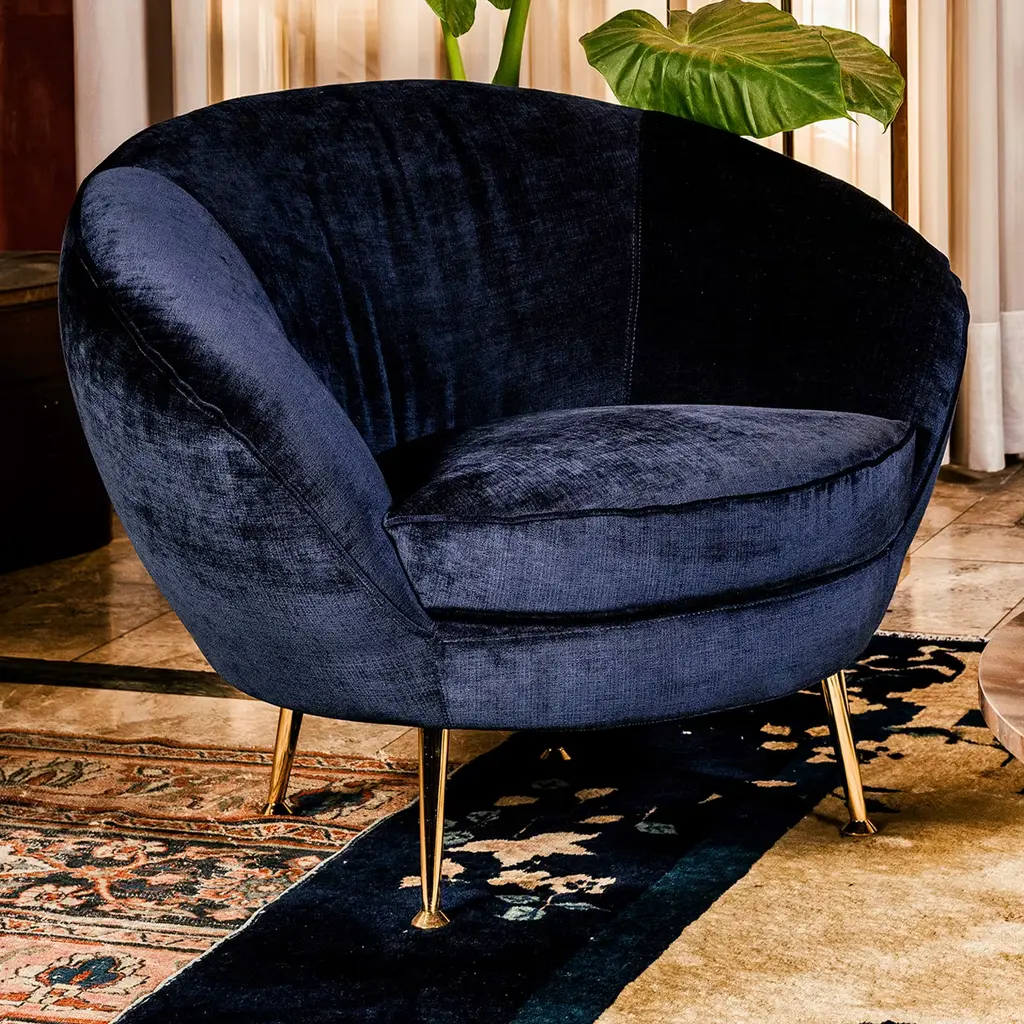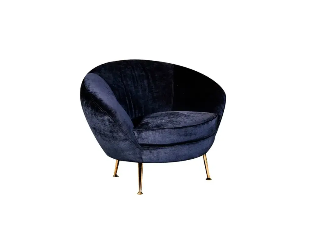 Elegant and beautifully proportioned, this armchair has a beechwood frame and is upholstered with a striking blue velvet fabric that enhances its sinuous silhouette. Entirely padded with expanded polyurethane, it is supported by four slanted metal legs with a golden finish and semi-spherical feet, that add a modern flair. This armchair will provide both a sophisticated look and a welcoming embrace in any decor. Legs finish available also in dark bronze matte galvanic. Seat cushion with removable cover. Contract and commercial certifications are available upon request.