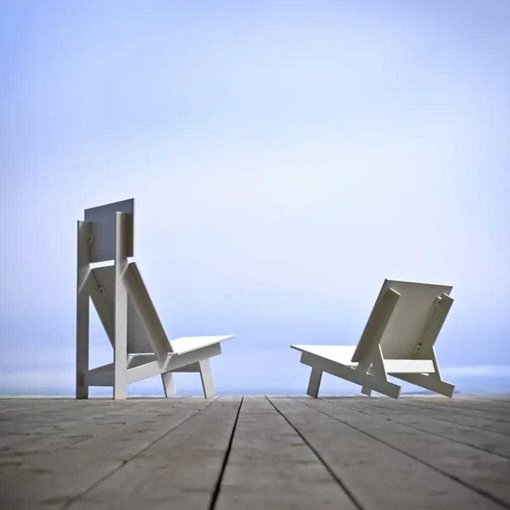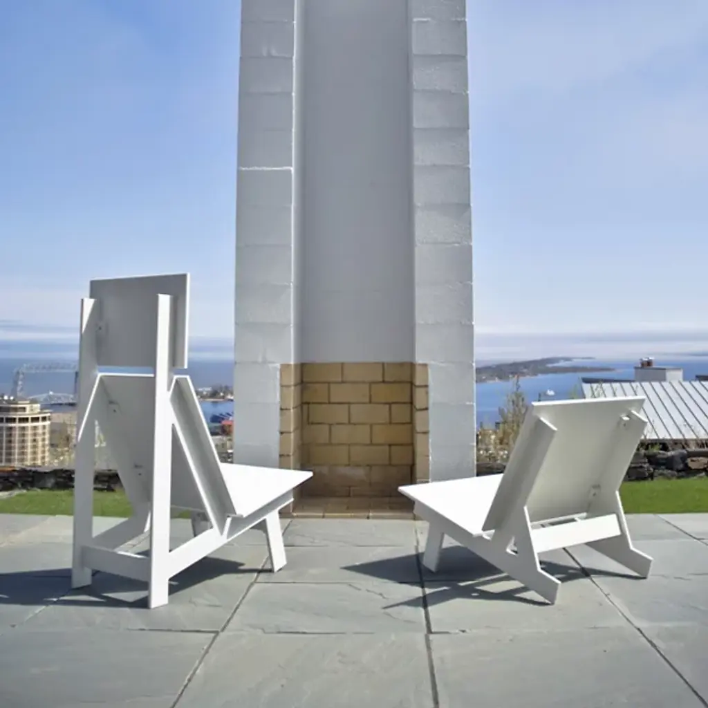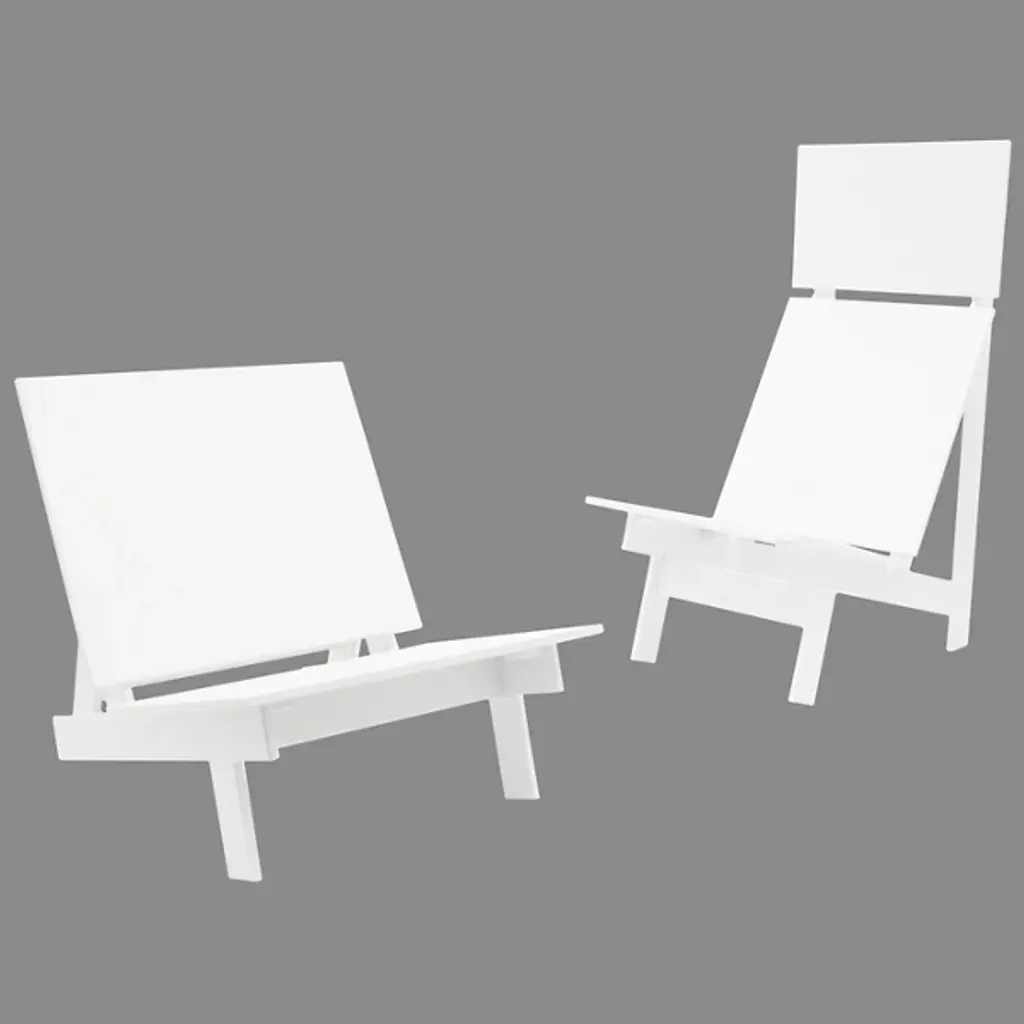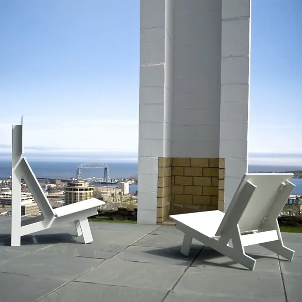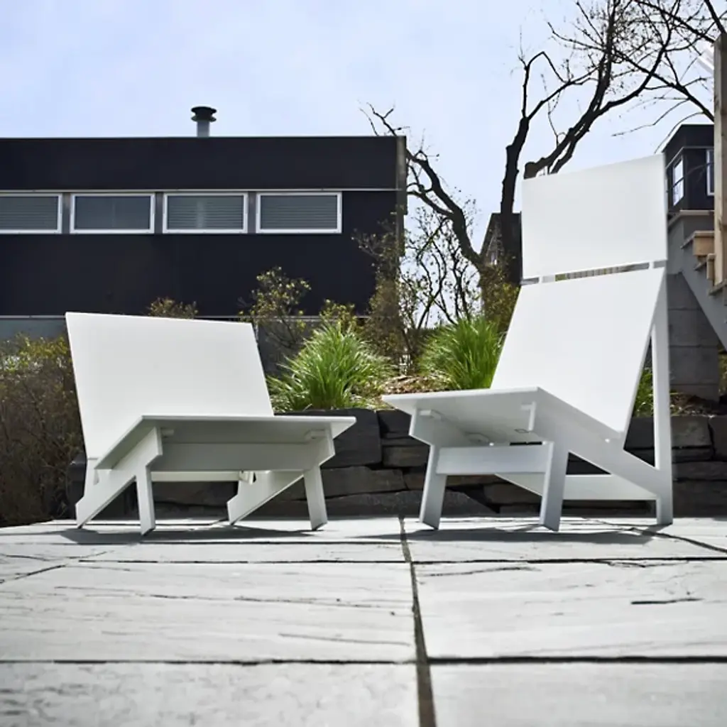 The Loll Designs Gladys Outdoor Lounge Chair is a taller, leaner translation of the low Taavi Lounge. Gladys speaks the same language as her Finnish-inspired counterpart with her wide, angled planks made of recycled milk jugs and non-recycled HDPE. The vertical headrest gives Gladys her heightened profile, and is surprisingly comfortable. Designed by David Salmela.