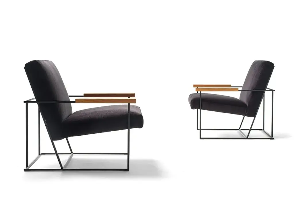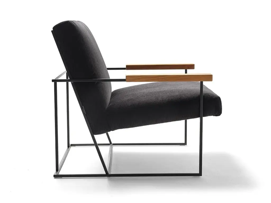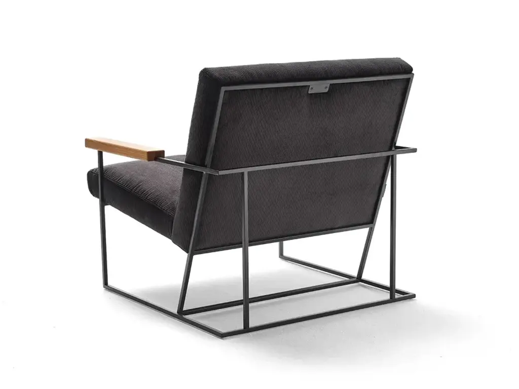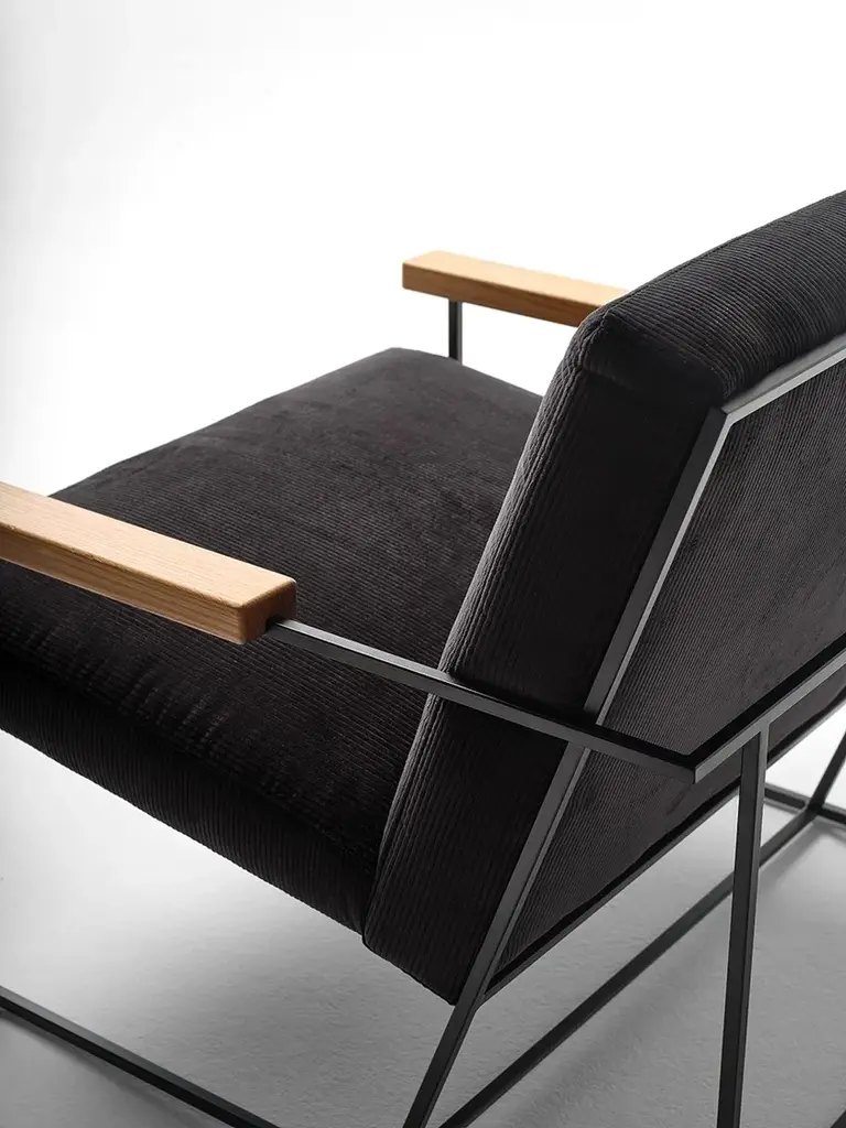 The distinctive linear geometry and the visual lightness of the Gotham sofa come from its metal frame, a clean aerial structure that holds the seat and backrest cushions. These in contrast are generous and voluminous thus creating a visual juxtaposition between the supporting base and the upholstered elements, between structural need and seating comfort. We often upholster the cushions with panno Casentino, the traditional Tuscan wool historically used in the garment industry and introduced by Eponimo into the world of contemporary furniture. A great alternative is our cotton corduroy as the three-dimensional texture of the fabric matches the linear geometry of the armchair’s metal structure. Materials:Grey cadet or black painted steel structure (other colors are available upon request),solid oak armrests, polyurethane cushions with covers in casentino wool, cotton velvet, cotton corduroy, anilina leather or customer fabric.