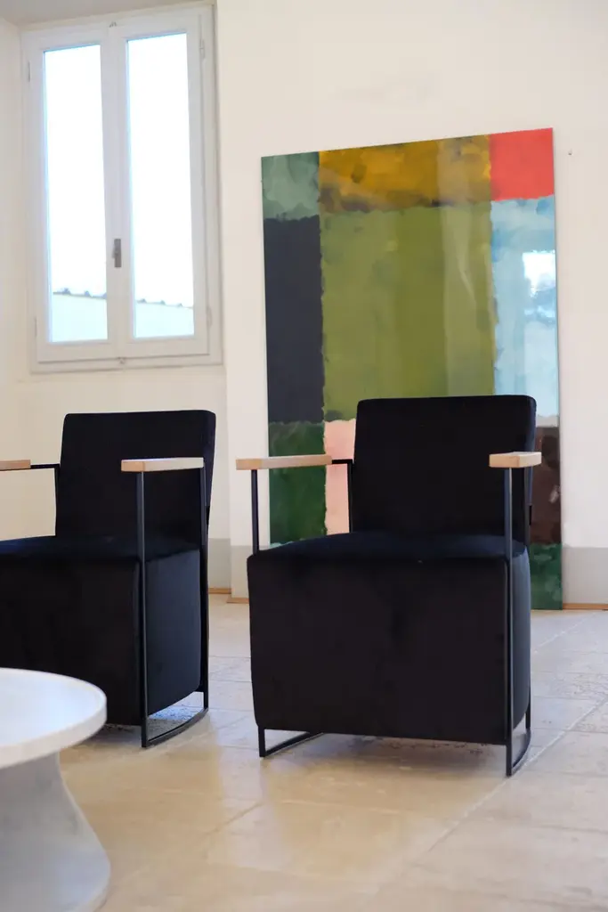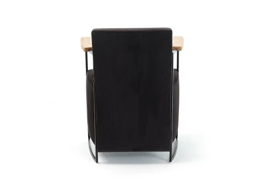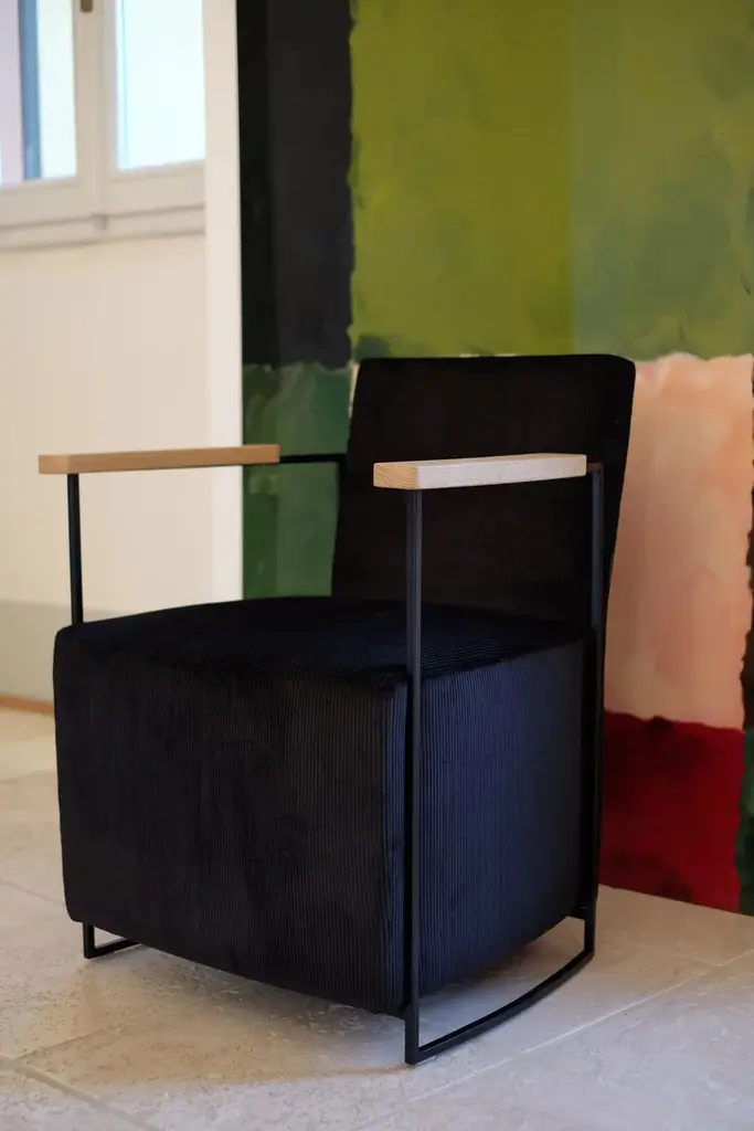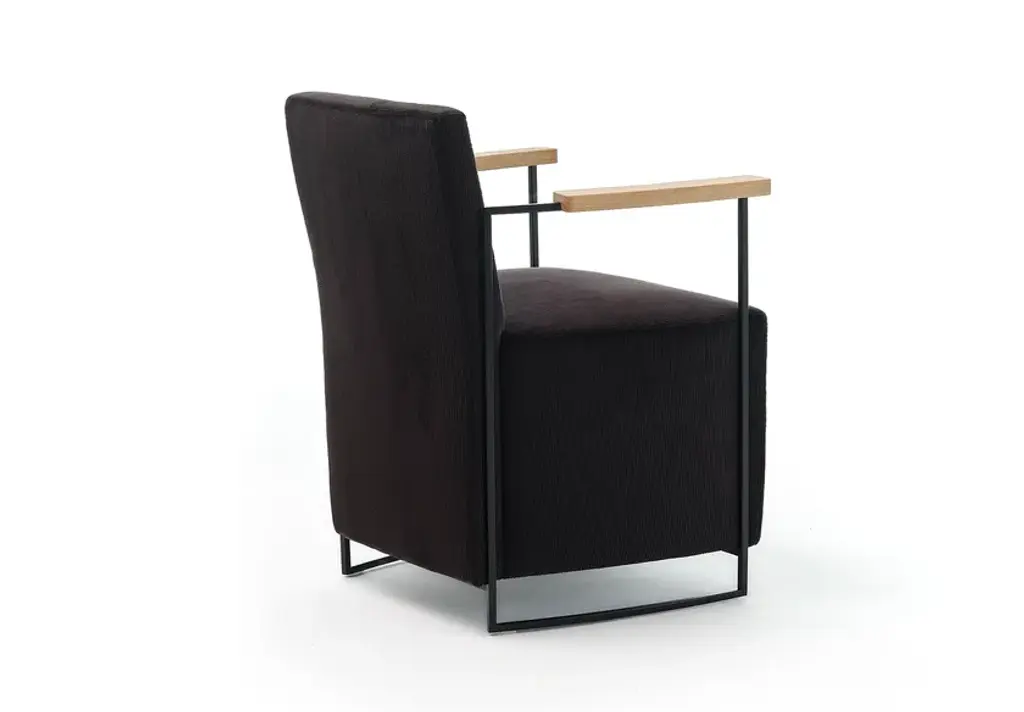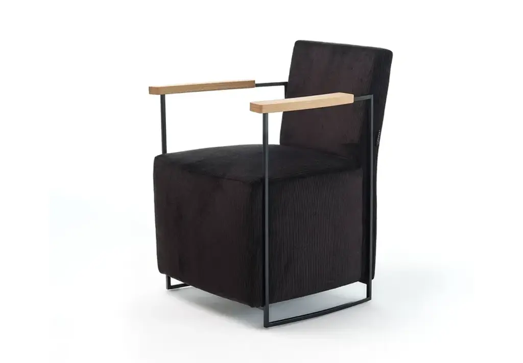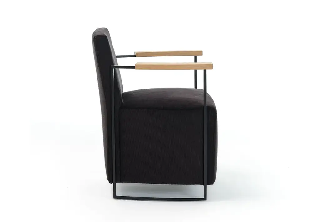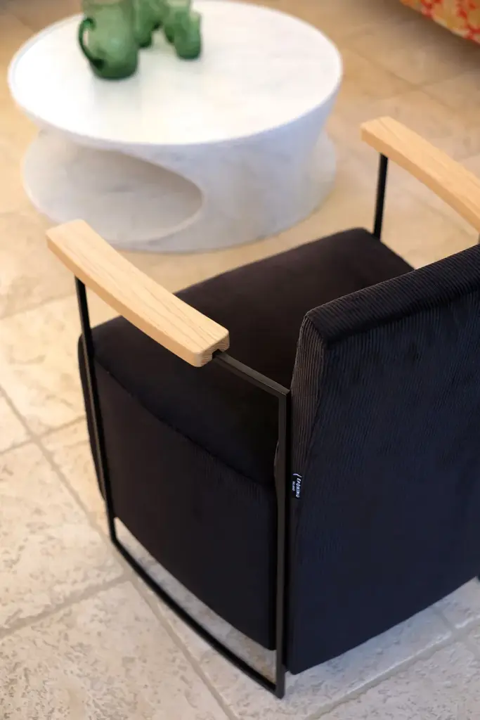 Gotham is an armchair with a painted steel frame, solid oak armrests, and cushions in polyurethane upholstered in Casentino wool, cotton velvet, or corduroy.It is the smaller sister of the original Gotham armchair and, while it shares its aesthetic and structural principles, it introduces two new elements into the formal language of the Gotham family: curved lines in the metal frame and exaggerated, voluminous padded textile parts. These elements give the armchair a playful and inviting character, while preserving the visual contrast that is the distinctive stylistic hallmark of all Gotham seating. This contrast is intentional and further enhanced by the oak armrests, which not only serve an important ergonomic function but also introduce a third formal and material language.We can upholster Gotham seating with any fabric, but the ones that best highlight its character are Casentino wool—a traditional Tuscan wool fabric historically used for clothing and introduced by Epònimo into the world of contemporary furniture—and cotton corduroy. The steel structure is also color-coordinated with the padded elements, either to complement them or to create an additional harmonious contrast.Despite its compact dimensions, the new Gotham armchair offers an excellent level of comfort.