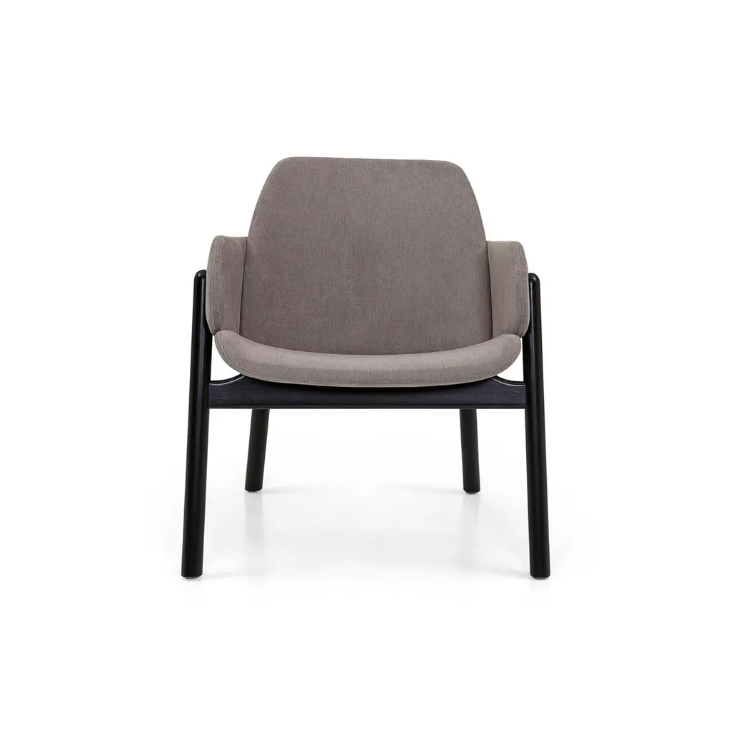 An Above armchair by Uultis with black matte finish and gray fabric. Please check availability prior to purchase.The Above armchair brings a perfect fusion of design and comfort, showcasing a sleek black matte finish frame paired with sophisticated gray fabric upholstery. Ideal for contemporary or minimalist interiors, this armchair enhances any space with its clean lines and modern aesthetic. The high-quality Gray Plain Weave fabric adds both elegance and durability, making it suitable for residential and commercial use. Crafted with comfort in mind, the Above chair features a reclined seat and curved back supported by multi-laminated engineered wood, all wrapped in high-density foam. This ensures optimal seating for extended periods of relaxation, whether you're watching TV, reading, or enjoying a cup of coffee. Its very firm comfort level provides the right amount of support without sacrificing style. The Above armchair is designed to blend effortlessly into various spaces like living rooms, offices, and waiting areas. Its fully assembled design makes it a convenient choice, requiring no additional setup. Whether used as a stand-alone piece or paired with other contemporary furniture, it adds both functionality and visual interest to any setting. Perfect for homes or commercial environments, the Above armchair reflects a commitment to sustainability with environmentally friendly materials, offering both form and function without compromise. Its sturdy construction and sleek design ensure it will last for years to come, while adding a touch of modern luxury to your space.