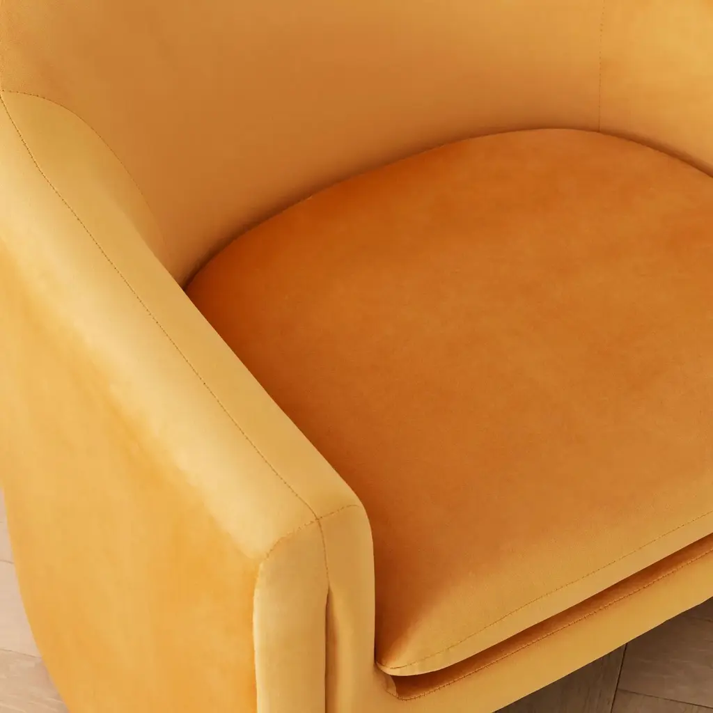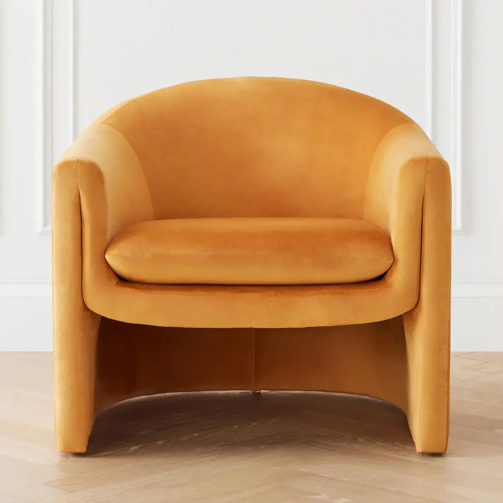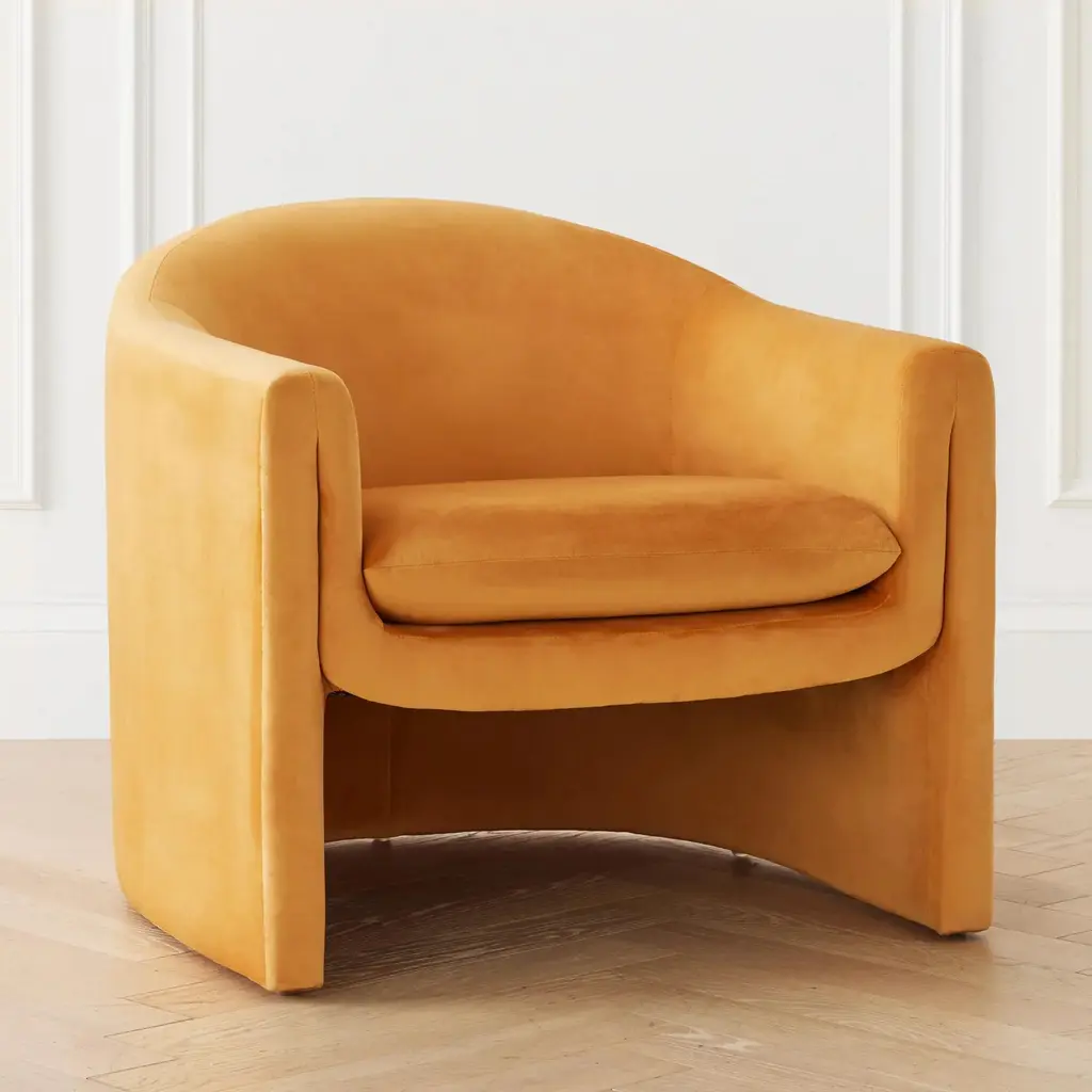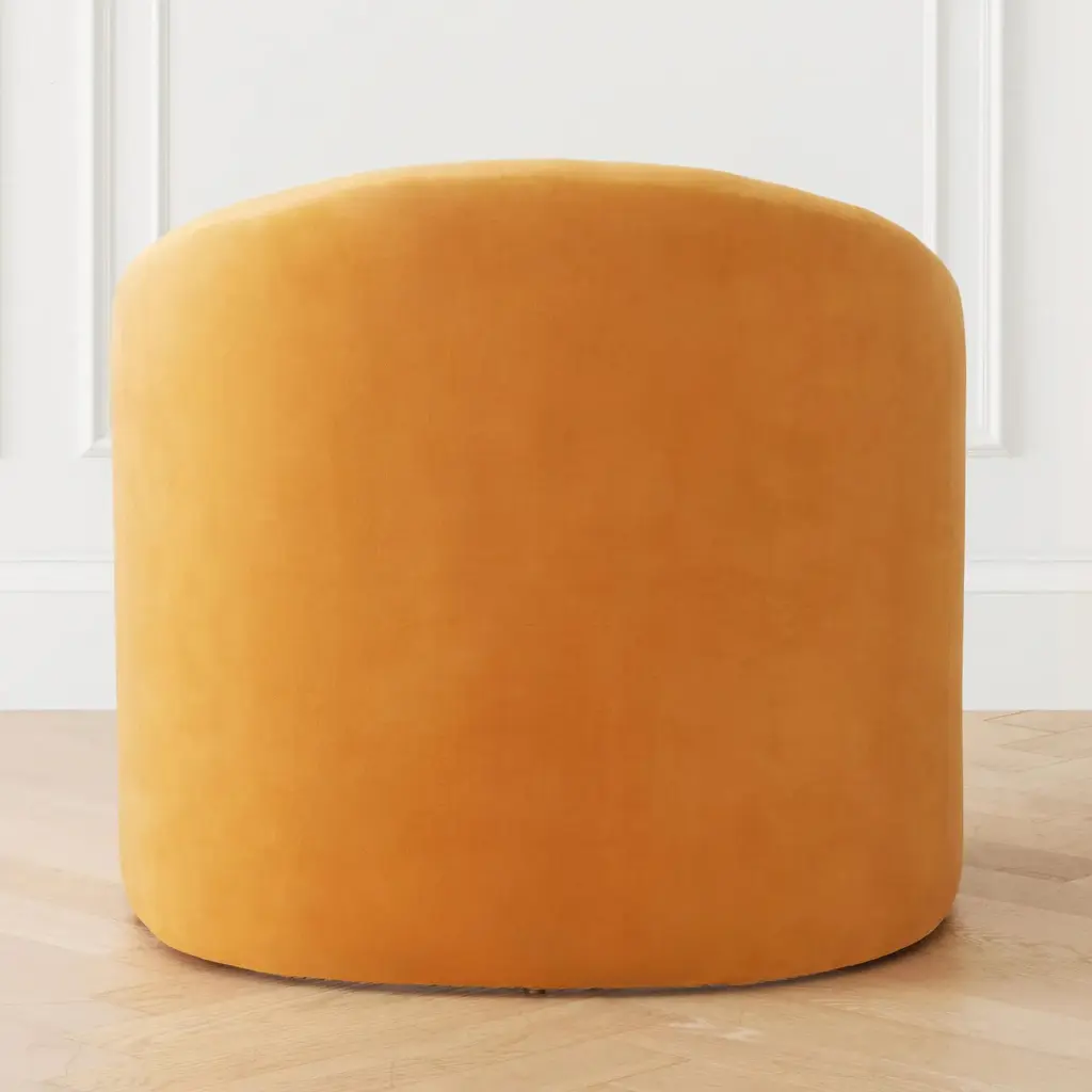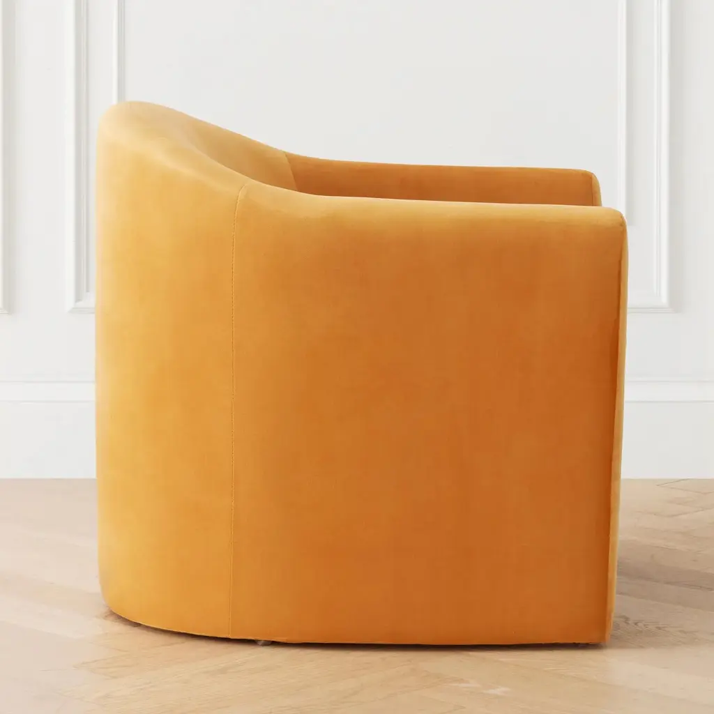 With its plush velvet upholstery and modern, sculptural silhouette, this barrel-back accent chair makes a standout addition to any space.