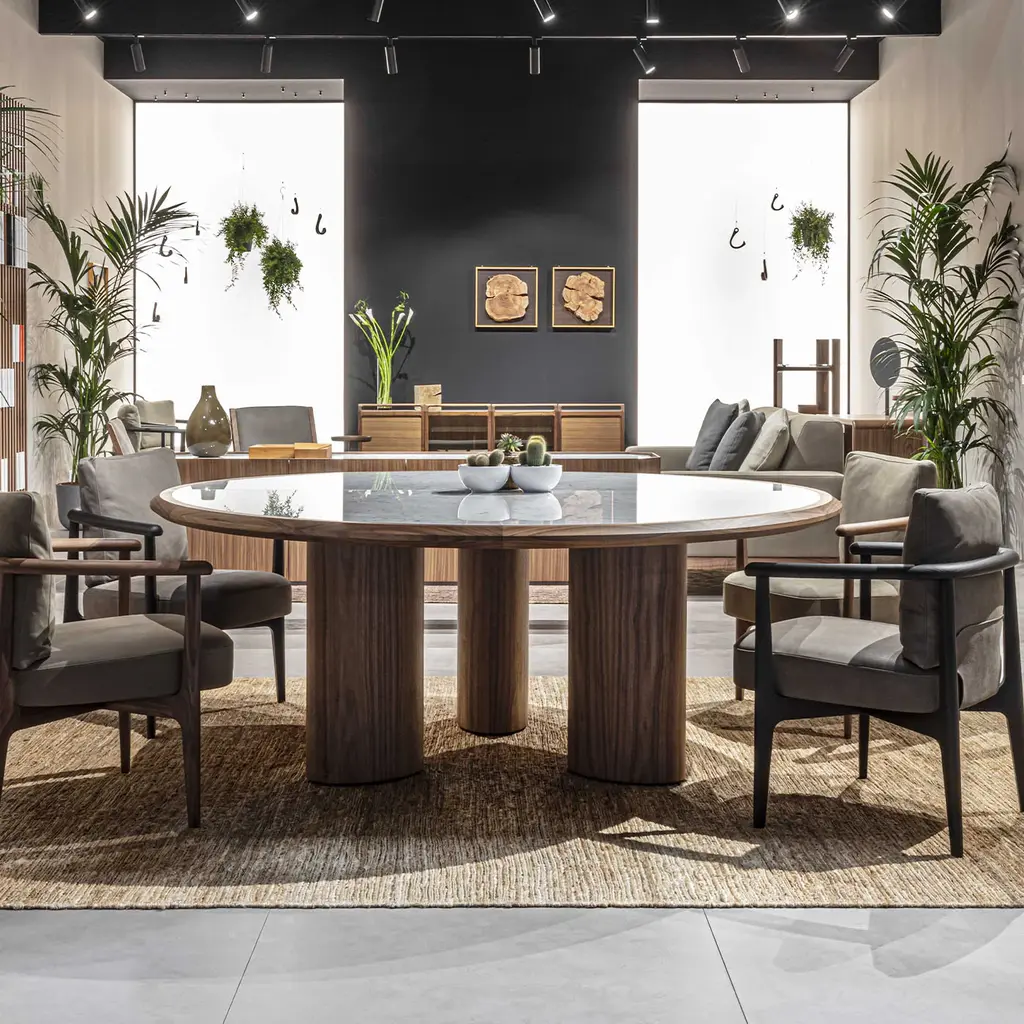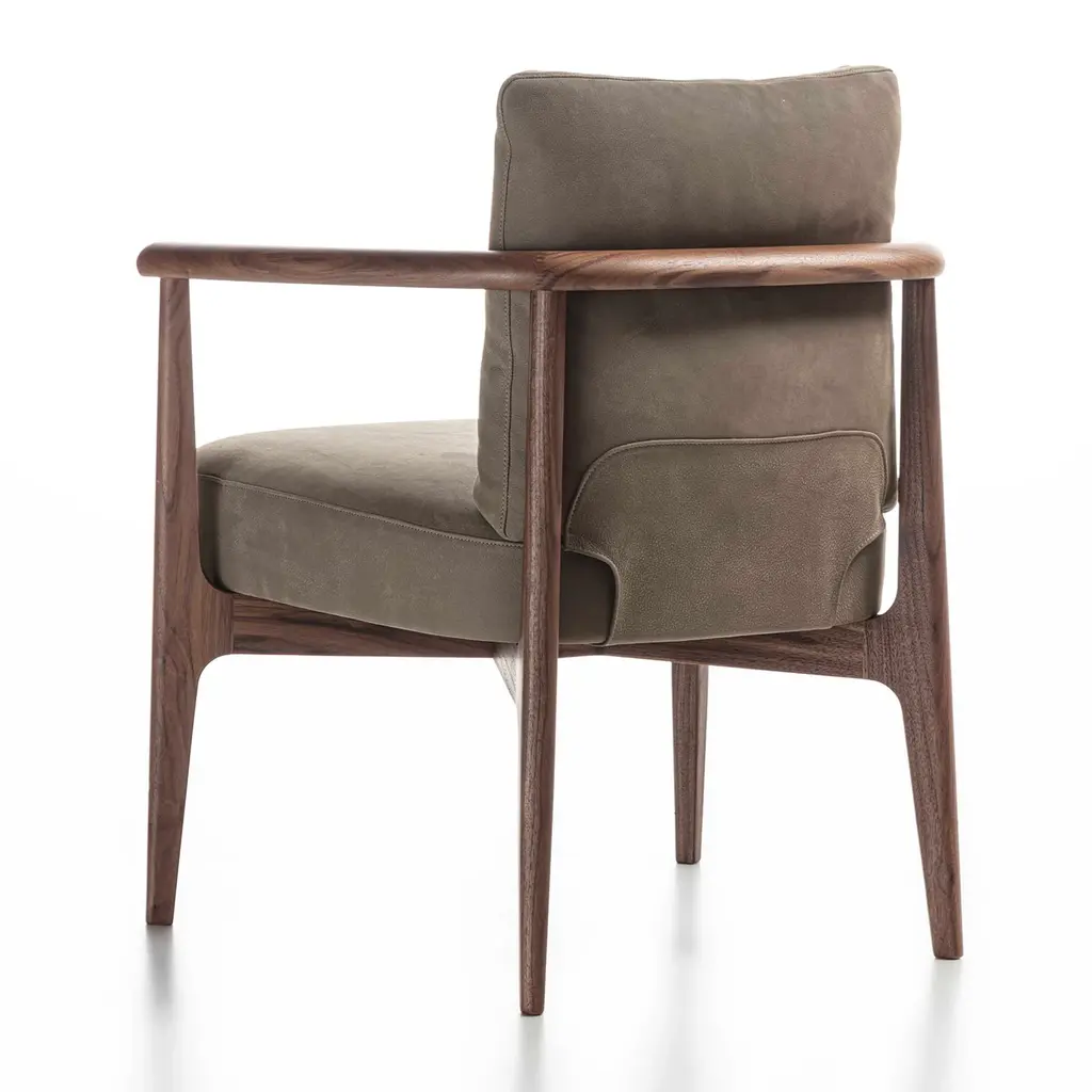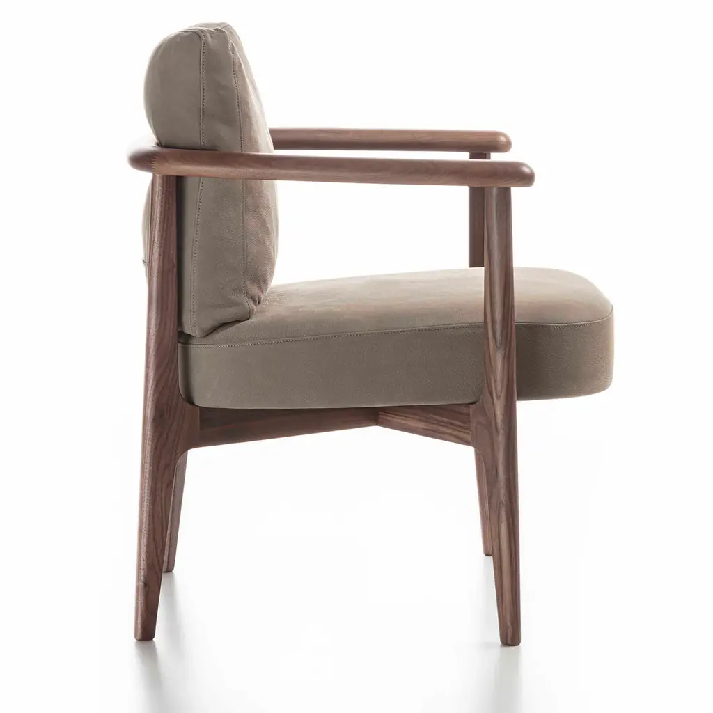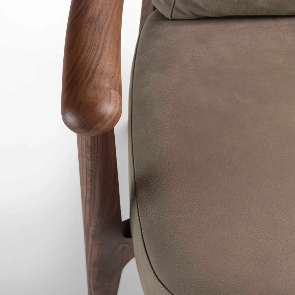 This stunning armchair in solid Canaletto walnut exemplifies modern sophistication with its harmonious curves and timeless neutral tones. The 45cm-high seat and backrest - embraced by a fully-enveloping back that flows into the armrests (H 63cm) - are generously stuffed and upholstered in prized taupe-hued leather for an unrivaled seating experience.
