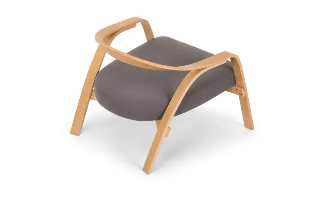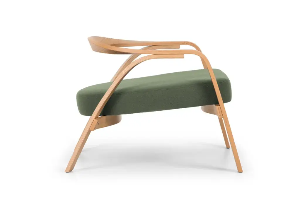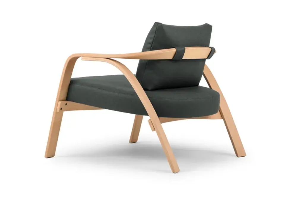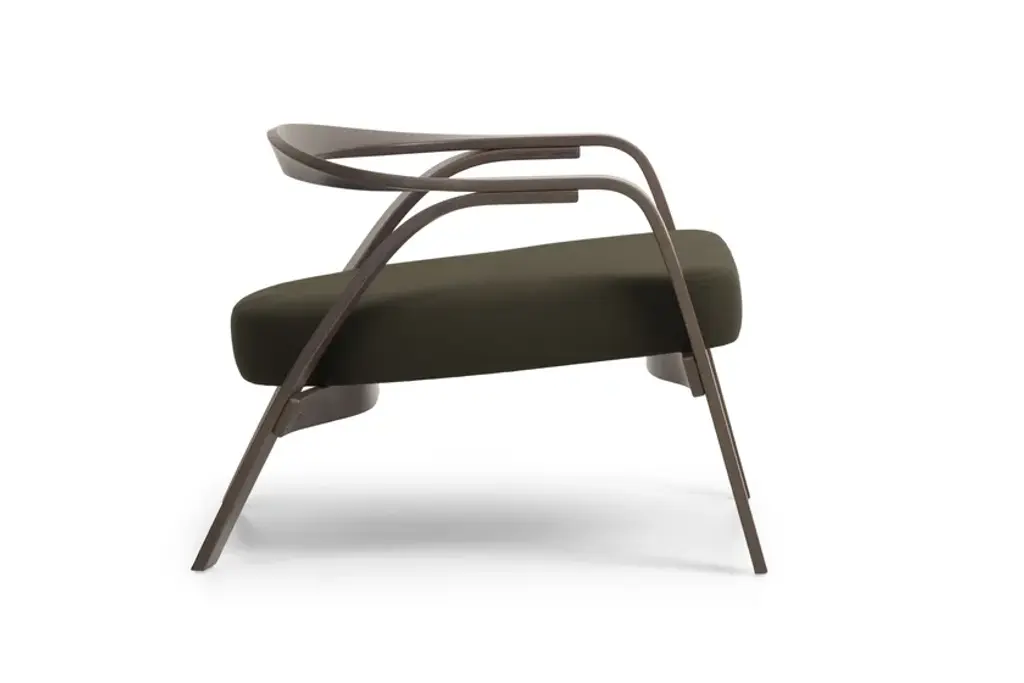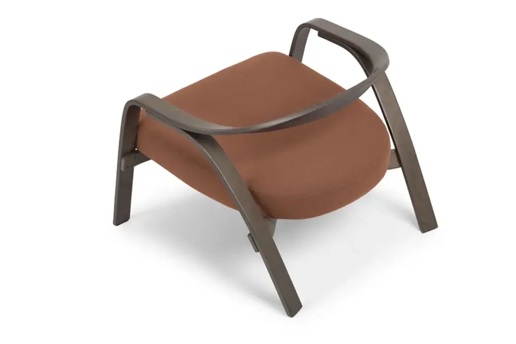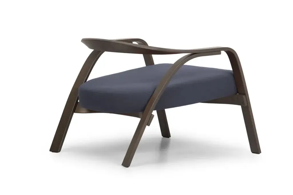A lounge armchair with curved wooden frame.Grillo is defined by the contrast between the structure, the paws, dynamic and characterized by stretched curves and counterposed arches, gathering with the seat in between, juxtaposed.The contrast between the colors and the materials is the main aesthetic feature of this collection.The thermo curved wooden element, without ever changing its section but only through calibrated torsions, creates the foot, the armrest and the backrest as a unique line moving through the space.Frame in multilayer beechwood, 18mm thick, veneered in beechwood or other essences; flexible foam padding seats. Removable backrest cushion available. Upholstery in fabric or leather (see color chart).