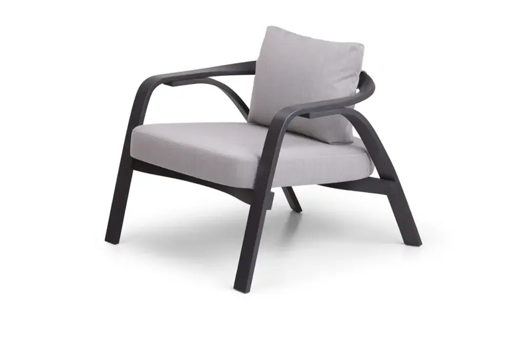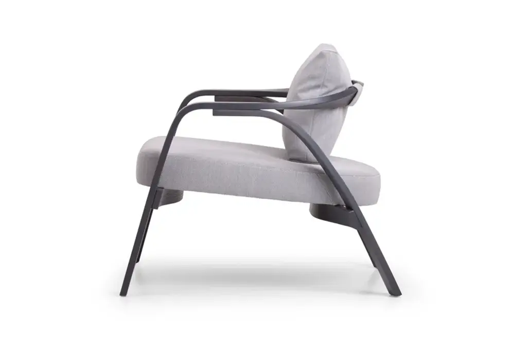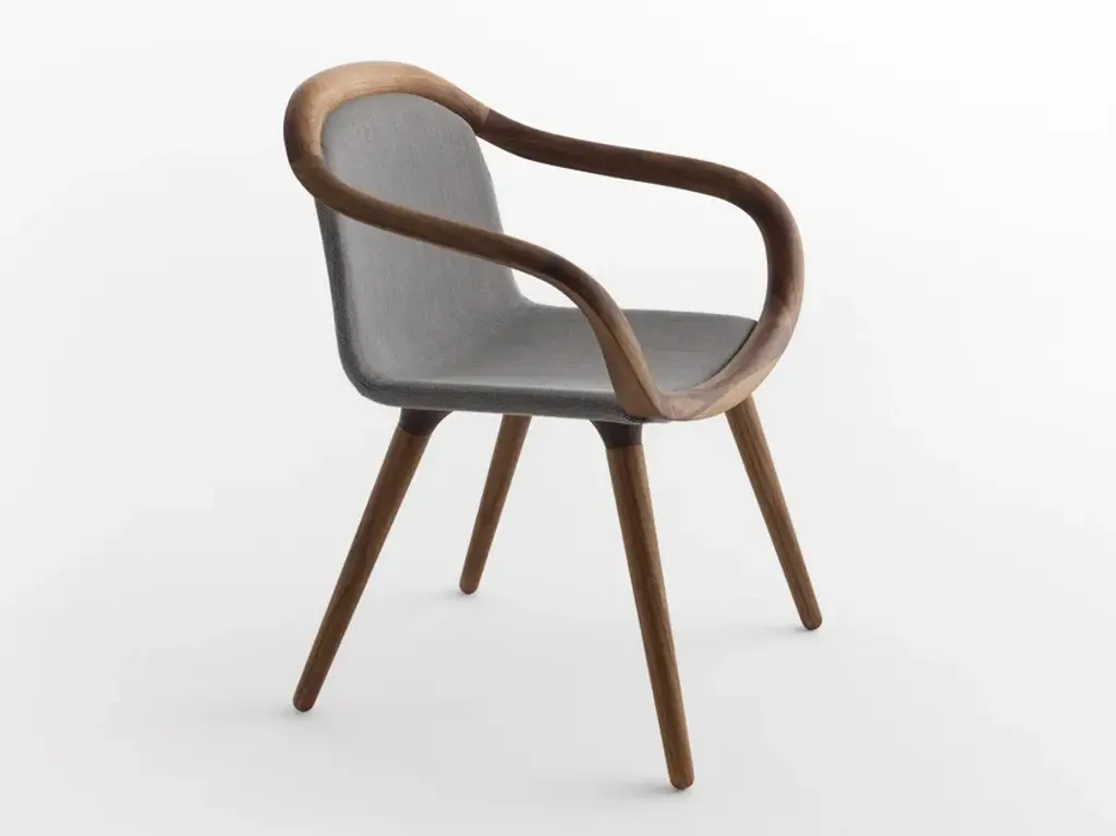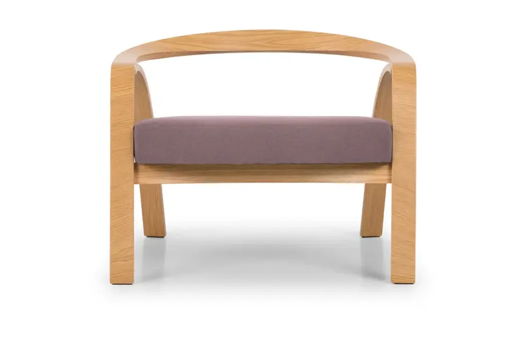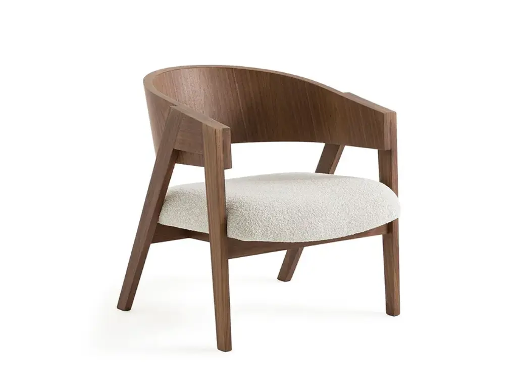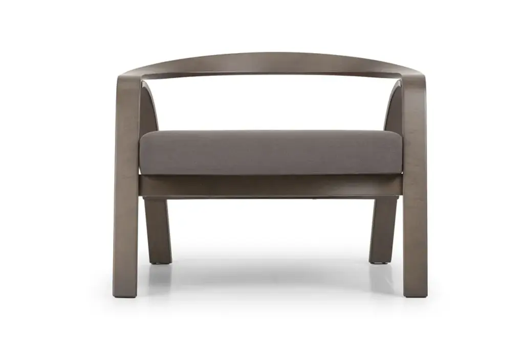A lounge armchair with curved wooden frame.Grillo is defined by the contrast between the structure, the paws, dynamic and characterized by stretched curves and counterposed arches, gathering with the seat in between, juxtaposed.The contrast between the colors and the materials is the main aesthetic feature of this collection.The thermo curved wooden element, without ever changing its section but only through calibrated torsions, creates the foot, the armrest and the backrest as a unique line moving through the space.Frame in multilayer beechwood, 18mm thick, veneered in beechwood or other essences; flexible foam padding seats. Removable backrest cushion available. Upholstery in fabric or leather (see color chart).