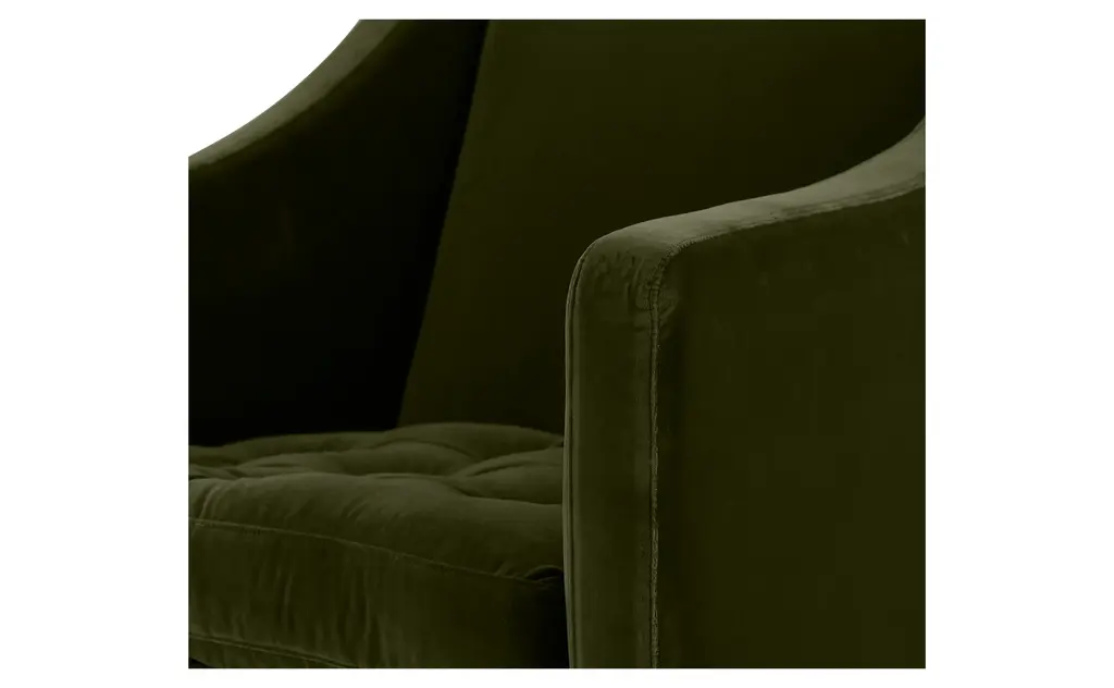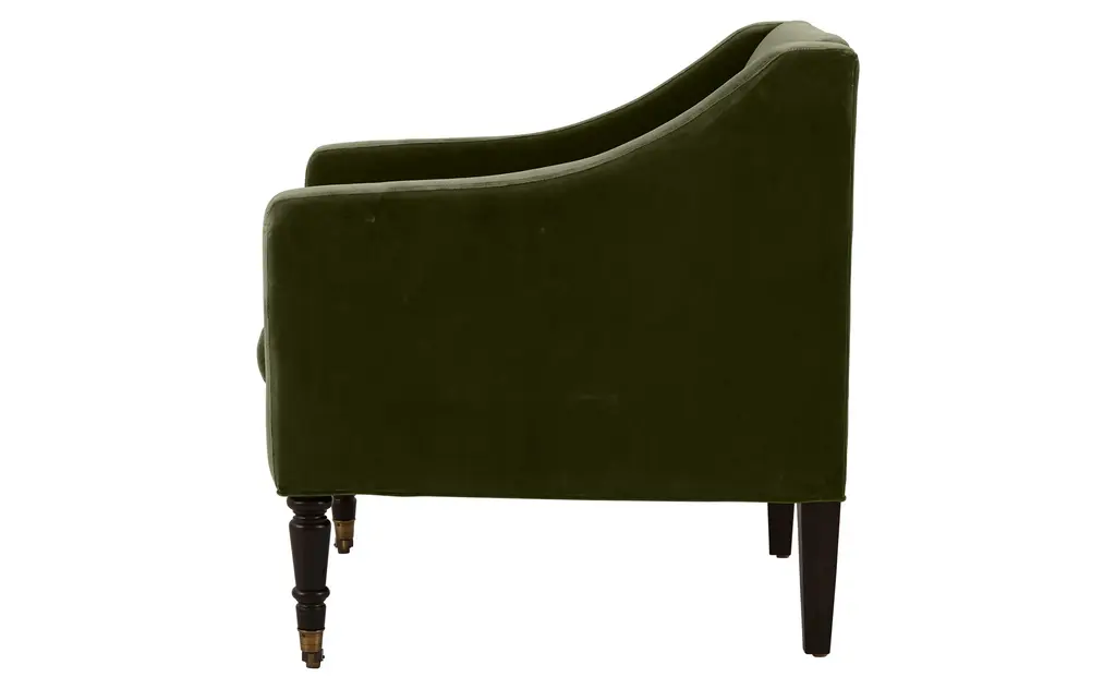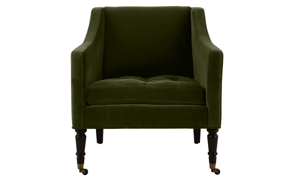 Our Gustav Chair is the epitome of refinement. Pairing a tight back with a firm, relatively shallow tufted seat cushion, handsome Gustav sits comfortably upright. Gradually sloping arms, turned black walnut legs and antique brass casters add to its classic feel. Perfect wherever a touch of European elegance is needed, we love Gustav in a sophisticated sitting room or dressing room. It's also great as a pair flanking the fireplace or facing the sofa in a dressy living room. As Shown •upholstered in marco jade velvet •ships in 6-10 weeks•fabric content: 100% cotton •black walnut wood finish•antique brass casters•includes down and feather cushion upgrade•sustainable construction•made in the USA•JH web exclusive Dimensions •overall: 31"W x 31"D x 33"H•seat width: 24"•seat depth: 21"•seat height: 19"•arm height: 26"COM yardage needed is 5 yards. If using a patterned fabric please contact us at info@jaysonhome.com or 1-800-472-1885 for yardage requirements.