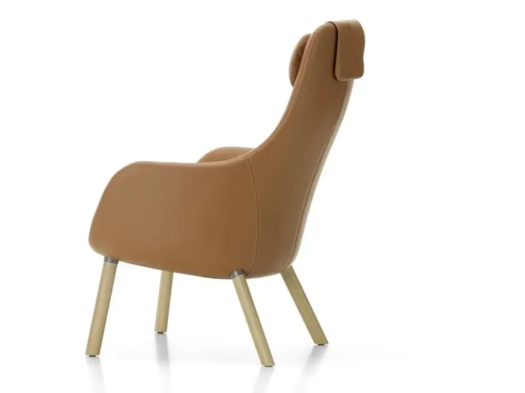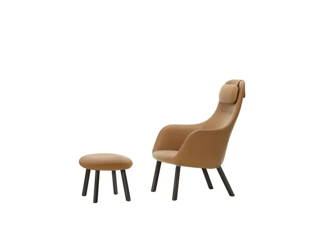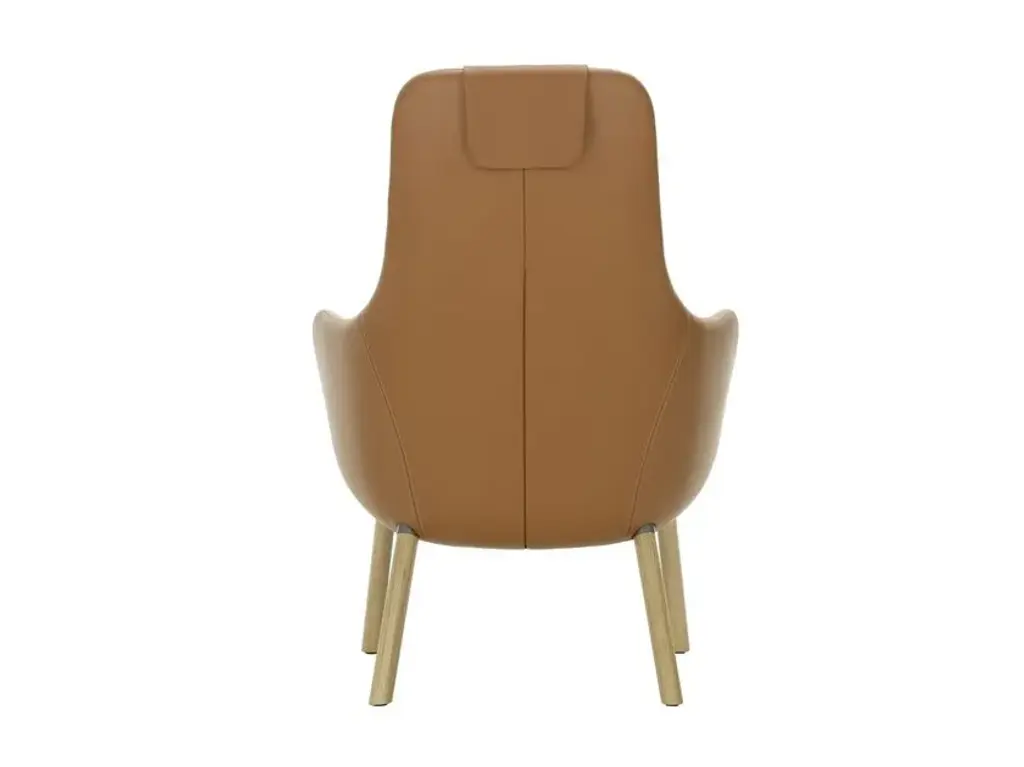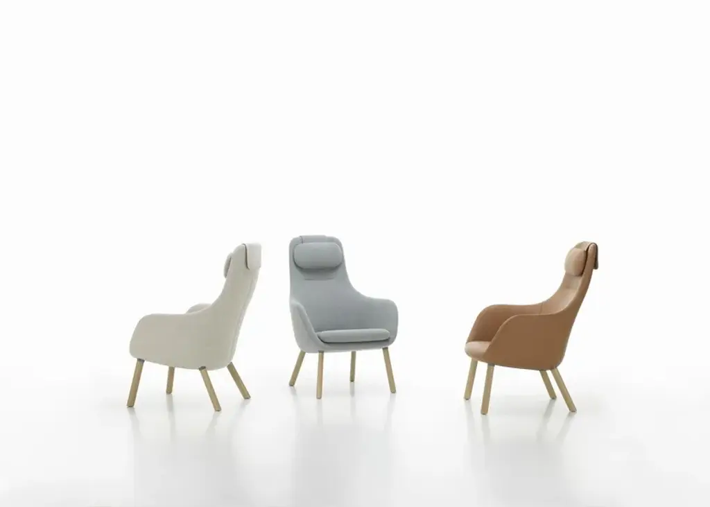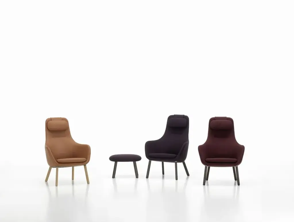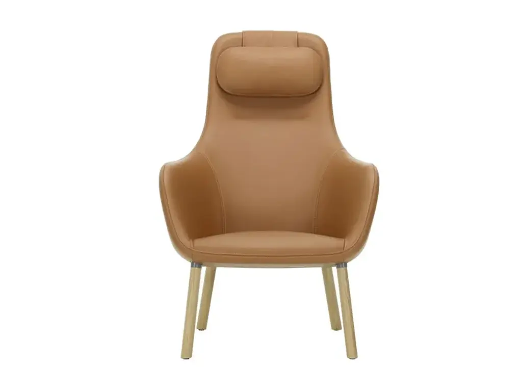 The compact HAL Lounge Chair (2021) is Jasper Morrison's reinterpretation of the softly upholstered four-legged armchair with a high backrest.Creations by Jasper Morrison are not characterised by a strikingly new or fashionable design, but instead represent the update and perfection of a familiar typology – as demonstrated with the HAL Lounge Chair, which is Morrison's reinterpretation of the upholstered four-legged armchair with a high backrest.Despite its compact dimensions, the lounge chair is exceptionally comfortable. It comes with soft loose seat and neck cushions or, if preferred, with an integrated seat cushion.Thanks to its understated aesthetic, the HAL Lounge Chair is extremely versatile, suited to use at home or in public spaces, and can stand either alone, in pairs or in groups. However, a reductive design is not synonymous with bland neutrality: Jasper Morrison's products bear his unmistakeable signature. In his hands, understatement results in creations that radiate a sense of calm, do not follow fashionable trends and therefore age well. The strength of the design becomes increasingly evident over time, when other more attention-grabbing contemporary pieces have long been forgotten.Material description- Chair/body: fibreglass-reinforced plastic shell made from post-industrial recycled ABS plastic, encased in moulded polyurethane foam.- Neck cushion filling: ball fibres and siliconised fibres.- Filling loose seat cushion: polyurethane foam.- Base: natural oak or dark oak; connection between shell and base made of die-cast aluminium, powder-coated in dim grey.- Seat heights: armchair with loose seat cushion 420 mm (320 mm with applied load, measured in accordance with EN 1335-1); armchair with integrated seat cushion 400 mm (320 mm with applied load, measured in accordance with EN 1335-1).- Base: natural oak or dark oak, leg connection in fibreglass-reinforced plastic.- Origin of wood: oak (Quercus robur) from Western Europe and/or Poland.- Glides: plastic glides for carpet or felt glides for hard floors.- Covers: removable.