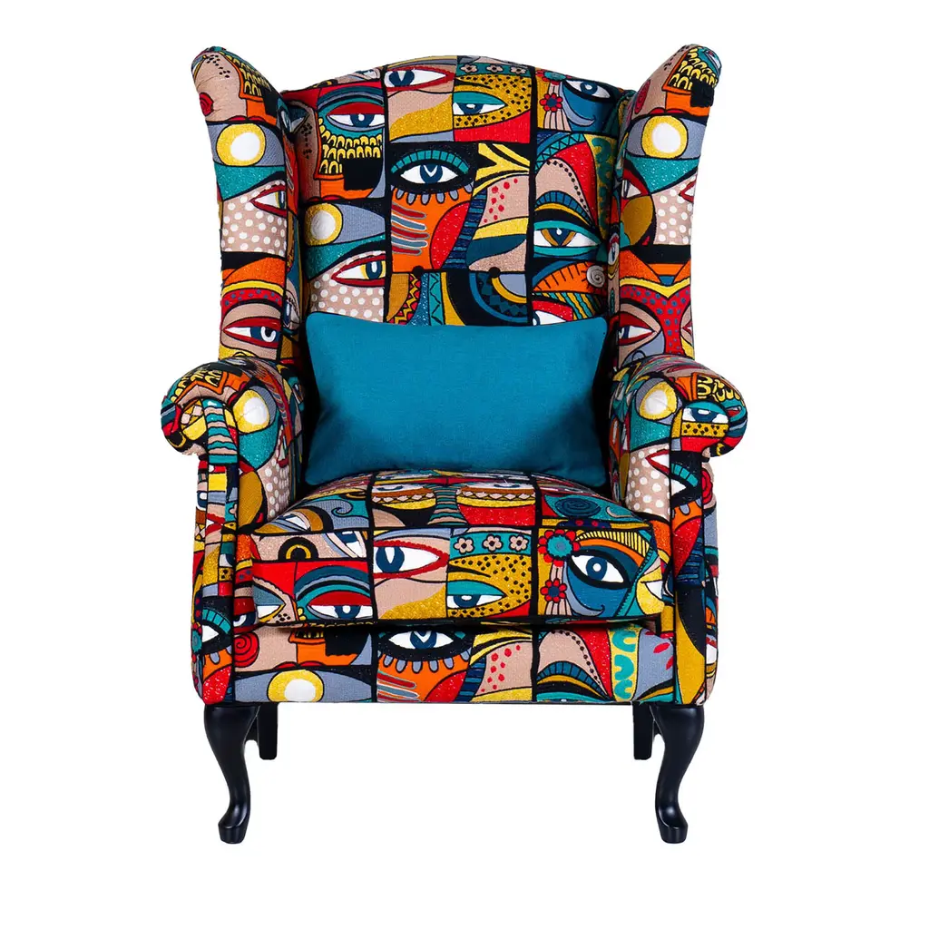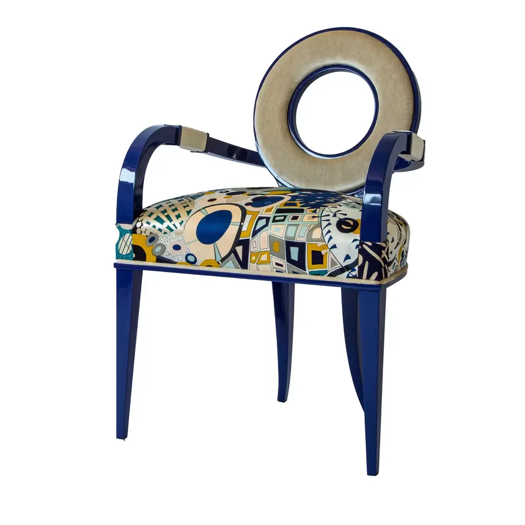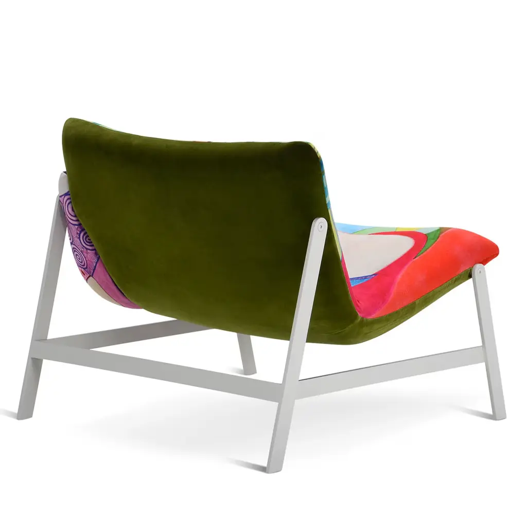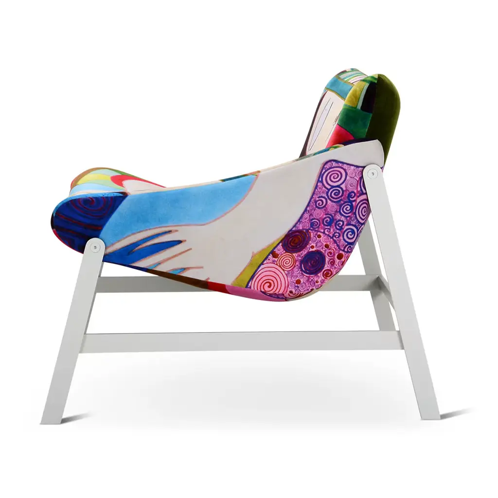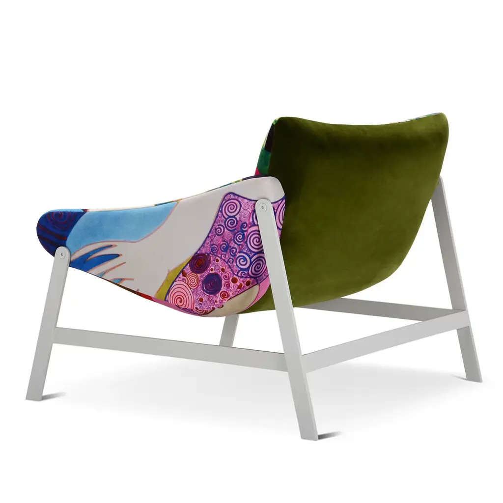 A colorful Picasso-inspired fabric exclusively designed by Le Clochart for Adrenalina lends this lounge chair its exceptional artful personality. The human figure emerging from the cover transforms into friendly company for those sitting down, welcoming with its ample and reclined design. A statement-making piece, the chair comes complete with a luminous white-lacquered metal base.