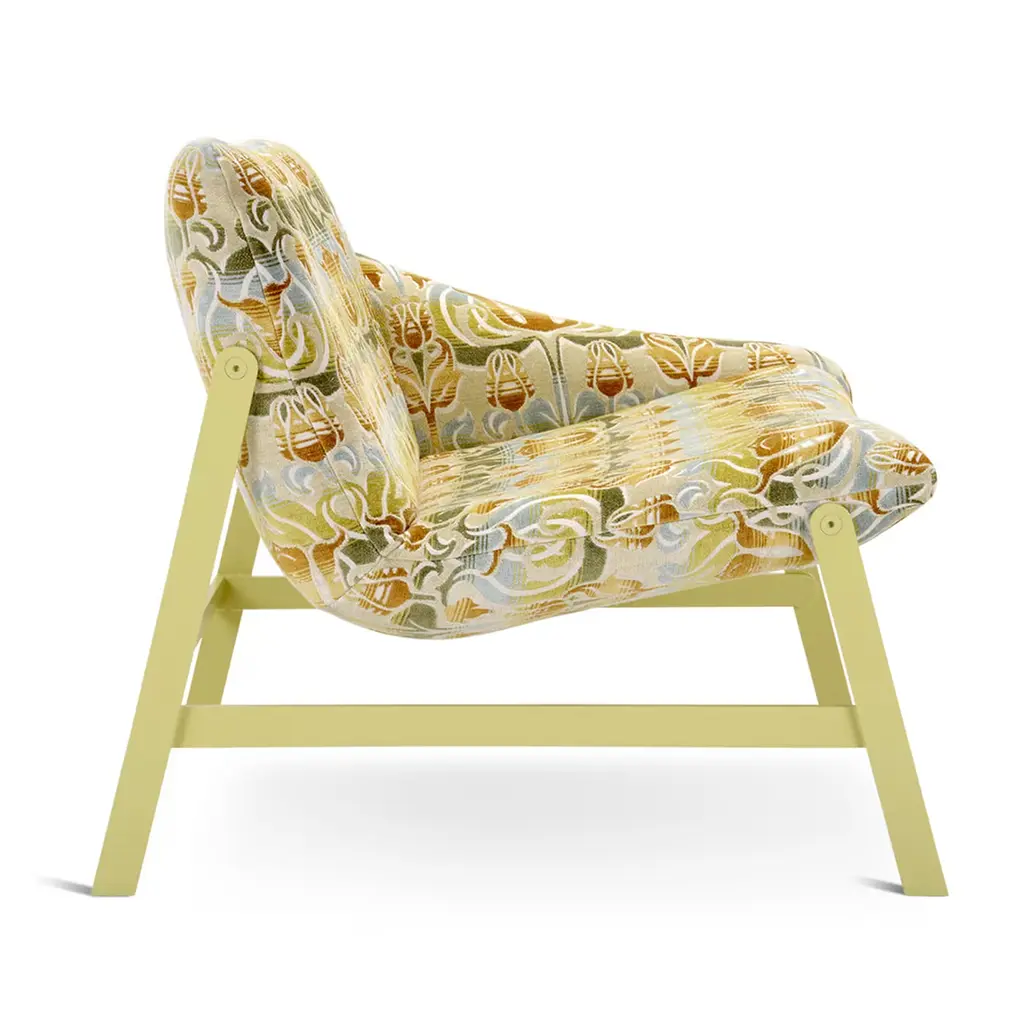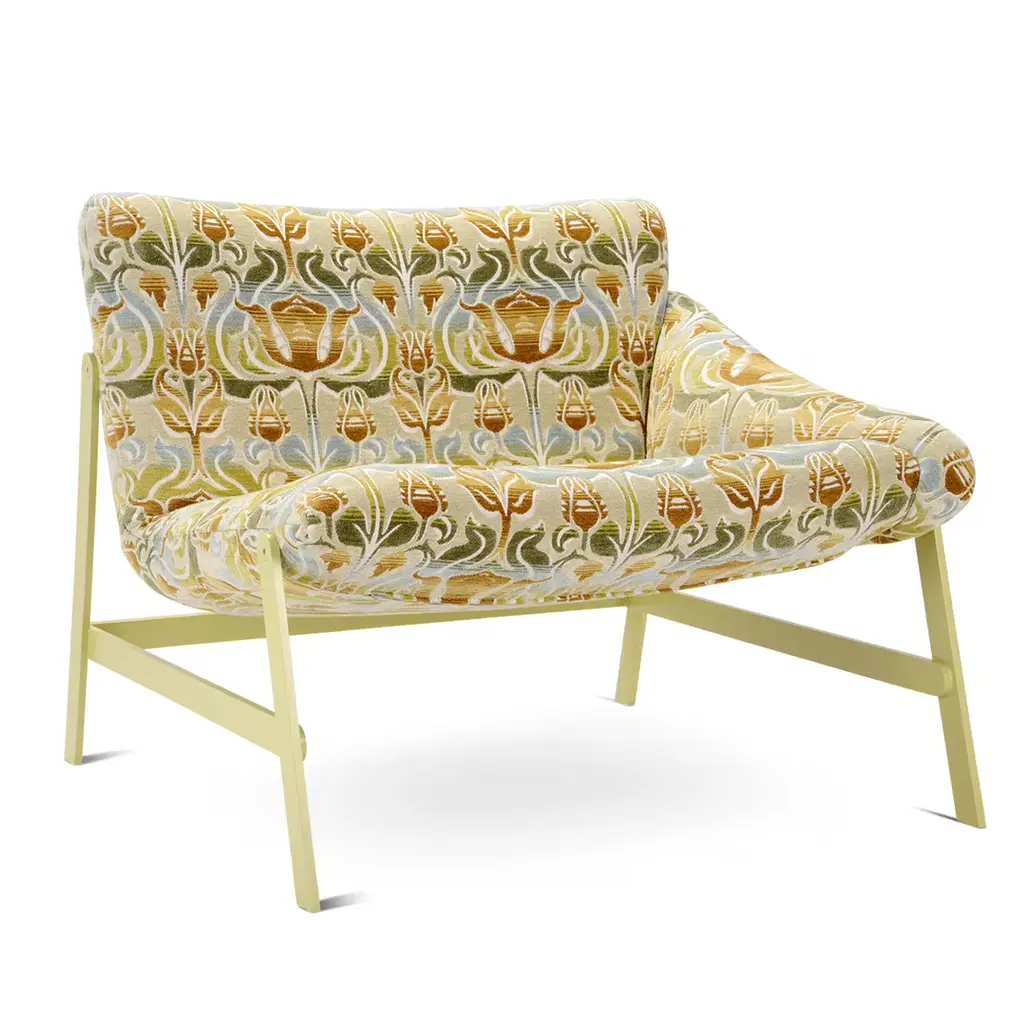 Seductive in its gentle curves and wide, generously stuffed seat (40cm high) with a single sloped armrest on the left side, this chair makes for a clever solution to spend some time leafing through a magazine while enjoying impeccable comfort. The light green tone of the metal base perfectly harmonizes with the earthy tones of the floral patterned upholstery in jacquard velvet.