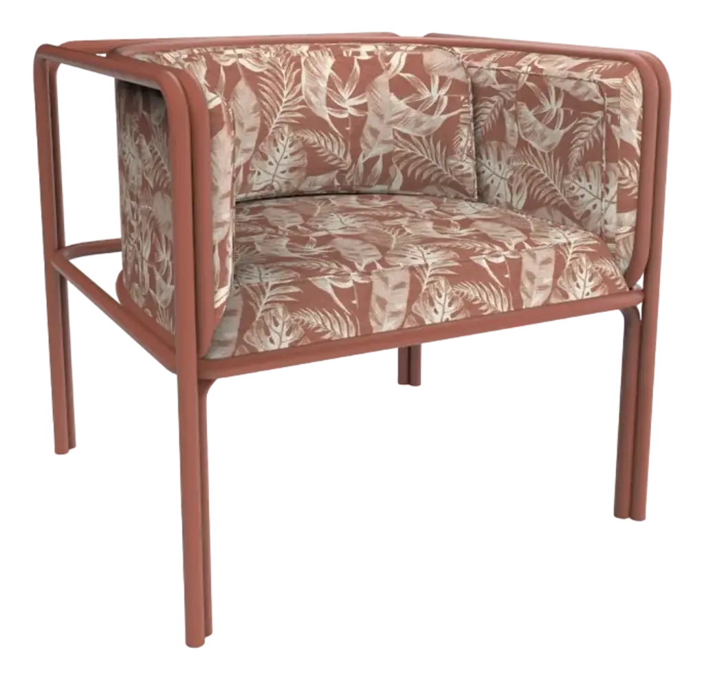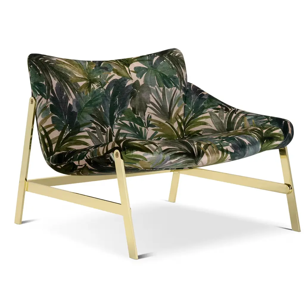 A stylish design ideal for luxe homes, this lounge chair was designed for the Hammock series of chairs distinguished by gentle curve and a single armrest. The dynamic metal base flaunts a glistening golden finish that harmonizes with the warm earthy tones of the tropical motif printed on the viscose fabric upholstery. The seat is 40cm high.