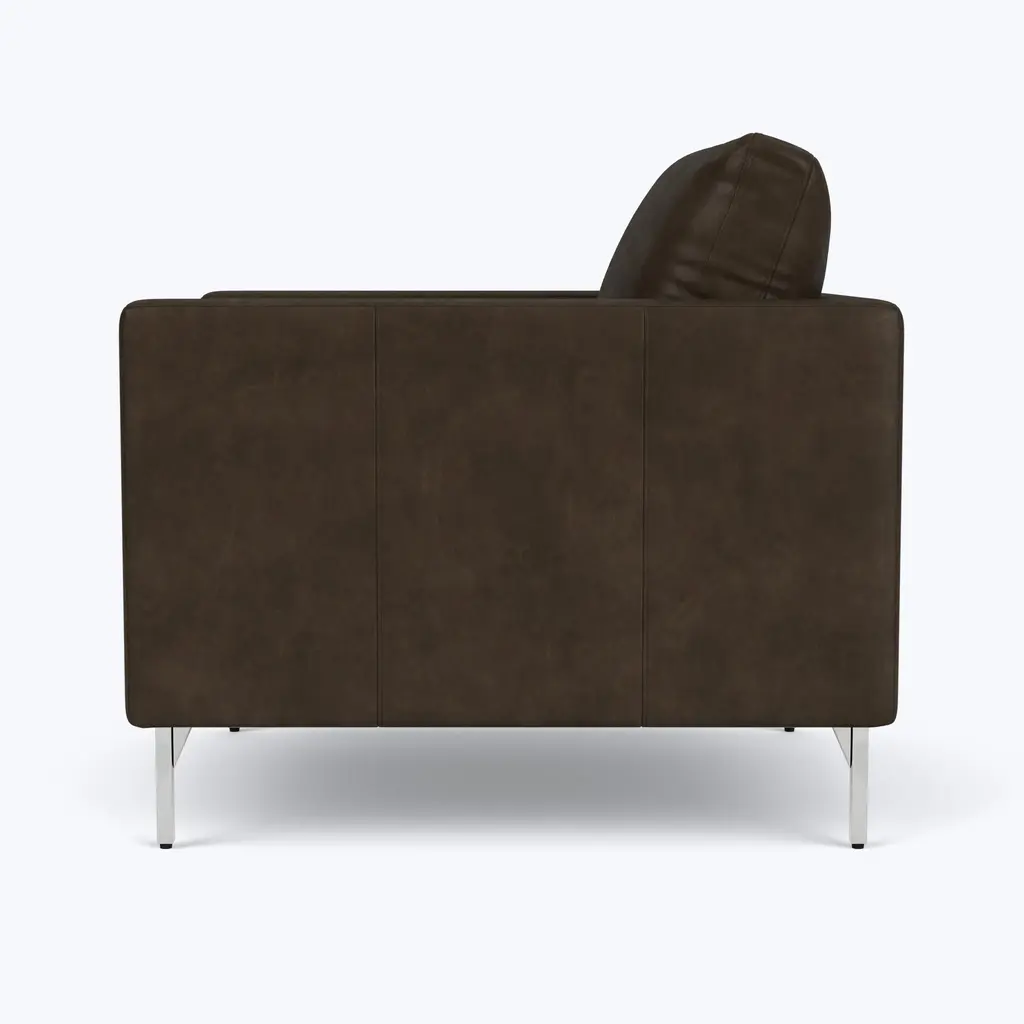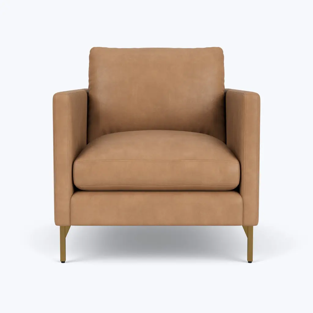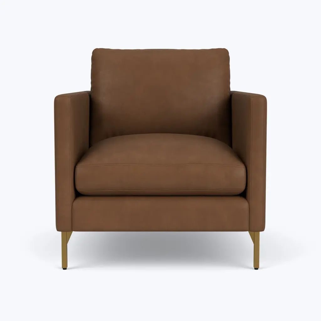 The Hannah Leather Lounge Chair, exclusively from ABC Carpet & Home, embodies the timeless beauty of leather while delivering modern sophistication and comfort. Upholstered in luxurious leather that develops a beautiful patina over time, this chair gains character with use, showcasing natural markings and a soft sheen that enhance its charm. Whether placed in a living room, bedroom, or cozy nook, the Hannah Leather Lounge Chair adds a touch of elegance to any space with its refined design and rich, inviting texture. What sets the Hannah Leather Lounge Chair apart is the unique beauty of its leather upholstery. As the leather ages, it develops a rich patina, gaining softness and depth while highlighting its natural textures and variations. This aging process creates a one-of-a-kind piece that grows more beautiful over time, offering a long-lasting investment in both style and durability. Crafted with a sustainably sourced Goodwood frame, the Hannah Leather Lounge Chair reflects ABC’s commitment to eco-conscious craftsmanship. Its slim track arms and sleek silhouette create a streamlined, contemporary look, while the choice of polished brass or steel legs adds a refined touch. Available in seven premium leather finishes, this chair can be customized to perfectly complement your existing decor, offering both timeless style and luxurious comfort. Designed with comfort in mind, the deep, plush seating makes the Hannah Leather Lounge Chair the perfect spot for relaxing, reading, or entertaining guests. Its elegant design and luxurious leather provide the ideal combination of form and function, making it a versatile addition to any room. Handcrafted to order and delivered to your home within 8-10 weeks, this lounge chair offers a seamless blend of custom design and exceptional craftsmanship. Complete your space by pairing the Hannah Leather Lounge Chair with other pieces from the Hannah Collection, such as the coordinating ottoman or sectional, to create a cohesive and inviting atmosphere. With its modern lines, premium leather, and unparalleled comfort, the Hannah Leather Lounge Chair brings effortless style and lasting elegance to your home.