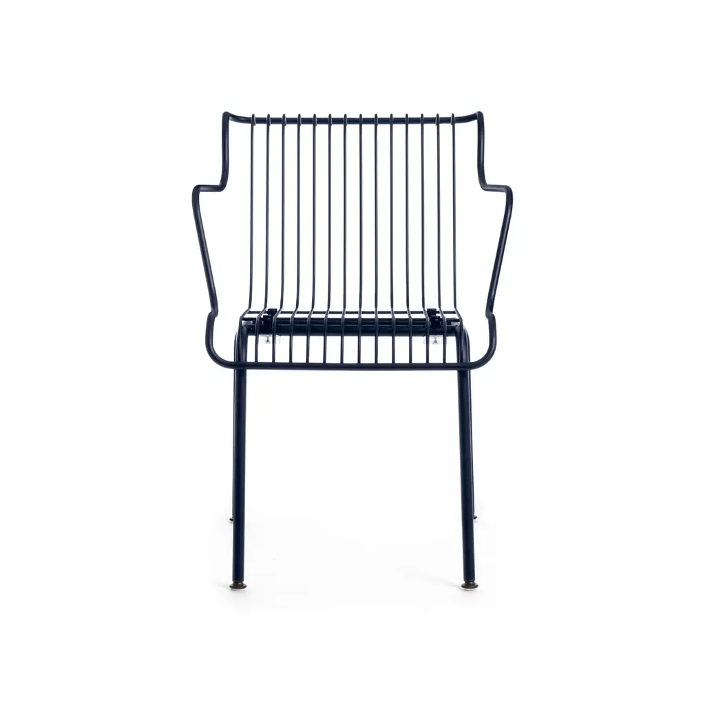 The chair that smiles back. You can't help but grin when you look at or sit on the Hapi Outdoor Chair from Innit Designs. The bright, lively qualities of Mexican craftsmanship are infused in this modern design. There's an openness to the chair that begins with its light, sleek, and durable galvanized steel frame. Using traditional techniques, artisans weave strands of UV-resistant vinyl back and forth to create the stylish pattern of the supportive back and seat rest. Highlighting the fun quality of an Innit Designs piece, a vinyl wrapped contour drapes over the front as a cheeky accent.