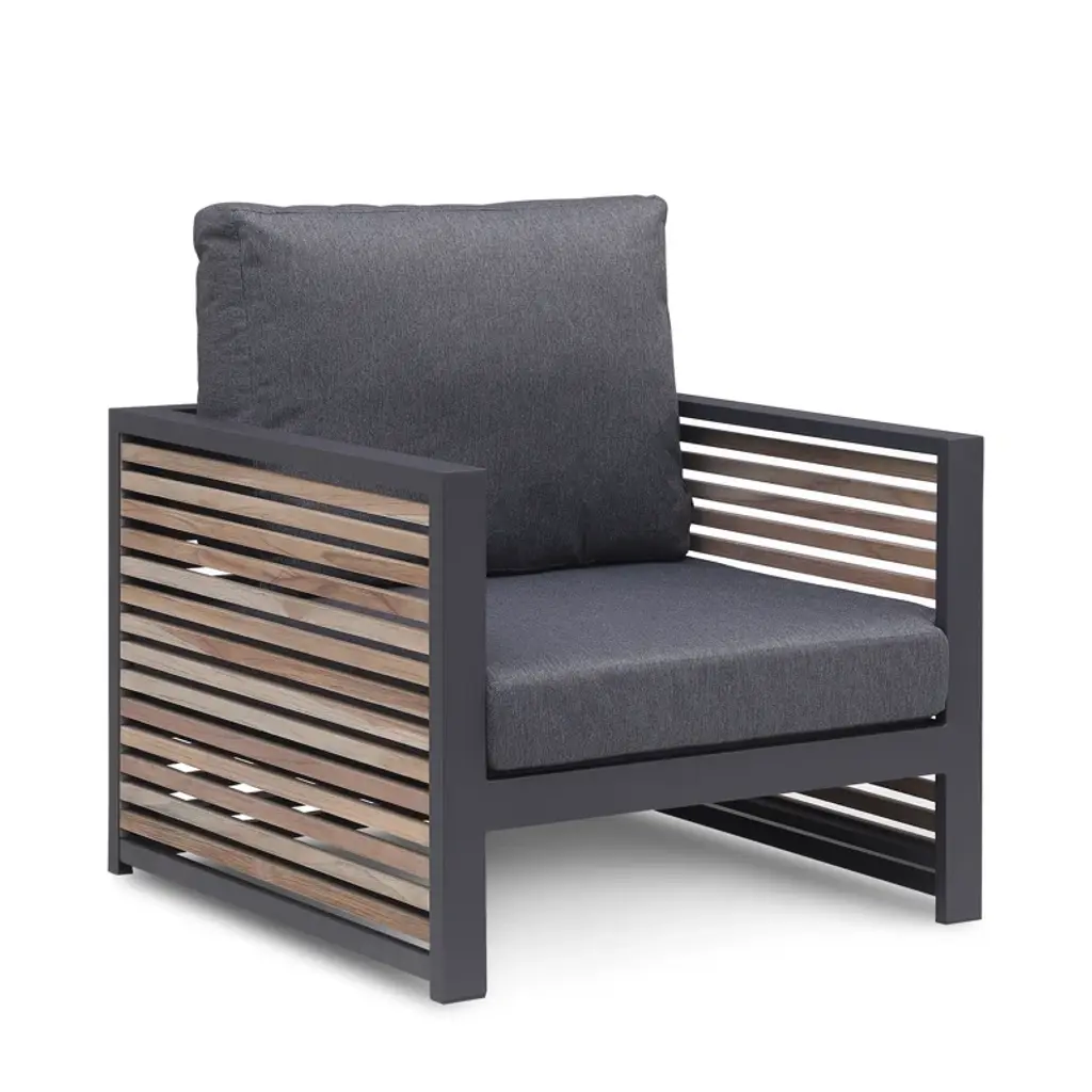 Haringe is a lounge range made in teak. Its frames feature brushed stainless steel or powder coated black, while its outdoor cushions feature buttons and decorative stitching (so they aren't waterproof but they are beautiful). Products with cushions are in Sunbrella fabrics or artificial leather for outdoor use. We have a very simple principle when it comes to compromises. It reads: “No." In the Häringe range this is perhaps fairly obvious, even at a glance. Yes, there are a lot of teak slats to be mounted on the steel frame. It takes time. Loads of it. All teak is A-grade teak from controlled plantations (with a possibility to FSC certify the teak).