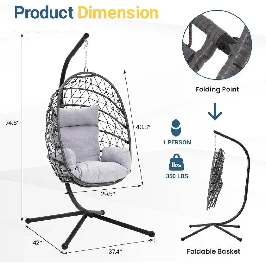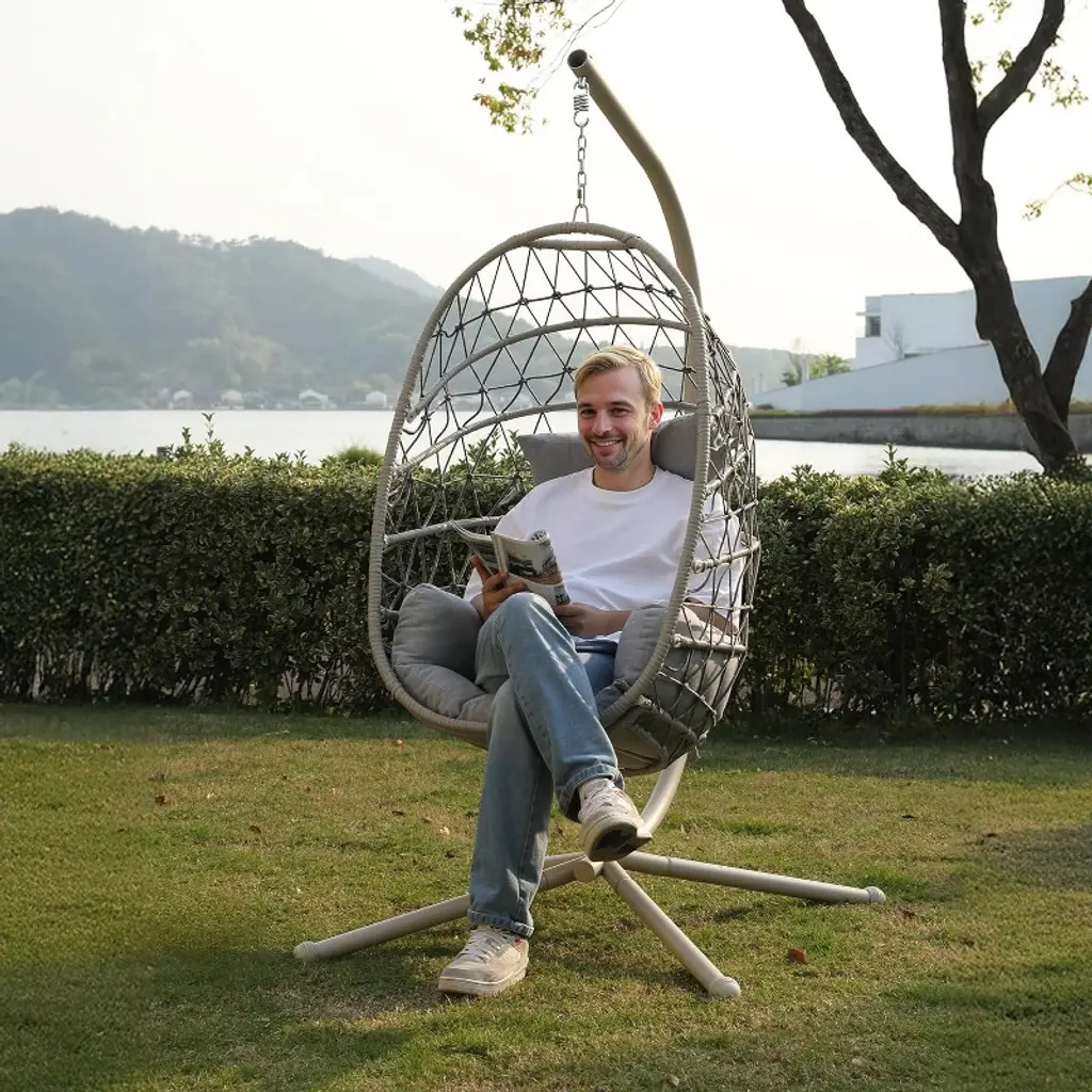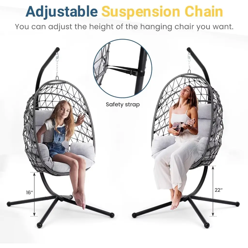 Transform your space into a sanctuary with our elegant hanging egg chair. Crafted with a durable metal frame and wrapped in resilient rattan, this chair is built to last. The stylish beige finish and sturdy triangular base can support up to 350 pounds, ensuring safety and stability. Sink into plush comfort with the thick, soft PP cotton cushion and breathable, water-resistant fabric that keeps you cool and comfortable. Adjustable suspension lets you find your perfect relaxation height, whether indoors or out. Effortlessly assemble and move with the folding design, making it perfect for any setting. Add a touch of charm to your home, patio, or garden while indulging in the ultimate relaxation experience.
