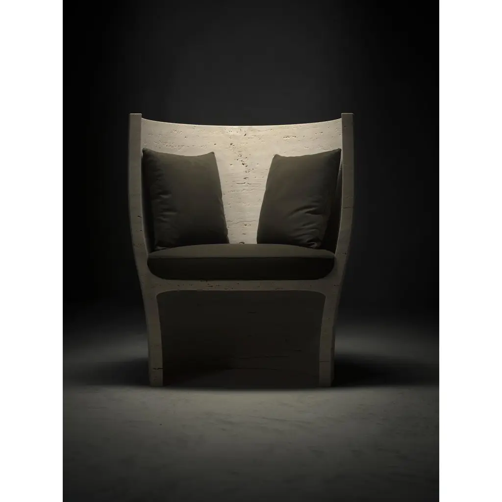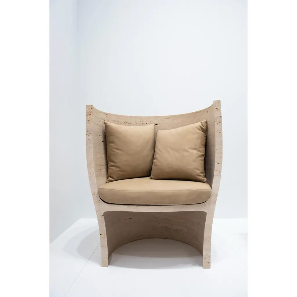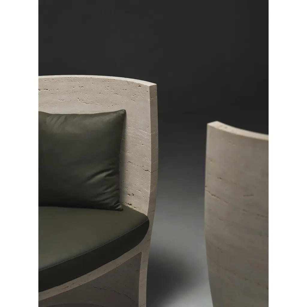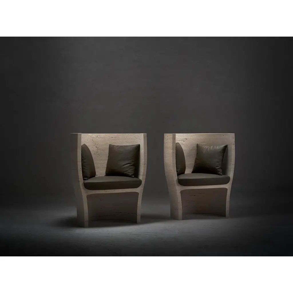 Holly Armchair by Kreoo Designed by Christophe PilletDimensions: D 55 x W 85 x H 102 cm.Materials: Travertino Paglierino and leather.The price is inclusive of leather cushions, collection Linea-Sequoia. Available in different leather and travertine options. Please contact us.By the crafting of marble with sinuous and soft profiles the Holly seating collection is born and designed by Christophe Pillet. It features a bucket-style armchair, whose shell is carved and shaped to become an ergonomic and enveloping cocoon, with a play of curves and different depths. The stone seat surface is complemented by a soft cushion covered in leather or fabric with visible stitching, ideally becoming a line of symmetry: it is the only solid horizontal element that punctuates two voids, the upper and the lower. The base continues the elegantly curved silhouette of the armchair and contributes to outlining the monolithic image of the product, perfect for indoor and outdoor use and customizable in Travertine, Calacatta Arabescato, Nero Marquina, Verde Imperiale, or Bianco Carrara.Kreoo: the new marble experienceKreoo links its name to the best Italian tradition in marble manufacturing and brings to new light the primordial charm of a material that has witnessed the evolution of civilizations and cultures.From the bathroom and living room to coverings, home accessories, and lamps, the company works with natural stone in various forms and aesthetic compositions, enriching it with other materials such as metals, wood, and glass. The result is a fascinating and chromatic language, suitable both indoors and outdoors. Expressed in contemporary but still customizable designs, Kreoo highlights workmanship know-how and excellence.The brand, born in 2010 by the experience of Decormarmi and its worldwide distribution strength, has led to major international projects, especially in hospitality and luxury residential.