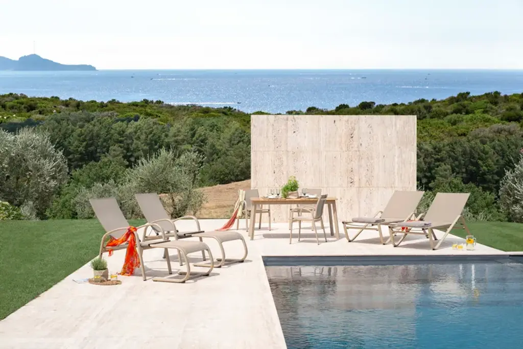 Holly is a stackable easy chair made of aluminium, steel and EMU-Text, a type of synthetic fabric.The Holly collection consists of: a small armchair, a relaxing lounge chair, foot stool, sun lounger and low table. Up to 8 sun loungers with retractable wheels can be stacked together. A long, S-shaped, extruded profile forms the legs and arms. The fabric wraps around and covers the side sections of the bed and back. An optional sunshade can be attached to the back and the sun lounger also comes complete with a small, two-tiered, flat, sheet-metal table. The aluminium structure ensures the product is weather, humidity and salt water resistant. The Holly armchair and chair can both be stacked. They have an aluminium and stainless steel structure, whereas the EMU-Tex seat and back are designed to be easily replaceable. A comfortable aluminium and EMU-Tex footrest also fits the little armchair and lounge chair.Colours 23 – White Grey 300/65 23 – White 300/52 23 - Ultramarine Blue 300/56 71 – Hazel 300/86 22 – Hazel 300/86 41 – Hazel 300/86 24 – Black 300/95