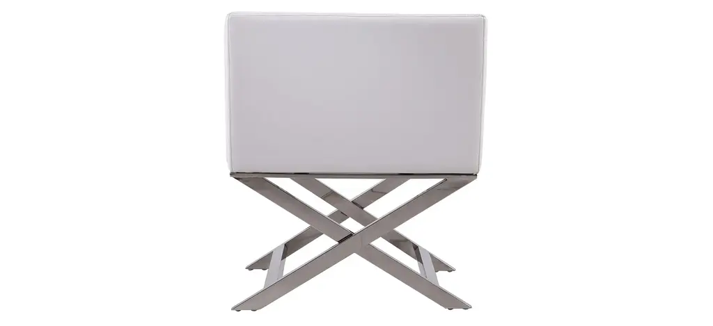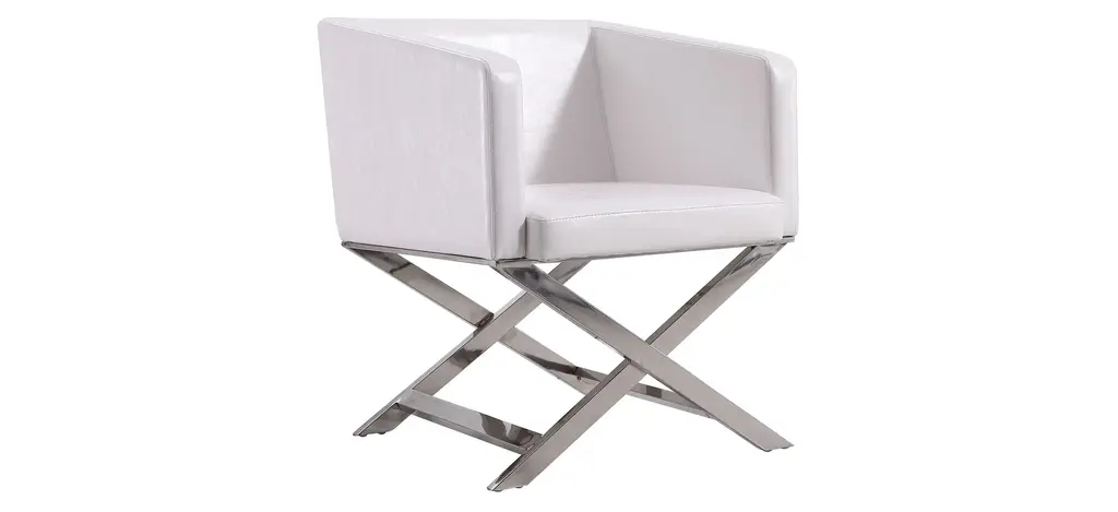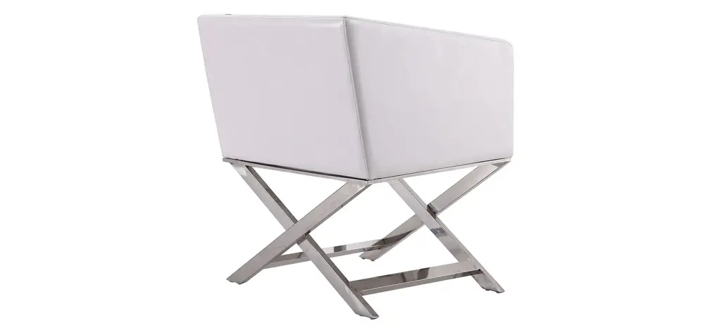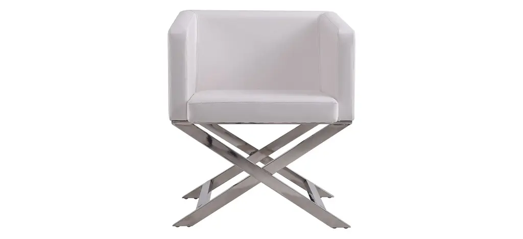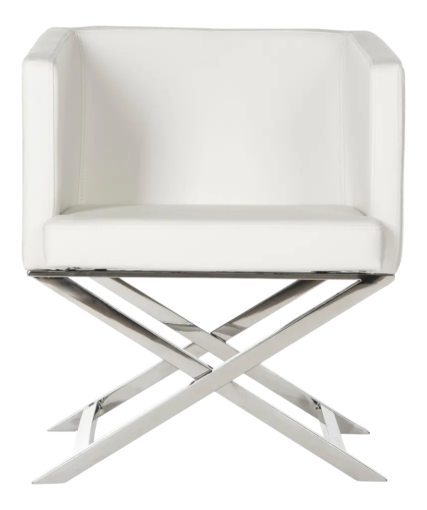 The iconic director's Hollywood chairs silhouette is reimagined in this confident contemporary accent chair. Classic folding legs are replaced with welded chrome-finished metal, while the casual low-back seat takes on tight tailoring and structured lines, transforming it into something decidedly sophisticated. Deep cushioning promises comfort with the inviting, slightly textured supple Faux Leather. Its generous seat and angled armrests give you plenty of room to lounge with a martini and great conversation.