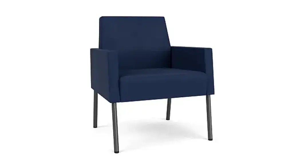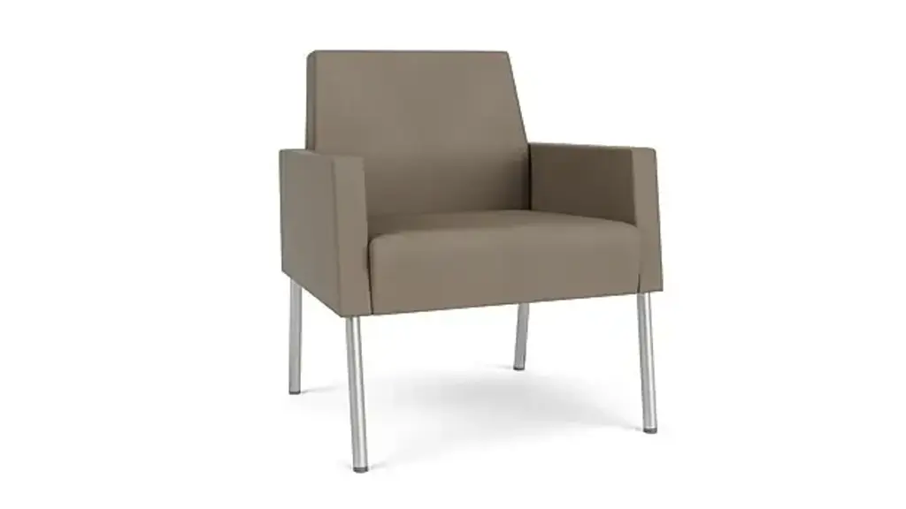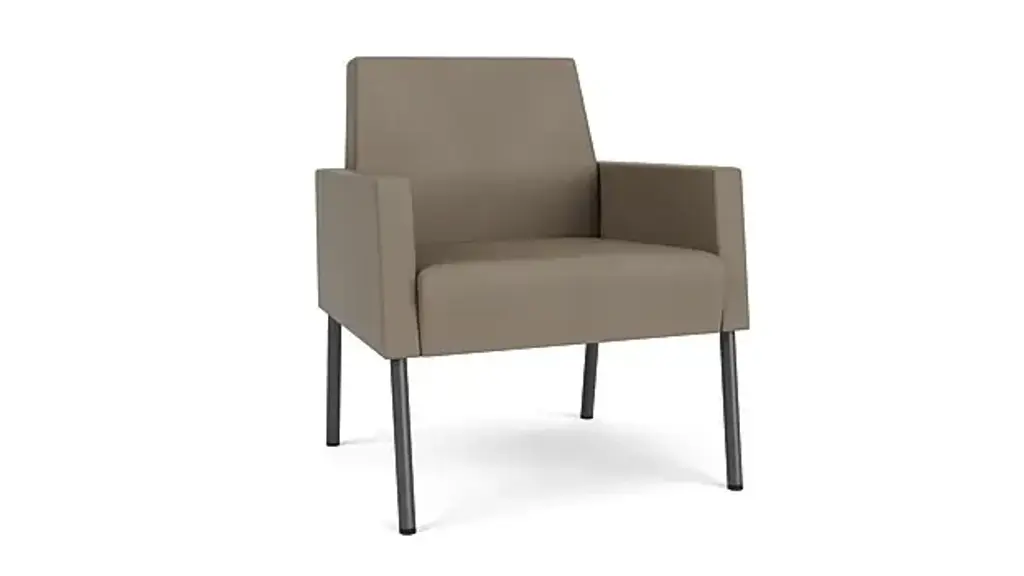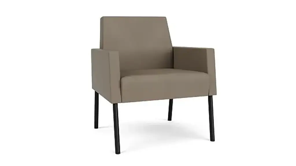 The Mystic Lounge guest chair with its sophisticated, tailored look, offers the ideal balance of style, function, and value for reception areas, home office and lounge seating applications. Heavy-duty construction with comfortable polyurethane upholstered cushions and steel legs. Seat features environmentally friendly, durable and comfortable 2.6 density soy based foam, and a Matrex seat support system for long-life sitting comfort. Fully Upholstered panel arms and refined tapered back. Wall-saver design to prevent marks and damage to walls. Designed for high-use reception, lounge and pull-up applications. Steel frame is easy to clean and can withstand years of harsh cleansers. Ships ready for easy assembly.